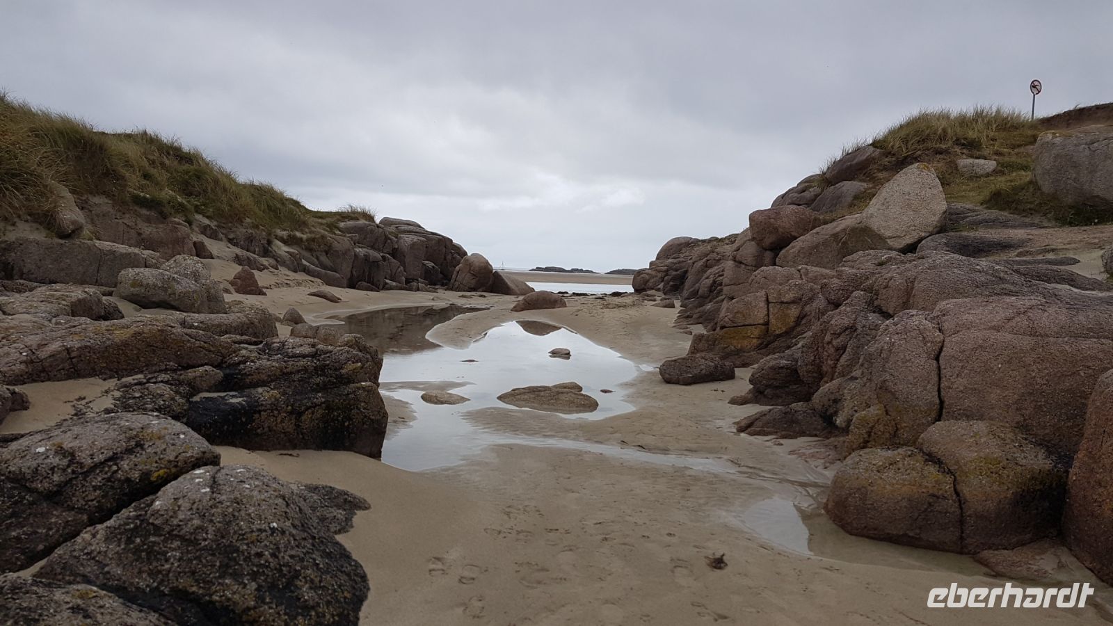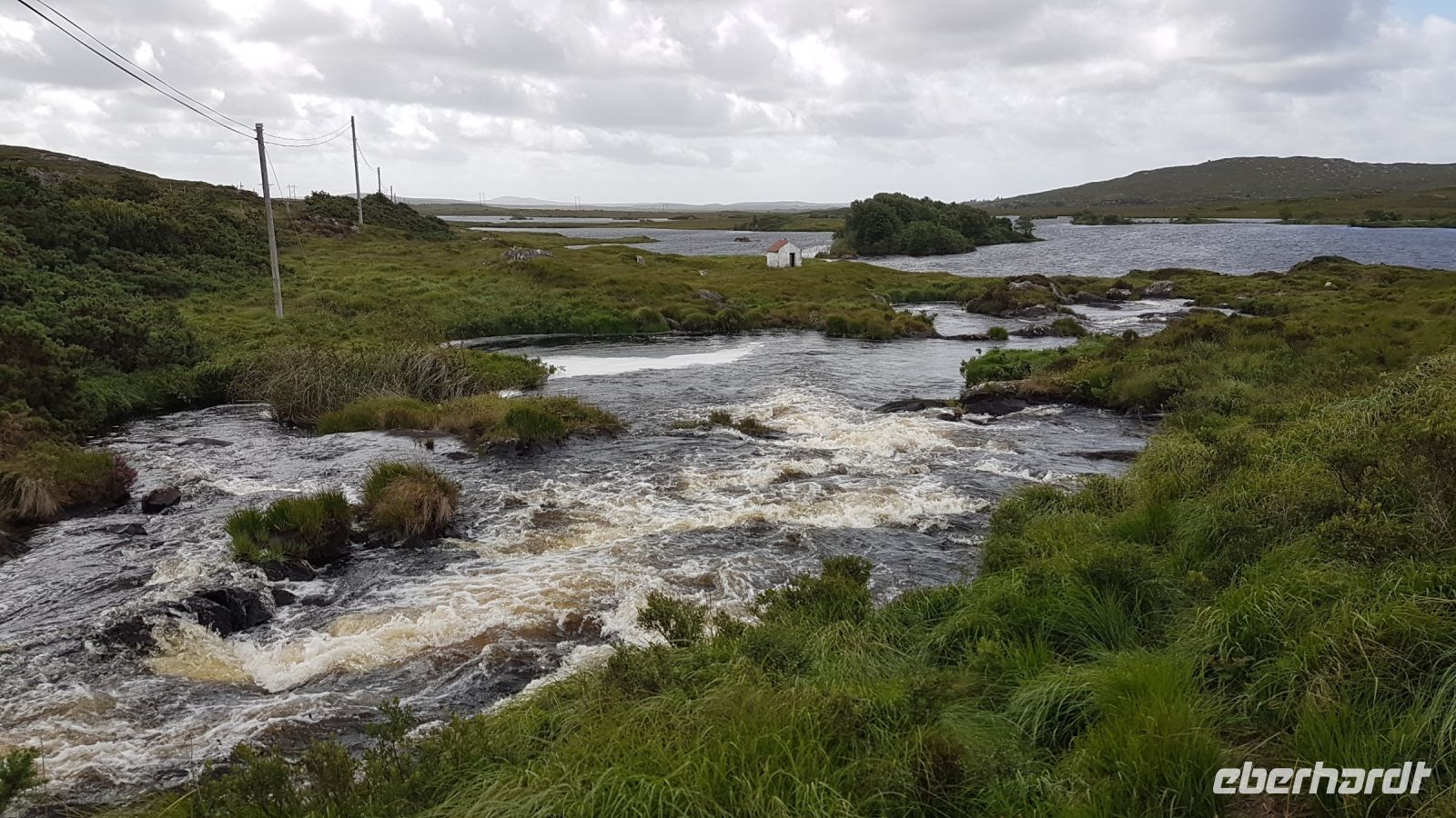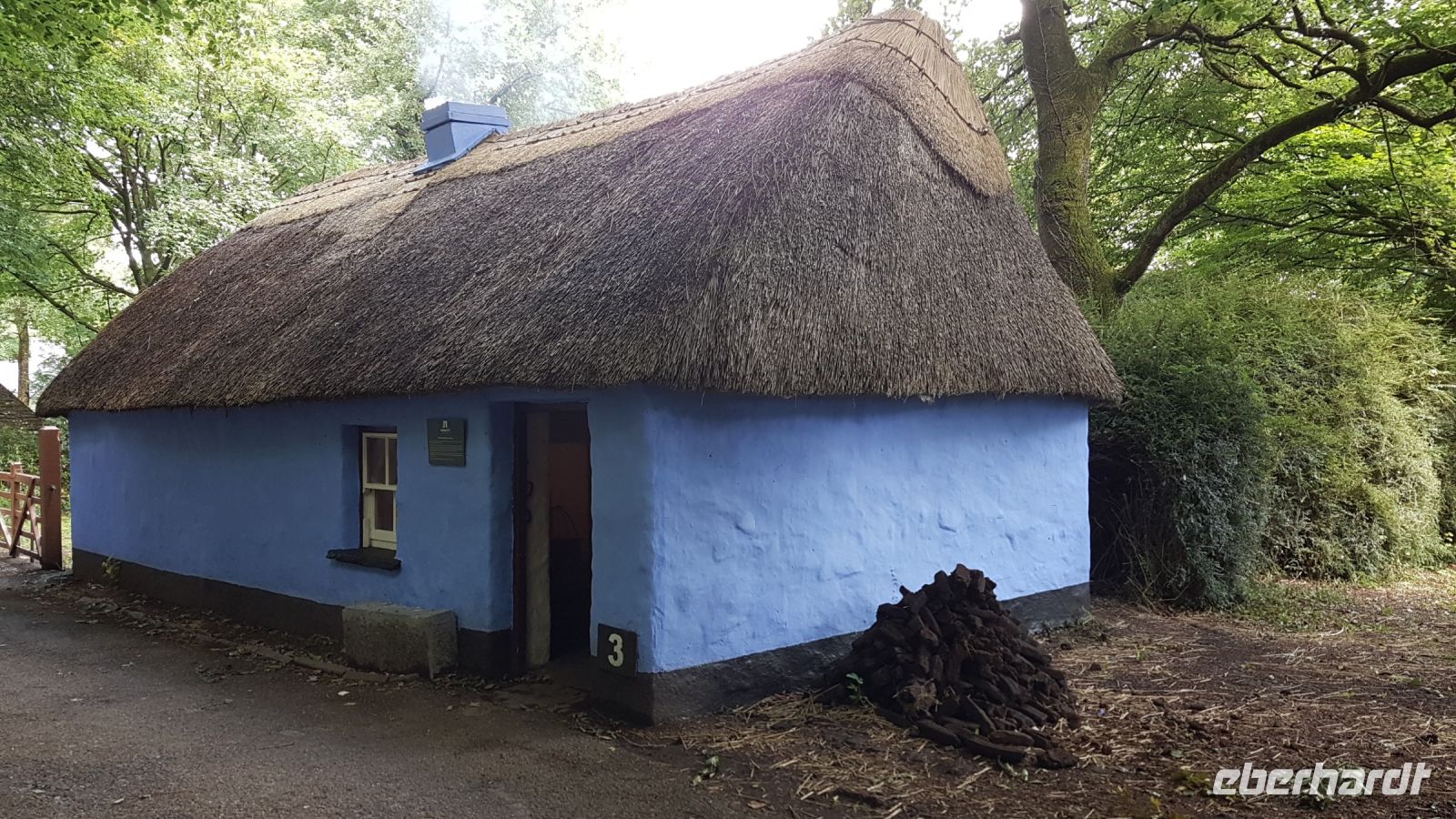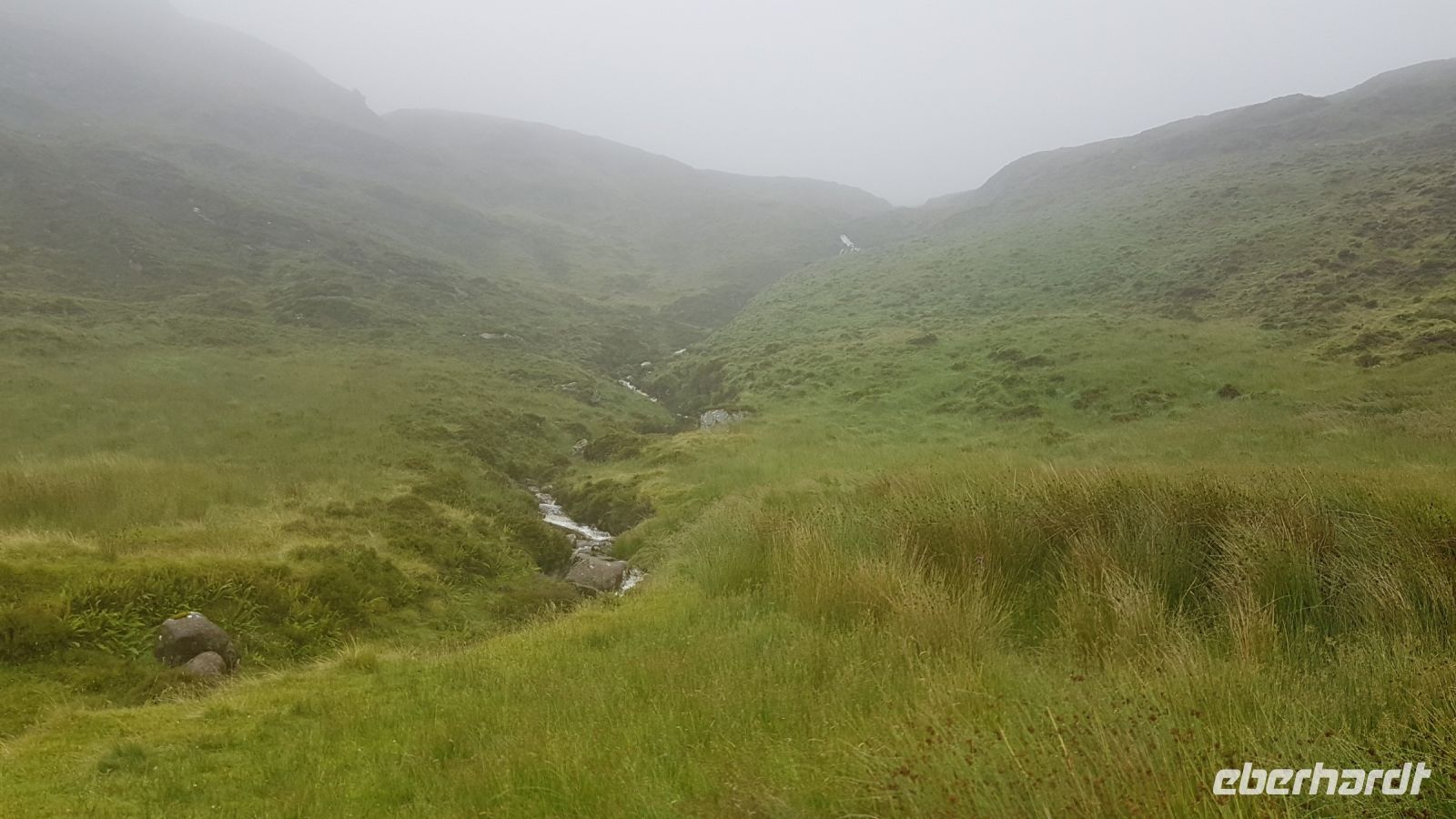 Bei Regenwetter brachen wir auf, um recht bald Achill Island zu erreichen, die größte Insel der Republik Irland. In Keel stiegen wir aus am Beehave Cafe, um dem Regen zu entkommen. Leider riss der Himmel erst am späten Nachmittag auf und der Regen begleitete uns den ganzen Tag über, so dass wir nur kurz den breiten Strand von Keel besuchen konnten. Als wir Keel verlassen wollten, mussten wir feststellen, dass unser Bus nicht mehr anspringen wollte. Nach einiger Wartezeit kam ein Mechaniker von einer lokalen Werkstatt und gab uns erst einmal Anlasshilfe. Unterwegs machten wir weitere Stops für Fotos und besuchten das Ballycroy Nationalparkzentrum. Hier erfuhren wir viele interessante Details zum Hochmoor hier, das zu den wenigen erhaltenen in Europa zählt. Auf dem Weg zum Hotel wurde unser Bus in Bangor für eine genauere Untersuchung in einer Werkstatt vorgestellt, wir besuchten während dessen den lokalen Pub The West End Bar, tranken das ein oder andere Guinness oder Tee mit Rum. Den restlichen Nachmittag hatten wir Freizeit, von unserem Broadhaven Hotel aus konnten wir einen Spaziergang zum kleinen Ortszentrum von Belmullet unternehmen oder eine lokale Besonderheit besichtigen: einen Tide-Pool direkt am Ufer des Atlantik. Den Abend verbrachten wir wieder bei einem gemeinsamen Abendessen in unserem Hotel.