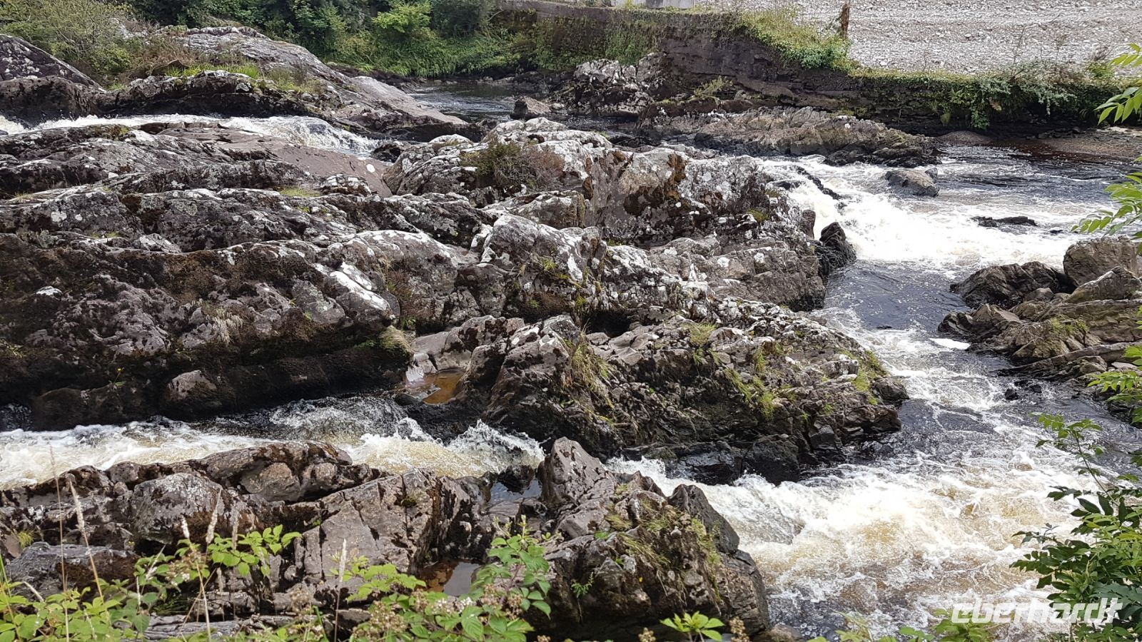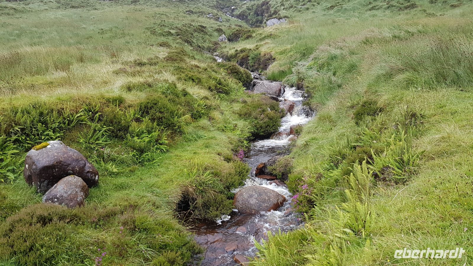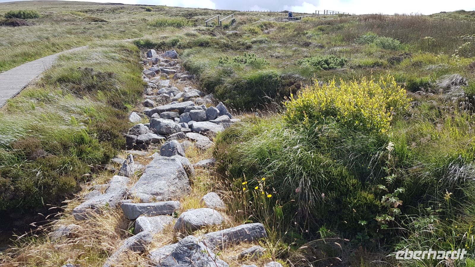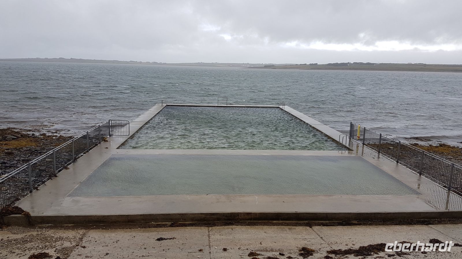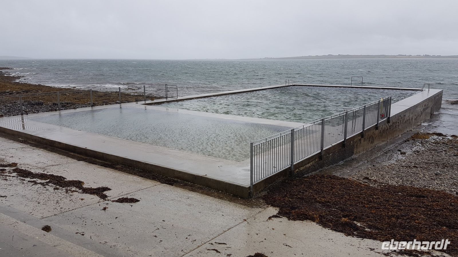 Bei Regenwetter brachen wir auf, um recht bald Achill Island zu erreichen, die größte Insel der Republik Irland. In Keel stiegen wir aus am Beehave Cafe, um dem Regen zu entkommen. Leider riss der Himmel erst am späten Nachmittag auf und der Regen begleitete uns den ganzen Tag über, so dass wir nur kurz den breiten Strand von Keel besuchen konnten. Als wir Keel verlassen wollten, mussten wir feststellen, dass unser Bus nicht mehr anspringen wollte. Nach einiger Wartezeit kam ein Mechaniker von einer lokalen Werkstatt und gab uns erst einmal Anlasshilfe. Unterwegs machten wir weitere Stops für Fotos und besuchten das Ballycroy Nationalparkzentrum. Hier erfuhren wir viele interessante Details zum Hochmoor hier, das zu den wenigen erhaltenen in Europa zählt. Auf dem Weg zum Hotel wurde unser Bus in Bangor für eine genauere Untersuchung in einer Werkstatt vorgestellt, wir besuchten während dessen den lokalen Pub The West End Bar, tranken das ein oder andere Guinness oder Tee mit Rum. Den restlichen Nachmittag hatten wir Freizeit, von unserem Broadhaven Hotel aus konnten wir einen Spaziergang zum kleinen Ortszentrum von Belmullet unternehmen oder eine lokale Besonderheit besichtigen: einen Tide-Pool direkt am Ufer des Atlantik. Den Abend verbrachten wir wieder bei einem gemeinsamen Abendessen in unserem Hotel.
