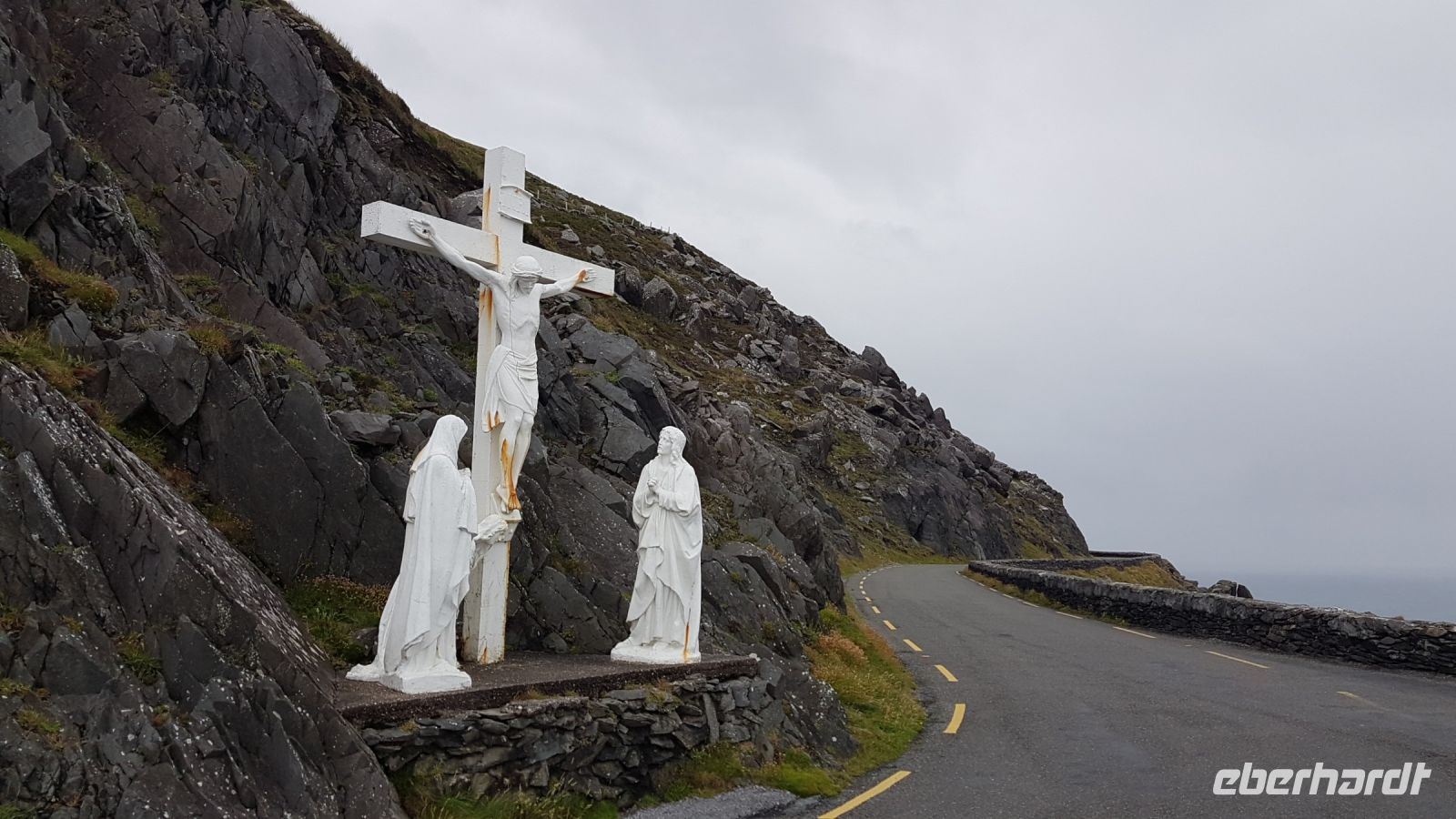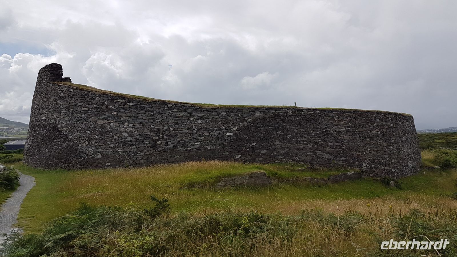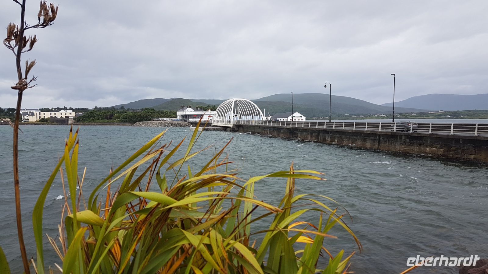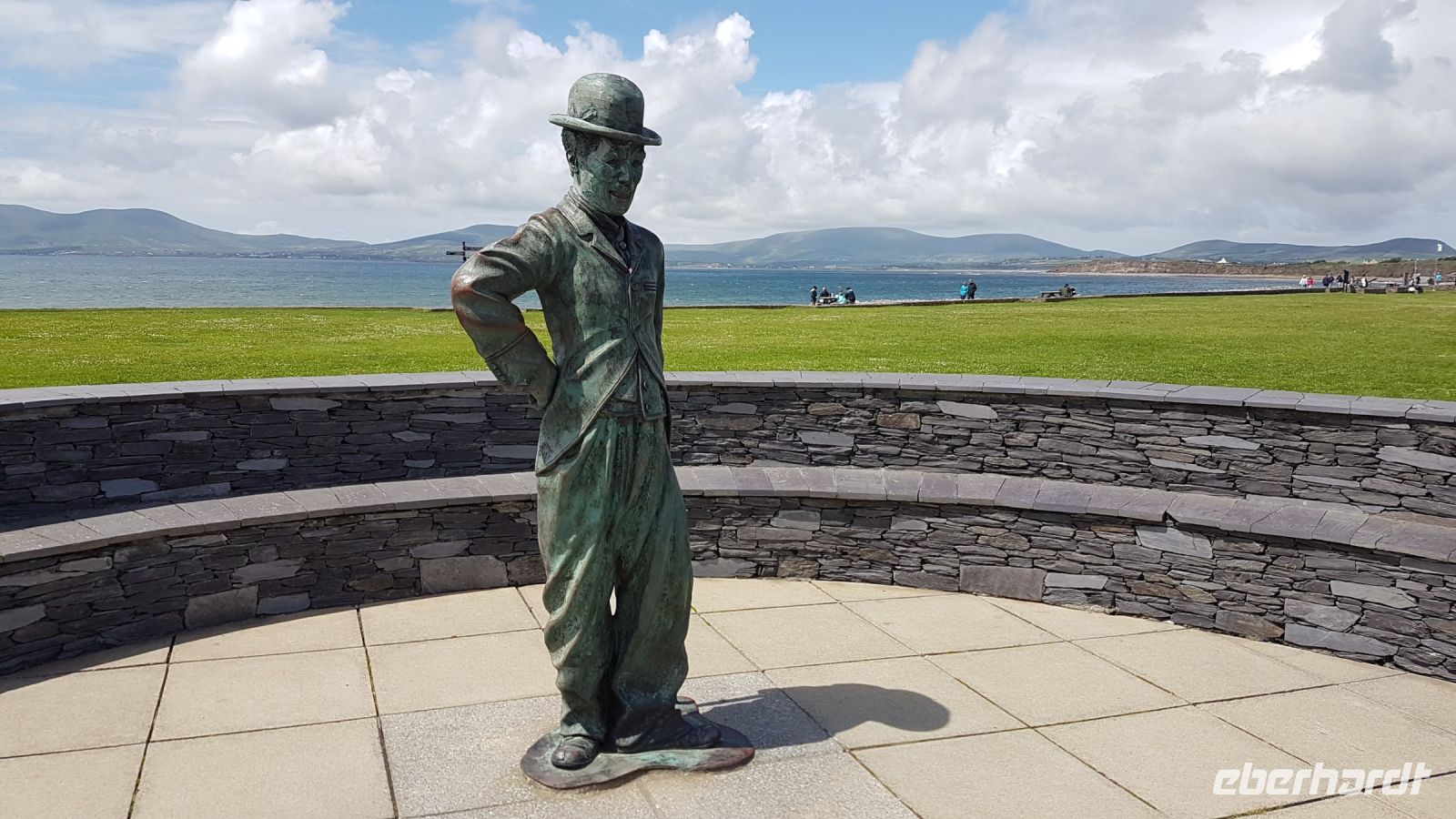 Heute stand der berühmte Ring of Kerry auf unserem Programm. Bei wechselhaftem und trockenem Wetter konnten wir diese traumhafte Küstenstraße genießen. Mehrmals hielten wir an für Fotos von der atemberaubenden Landschaft. Von Gletschern geformte Berge lösen sich ab mit Tälern, Seen, malerischen Buchten, breiten Stränden und dem Blick auf den Atlantik. Der erste Programmpunkt heute war der Besuch der Kells Schaffarm. Bei einer Vorführung demonstrierte uns der Schäfer Thomas, wie ein Bordercollie eine Gruppe Schafe in die gewünschte Richtung treiben kann. Wir erfuhren viele interessante Details aus seiner Arbeit. Danach fuhren wir zum Cahergall Stonefort, ein restauriertes Ringfort, das bereits in der Eisenzeit hier gebaut worden ist. Es hat einen Durchmesser von 25 Metern und bis zu 5 Meter dicke Mauern. Wir konnten hinaufklettern auf die Außenmauer und einen herrlichen Ausblick in die Landschaft genießen. Im nahegelegenen Städtchen Cahersiveen verbrachten wir unsere Mittagspause. Am Nachmittag statteten wir dem berühmten Charlie Chaplin einen Besuch ab. In Waterville steht seine Statue, mit der wir uns gern fotografieren ließen. Er ist hier in guter Erinnerung, oft verbrachte er in Waterville erholsame Tage. Auf unserem weiteren Weg entlang des Rings of Kerry genossen wir den ein oder anderen wunderbaren Blick über eine Bucht im Atlantik. Unsere Kaffeepause verbrachten wir in Sneem. Das ist ein farbenfroh gestaltetes Dorf mit zahlreichen hübschen Geschäften und Cafés. Der Ort ist zweigeteilt durch einen Fluss, über den eine schöne alte Steinbrücke führt. Beim letzten Fotostop am Ladies View hatten wir einen herrlichen Ausblick auf die Seen im Killarney Nationalpark. In diesem Park befinden sich zahlreiche alte Eichenbäume. Den Abend verbrachten wir wieder im Brandon Hotel Tralee.