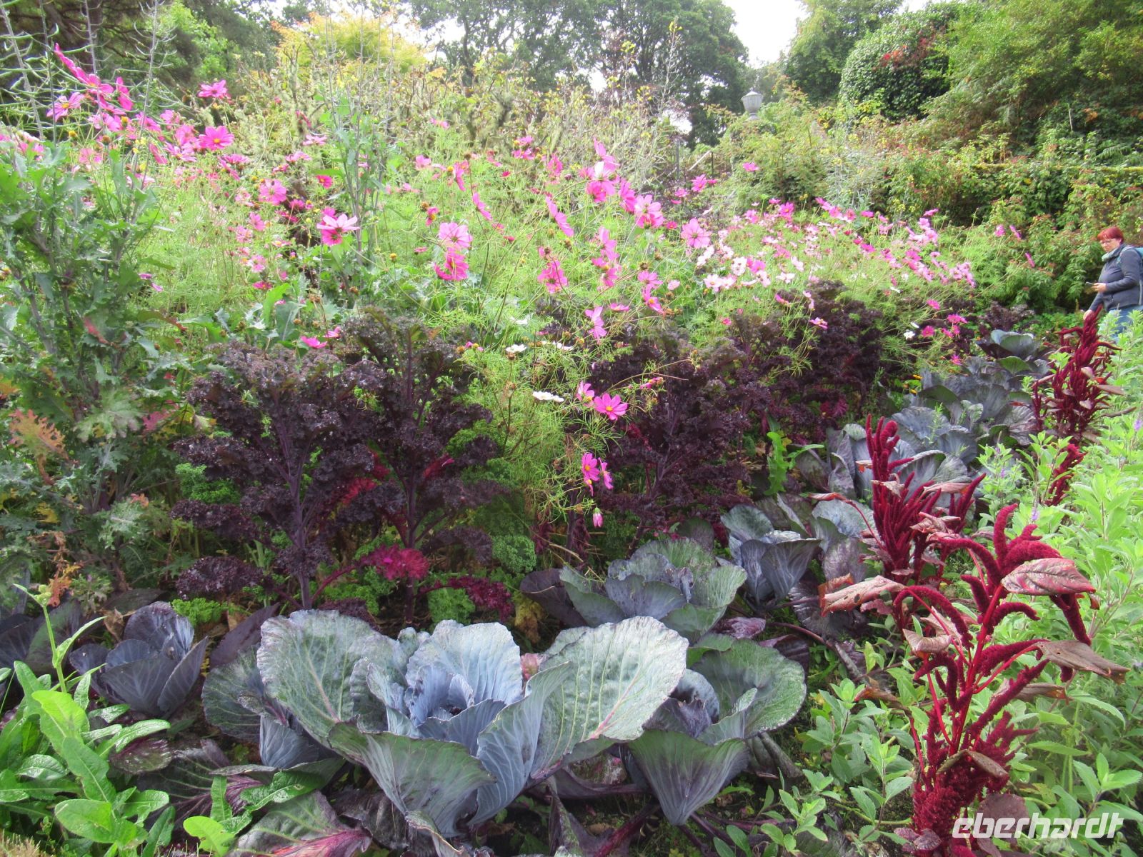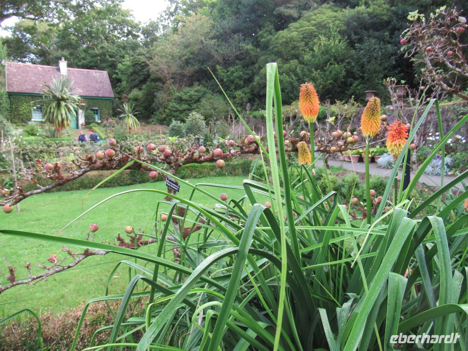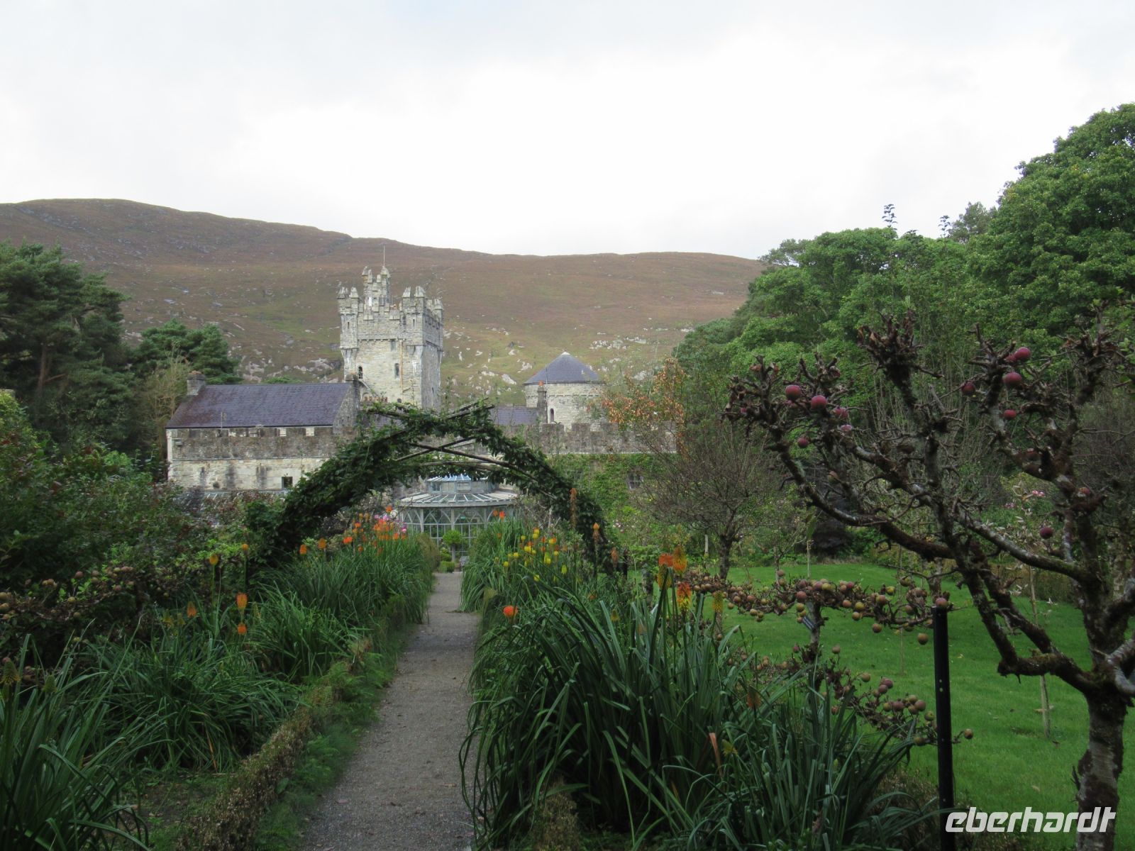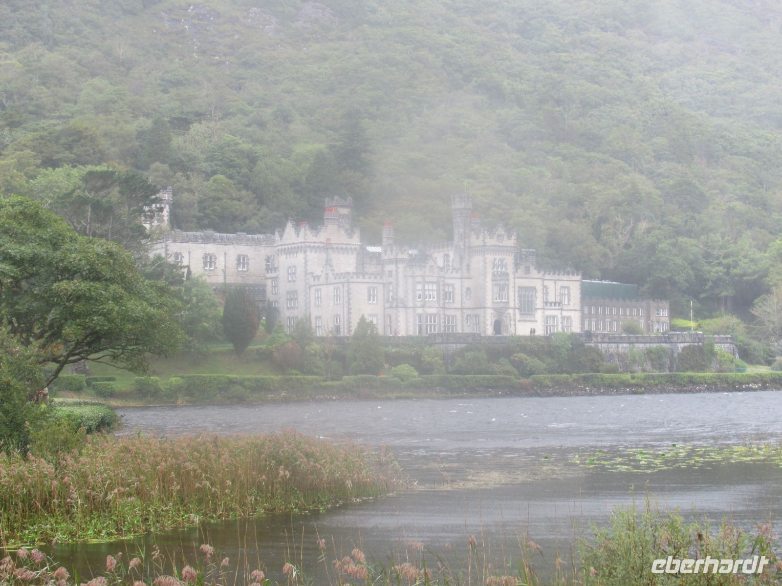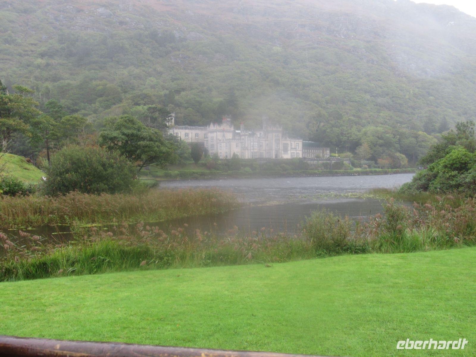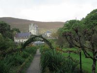 romantisch an einem See gelegenes Schlößchen: die Kylemore-Abbey.Mit dem Schlößchen, der Kirche und den Mauergärten ist es ein Kleinod,das zu einem ausgiebigen Besuch einlädt. Wir hatten leider das Pech, dass ausgerechnet hier ein extrem starker und stürmischer Regen vom Himmel tobte! Dennoch haben wir alles gesehen: Ein Tourist in Irland läßt sich doch nicht vom Wetter beeindrucken1Auf der Fahrt an der Südküste des Connemara sahen wir von Steinmauern begrenzte - zum Teil sehr kleine- Weideflächen und typische Cottages.