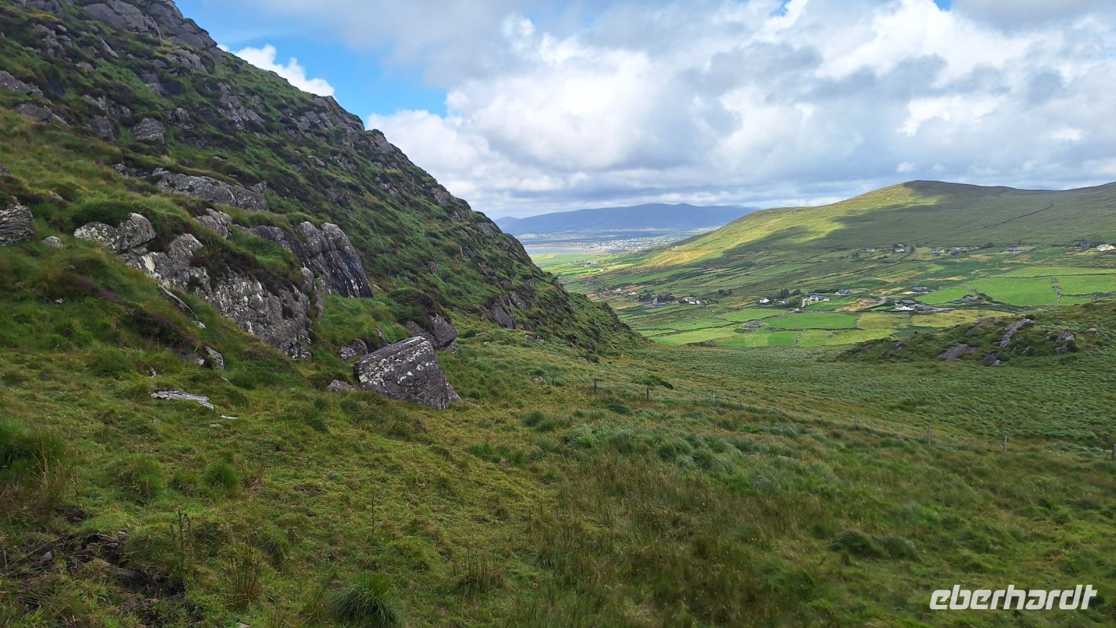 Anschließend geht es dann wieder bergan zum 210 Meter hohen Coomakesta Pass, der höchsten Stelle des Ring of Kerry. Von hier hat man eine fantastisch klare Sicht auf die Ballinskelligs Bay und die Bucht des Kenmare Rivers. Was für ein Glück wir heute haben!