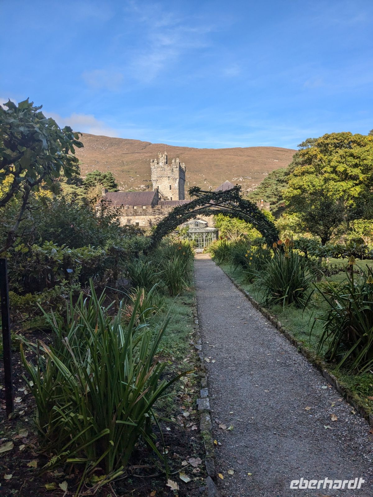 Am Vormittag besuchten wir den Glenveagh Nationalpark, der sich über beeindruckende 170 Quadratkilometer erstreckt und für seine unberührte Natur berühmt ist. Dieser zweitgrößte Nationalpark Irlands bot uns die Möglichkeit, tief in die wilde Schönheit Donegals einzutauchen. Zwischen Moorlandschaften, Wäldern und Seen erlebten wir eine malerische Szenerie, die uns immer wieder in Staunen versetzte. Besonders faszinierend war der Besuch des Glenveagh Castle, das im 19. Jahrhundert am Ufer des Lough Beagh erbaut wurde. Die einstige Residenz des wohlhabenden Landbesitzers John George Adair beeindruckt mit ihrer historischen Pracht und wird von traumhaften Gärten umgeben, in denen exotische Pflanzen und bunte Blumen inmitten der irischen Wildnis gedeihen. Beim Spaziergang durch die Gärten und entlang des Sees boten sich uns immer wieder atemberaubende Ausblicke auf die umliegenden Berge und die weite, friedliche Landschaft – ein wahrer Ort der Ruhe und Inspiration.