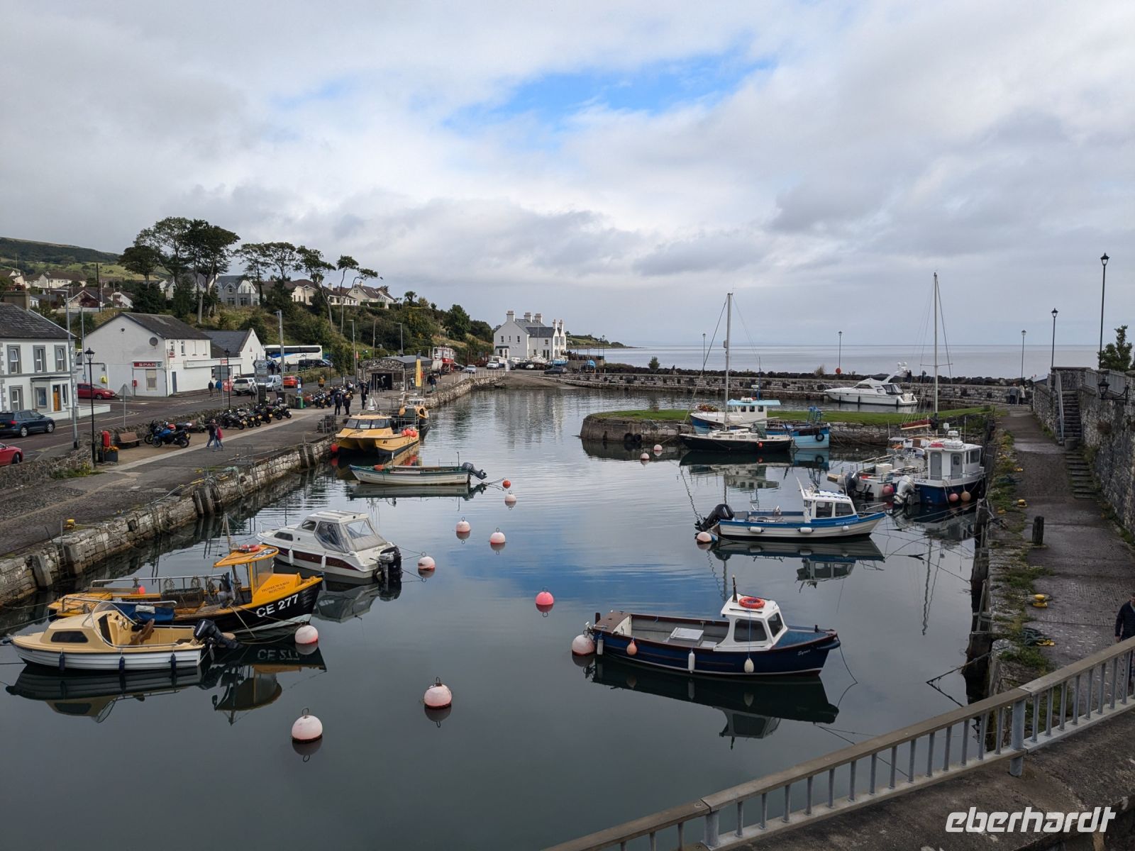 Doch zuvor machten wir einen Halt beim Carrickfergus Castle, einer imposanten mittelalterlichen Burg, die stolz über dem Hafen thront. Anschließend fuhren wir nach Carnlough, einem idyllischen Küstendorf, das als Filmkulisse für Game of Thrones diente. Besonders beeindruckend war der malerische Hafen, den wir bei einem kleinen Spaziergang erkundeten. Am Portaneevy Viewpoint bot sich uns eine unglaubliche Aussicht: Vor uns lag Rathlin Island, eine Insel, die für ihre einzigartigen Vogelkolonien bekannt ist, und in der Ferne konnten wir sogar die Küsten Schottlands erkennen. Rechts von uns ragten die dramatischen Fair Head Klippen in die Höhe – ein wahrlich schönes Panorama!