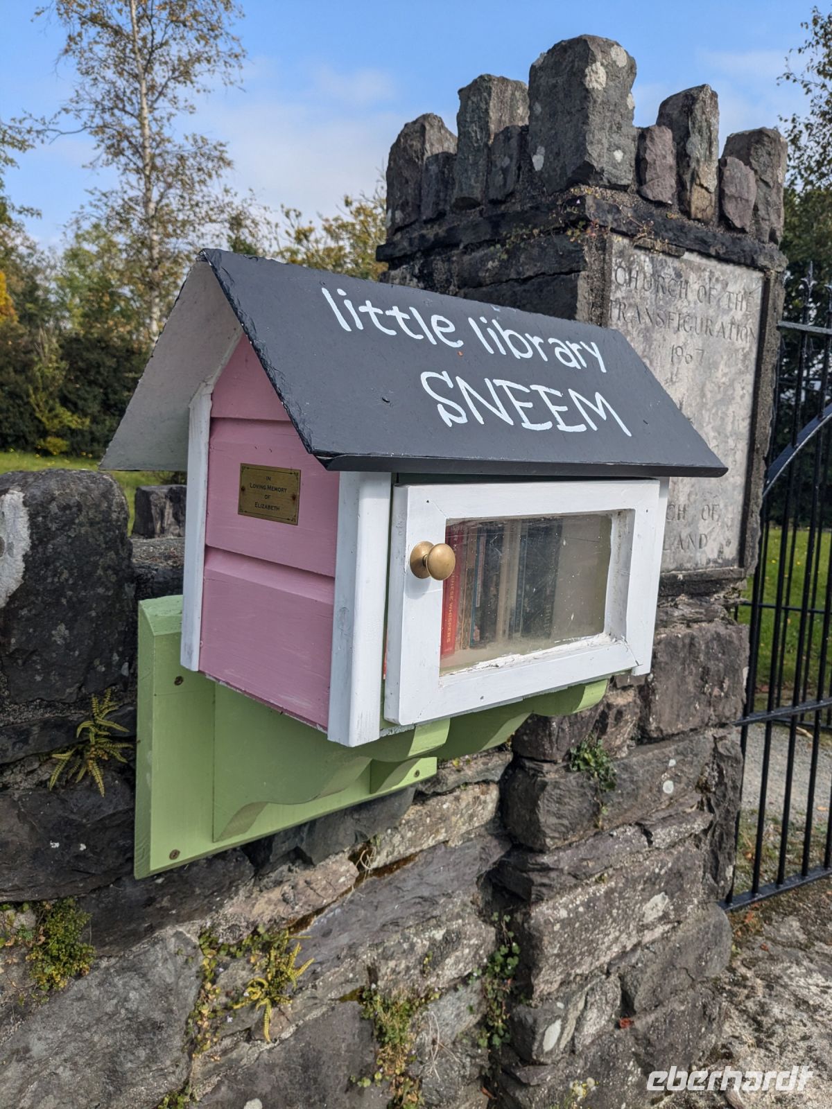 Danach besuchten wir Sneem, eine kleine Stadt, die für ihre bunten Häuschen bekannt ist. Überall waren farbenfrohe Gebäude zu entdecken, und wir hatten die Möglichkeit, durch die engen Gassen zu schlendern. Besonders interessant war ein freundlicher Mann, der seinen Ziegenbock spazieren führte, was uns sehr amüsierte. In der Nähe entdeckten wir auch einen kleinen Wasserfall, der einen malerischen Anblick bot und perfekt für ein paar Erinnerungsfotos war.