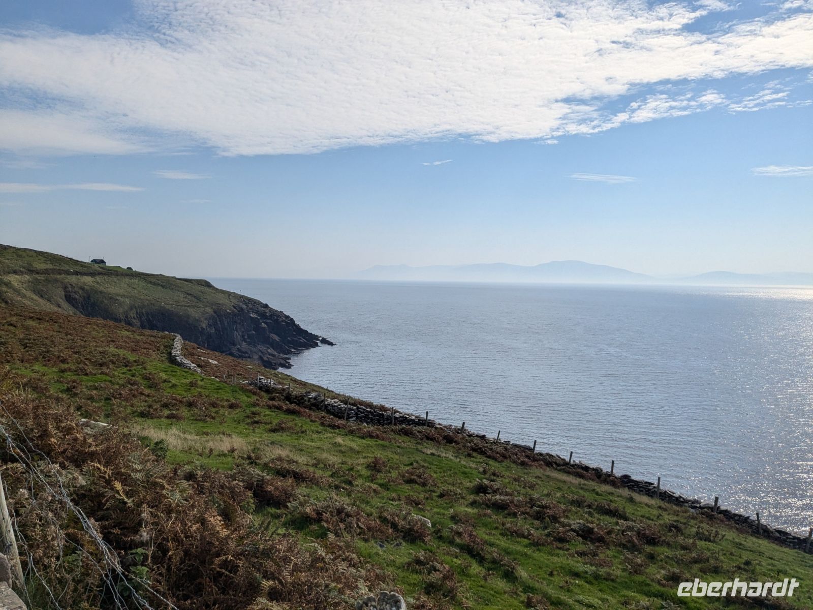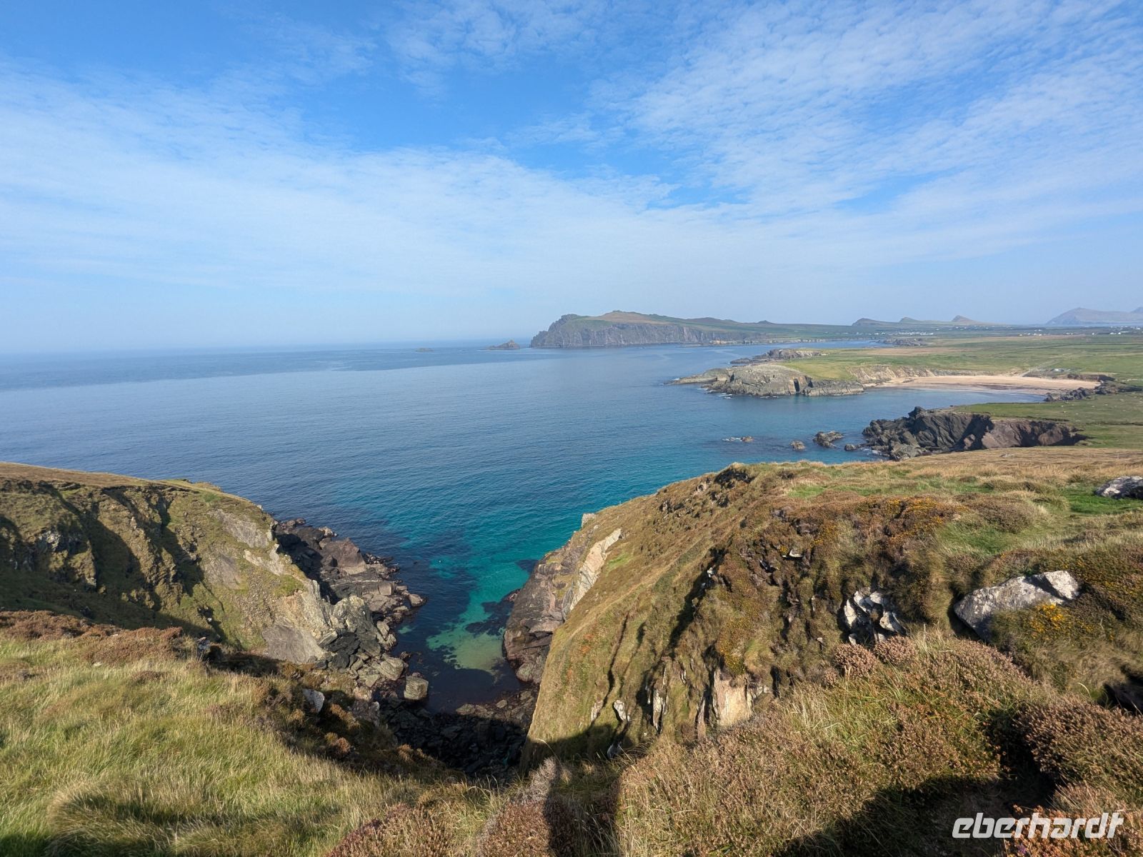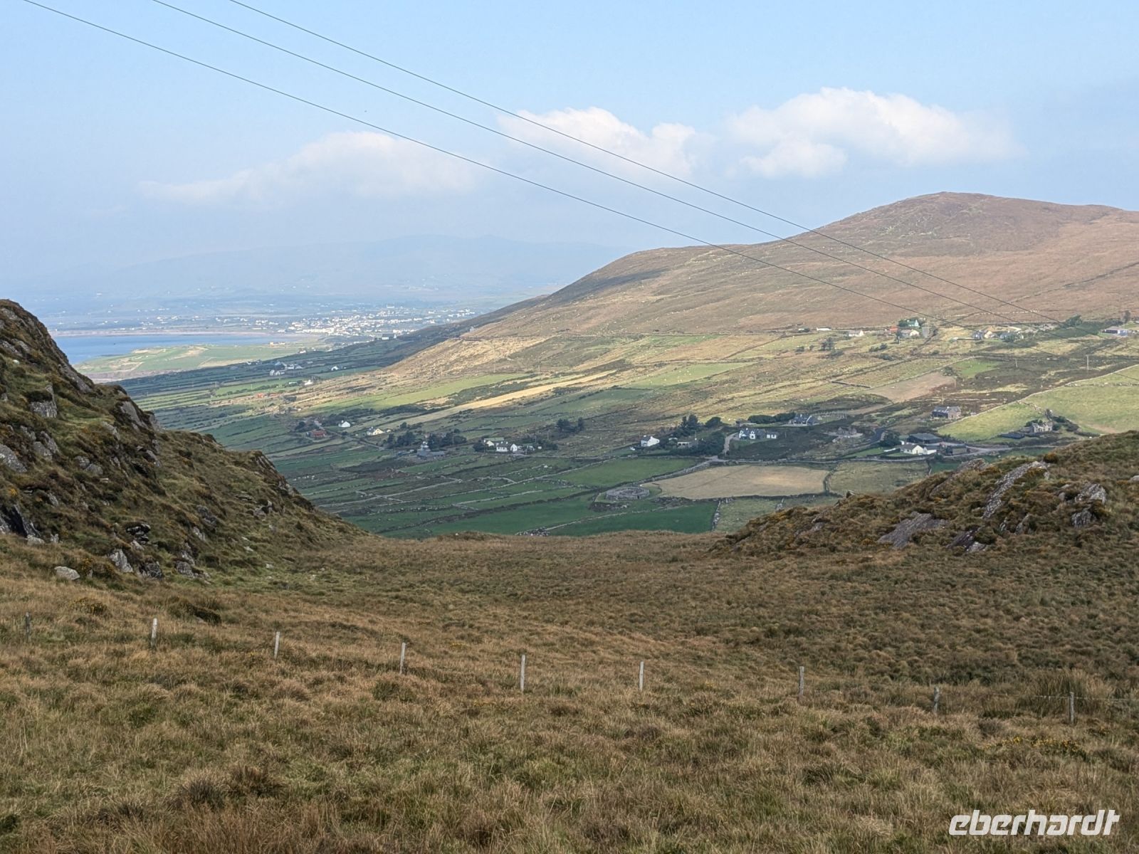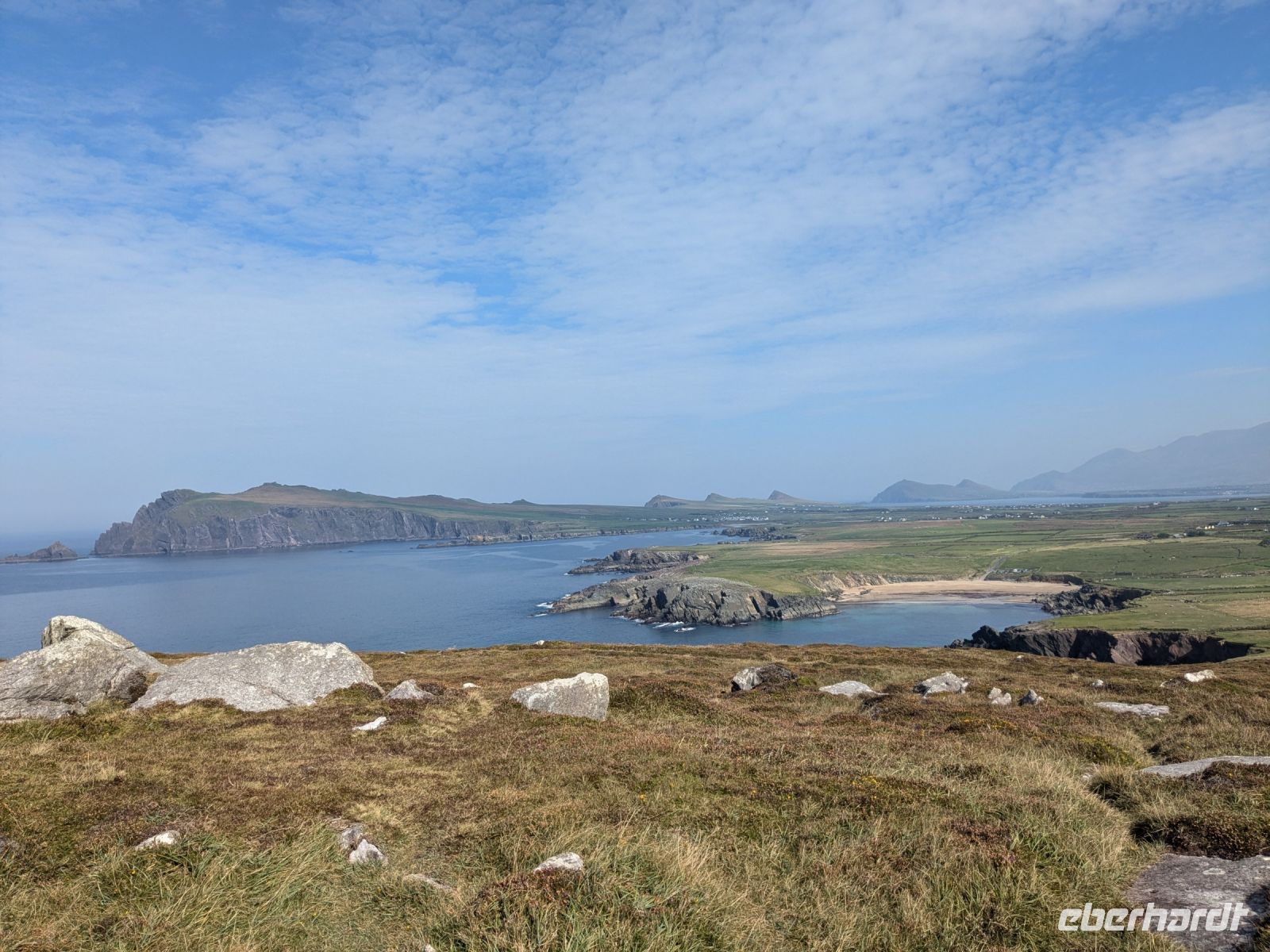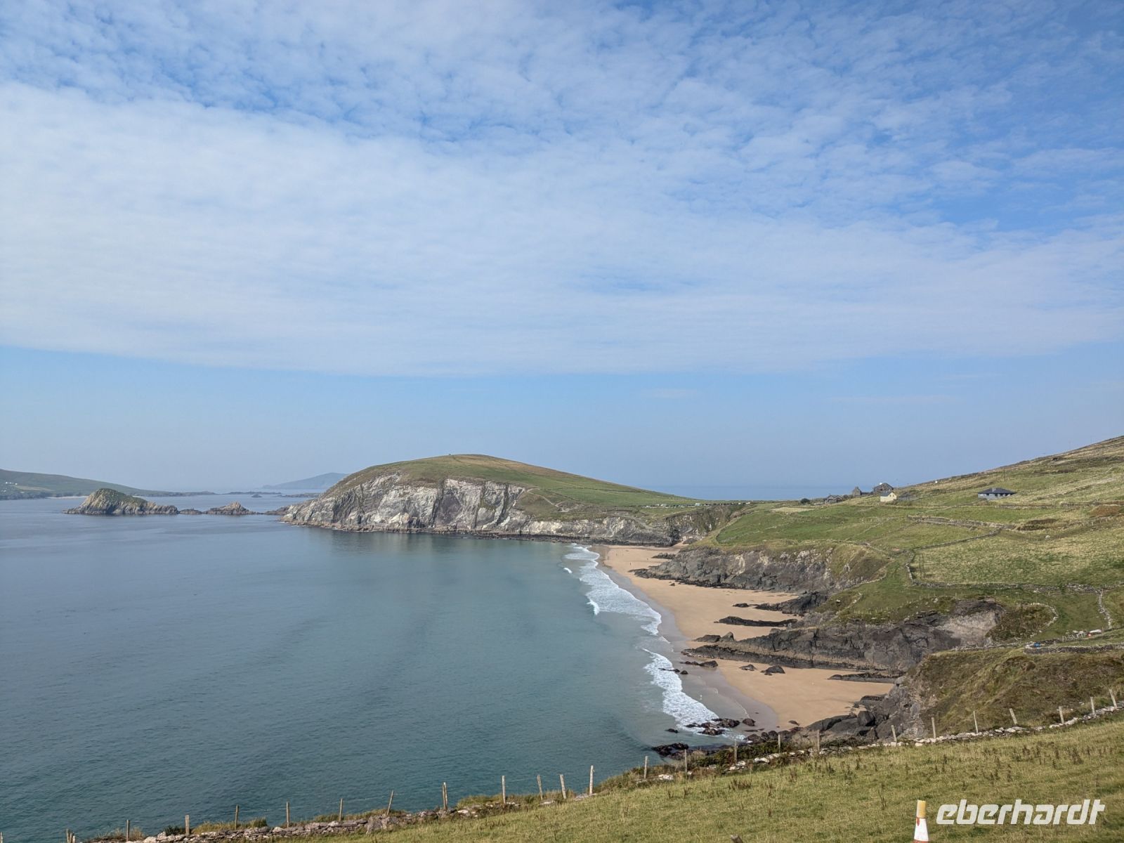 Wir fuhren weiter bis zum Coomakista Viewpoint. Von hier aus hatten wir einen atemberaubenden Blick auf die Küste und das dahinterliegende Bergpanorama. In der Ferne erhob sich das Loher Stone Fort, eine gut erhaltene runde Steinstruktur aus der Eisenzeit. Dieses beeindruckende Bauwerk diente einst als strategische Verteidigungsanlage und ist von einem eindrucksvollen Graben umgeben.