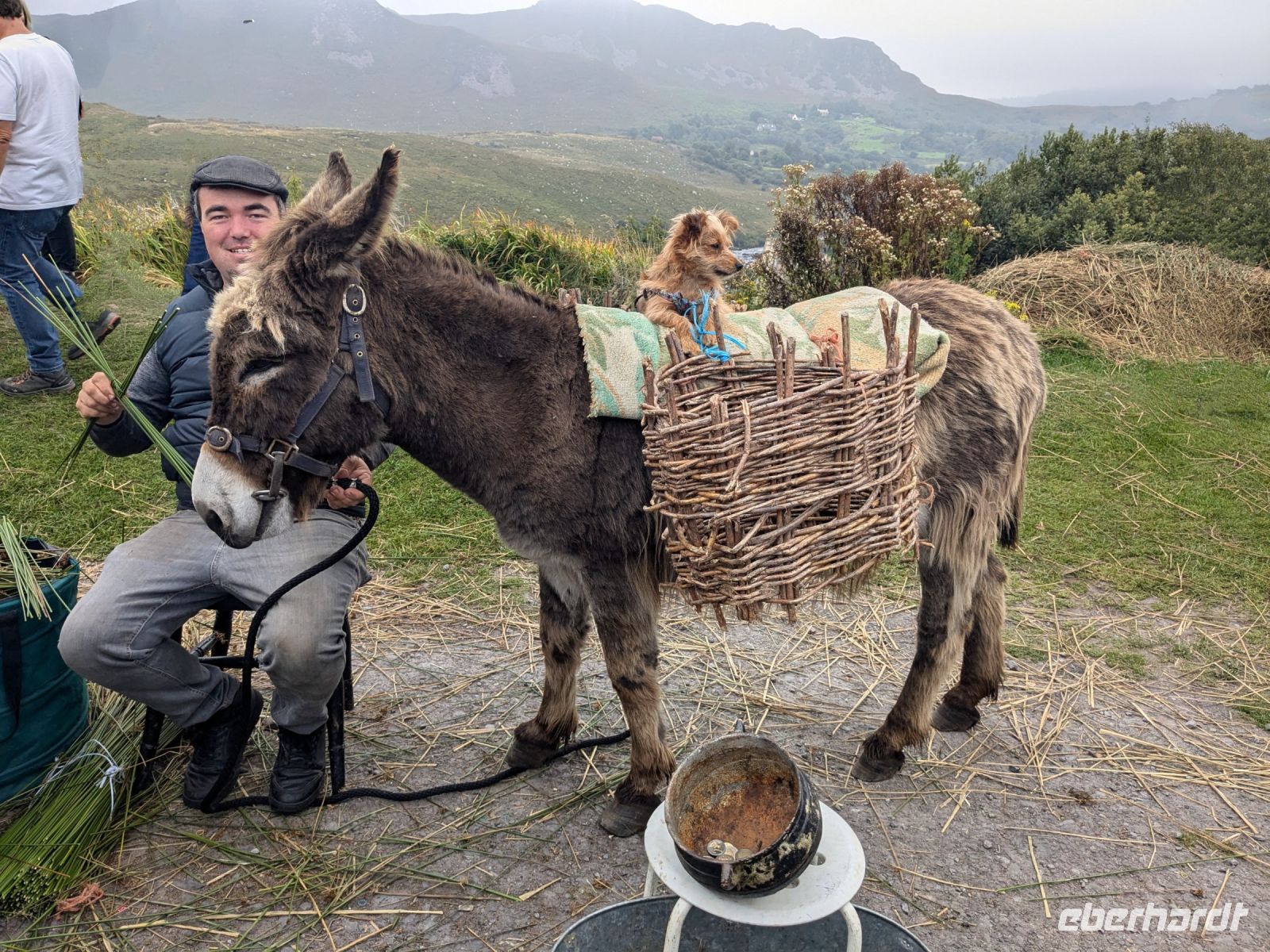 Nur ein paar Hundert Meter weiter stoppten wir bei einem Aussichtspunkt direkt am Lough Caragh. Neben einem Herrn stand ein Esel, auf dem ein Hund saß! Es war amüsant zu beobachten, wie der Esel, der friedlich dastand, mit seinem witzigen Gefährten auf seinem Rücken eine ungewöhnliche Szenerie bot. Während der Herr St. Brigid’s Kreuze flocht, schnappte sich der Esel immer wieder ein paar Gräser, die er zur Flechtung der Kreuze benötigte. Es war ein herzlicher Anblick, der uns zum Schmunzeln brachte.