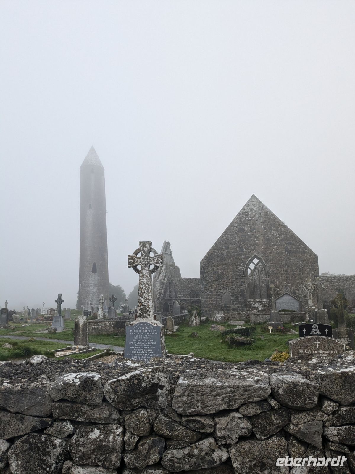 Heute führte uns unsere Reise in Richtung Burren Nationalpark. Direkt zu Beginn legten wir einen Zwischenstopp bei der Kilmacduagh Abbey ein. Der Nebel hing noch tief über der Landschaft und verlieh dieser ehemaligen Wohn- und Gebetsstätte der Mönche einen mystischen Eindruck. Die alten Gräber, einige von ihnen fast 200 Jahre alt, waren von keltischen Kreuzen umgeben. Besonders beeindruckend war der schiefe Rundturm aus dem 10. Jahrhundert, der weit sichtbar in den Himmel ragte.