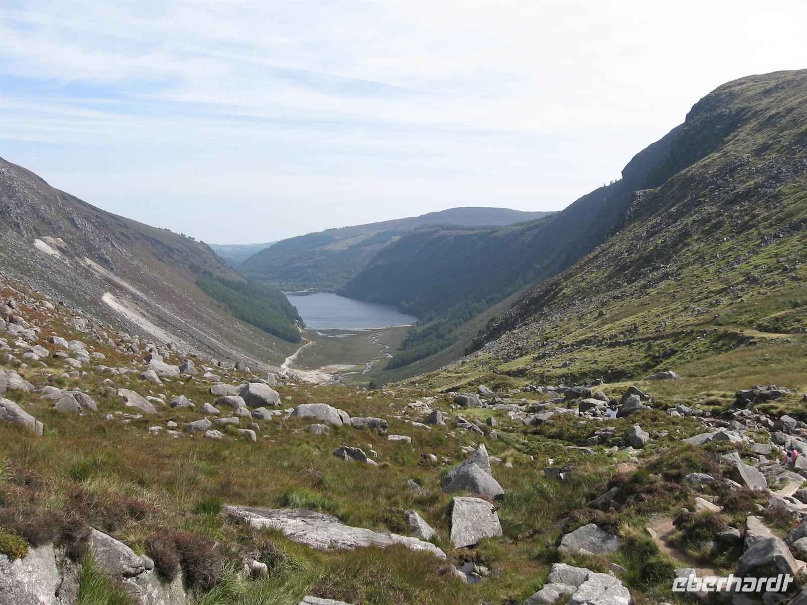 Hier machen wir unsere Mittagspause und lassen und die Handmade Sandwiches aus dem Hotel schmecken. Immer wenn wir einen Wandertag haben bekommt jeder Gast ein Lunchpacket für Mittag. Weiter führt unser Weg über eine alte Green Road und später über einen Bohlenweg bis wir einen Aussichtspunkt erreichen welcher einen uns einen Blick über die Seen bis hin zum alten Kloster von Glendalough erlaubt. Der alte Rundturm grüßt uns von weiten. Noch einmal müssen wir aufsteigen um eine Höhe von ca. 600 m zu erreichen, schließlich erreichen wir den Wicklow Way welcher uns wieder bergab zum Parkplatz am Upper Lake führt.Nach gut fünf Stunden wandern sind wir am Ziel und so mancher von uns belohnt sich mit einem Eis. Zurück im Hotel bleibt noch Zeit vor dem Abendessen schwimmen zu gehen oder auch einfach nur in der Sonne zu sitzen.