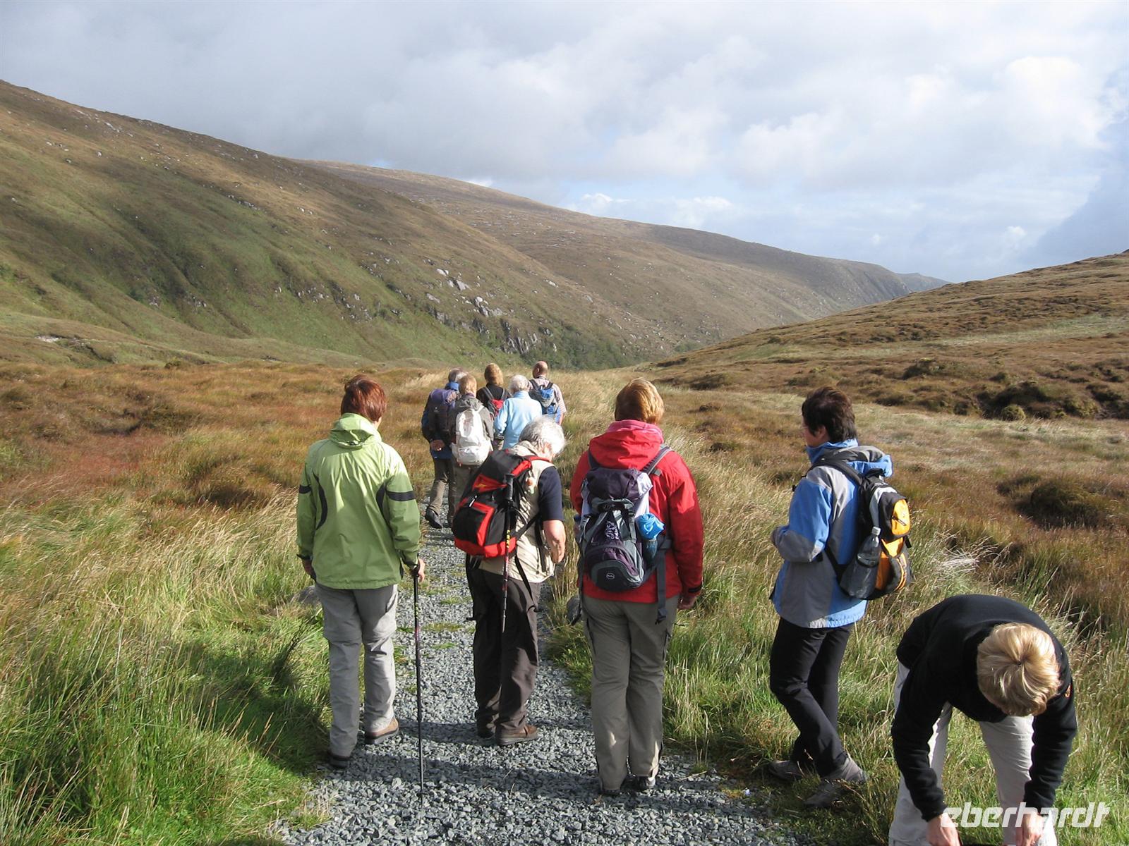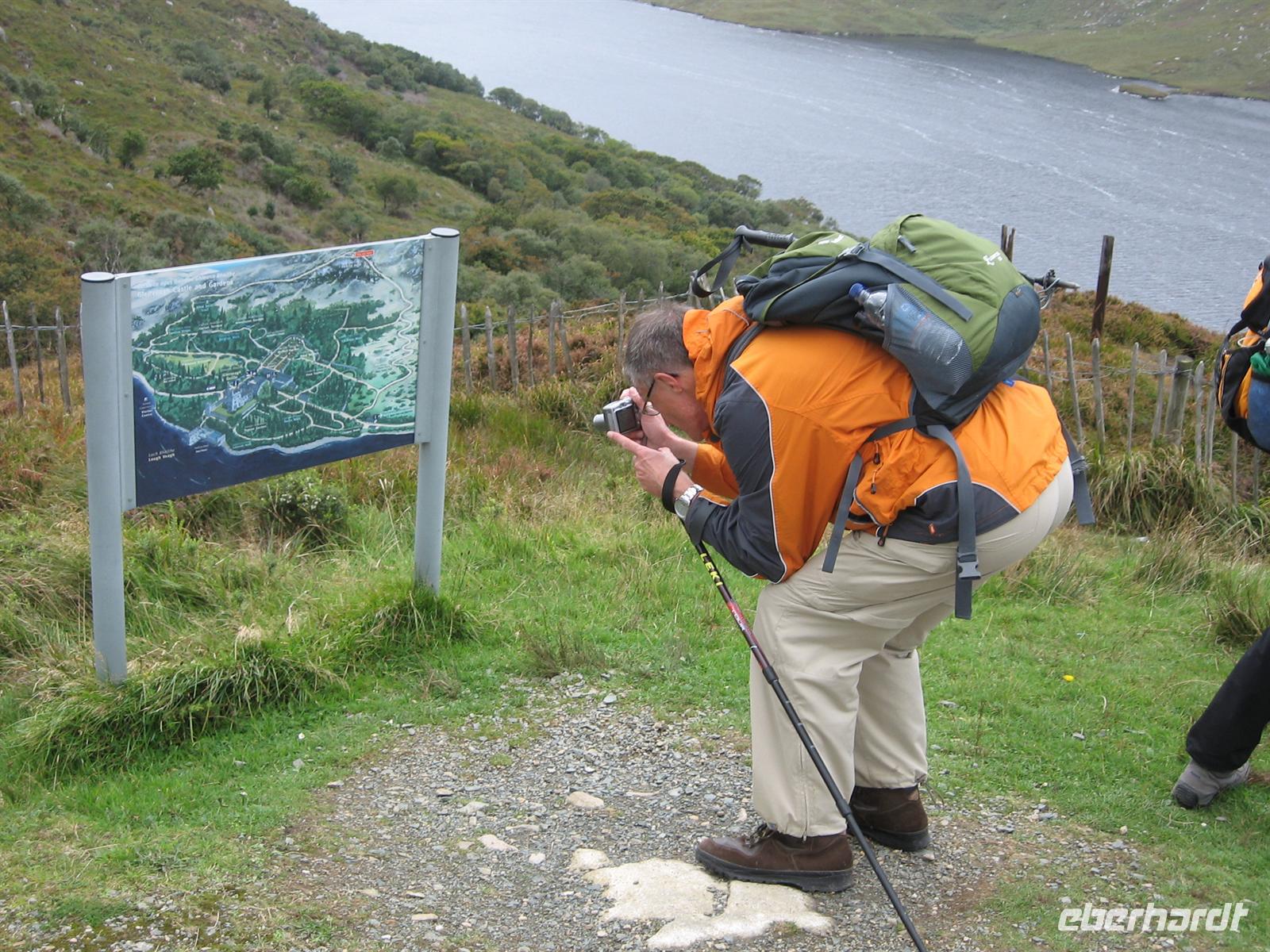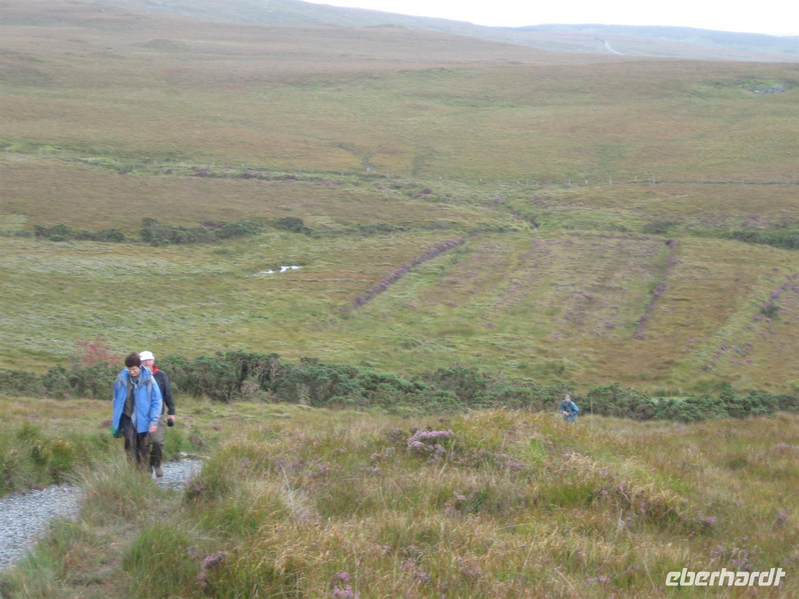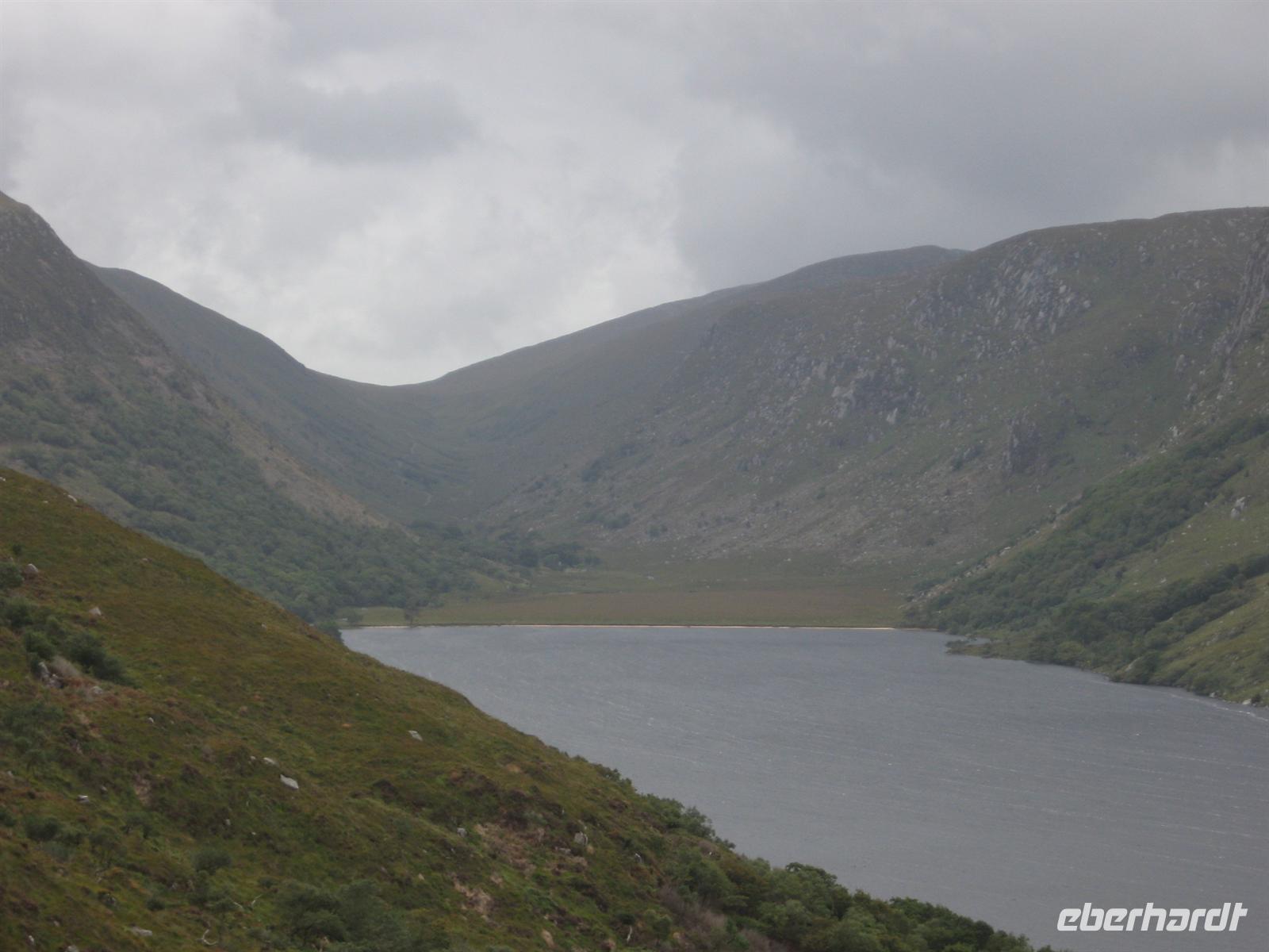 Heute geht es zu unserer letzten Wanderung. Am Morgen scheint die Sonne und auch der irische Fernsehwetterbericht hat uns einen trockenen Sonntag versprochen. Ganz wird das versprechen nicht gehalten, aber wir werden nicht wirklich nass. Dafür können wir mehrfach sehen wie in unserer Nähe ein Regenguss niedergeht. Es heißt hier, wenn ein Regenschauer schnell kommt geht er auch schnell wieder, zieht das Regenwetter jedoch zwei Stunden auf, so kann es auch zwei Stunden lang regnen. Unser Wanderausgangspunkt liegt am Westende des Glenveagh NP, weit Oberhalb des Lough Veagh. Das Gelände des Nationalparks ist mit einem Wildzaun umzäunt, denn im Park leben Hirsche und diese sollen dadurch geschützt werden. Wir steigen gemächlich, immer mit dem Blick auf den See ab.
