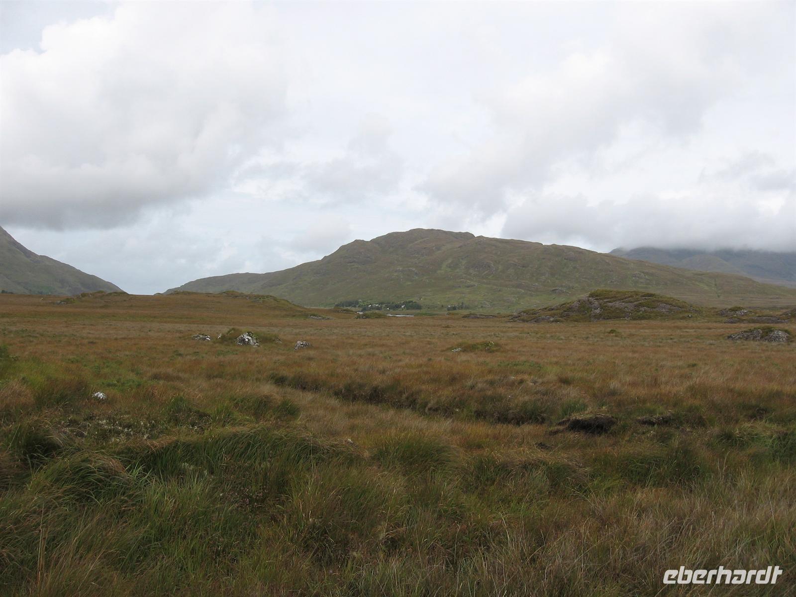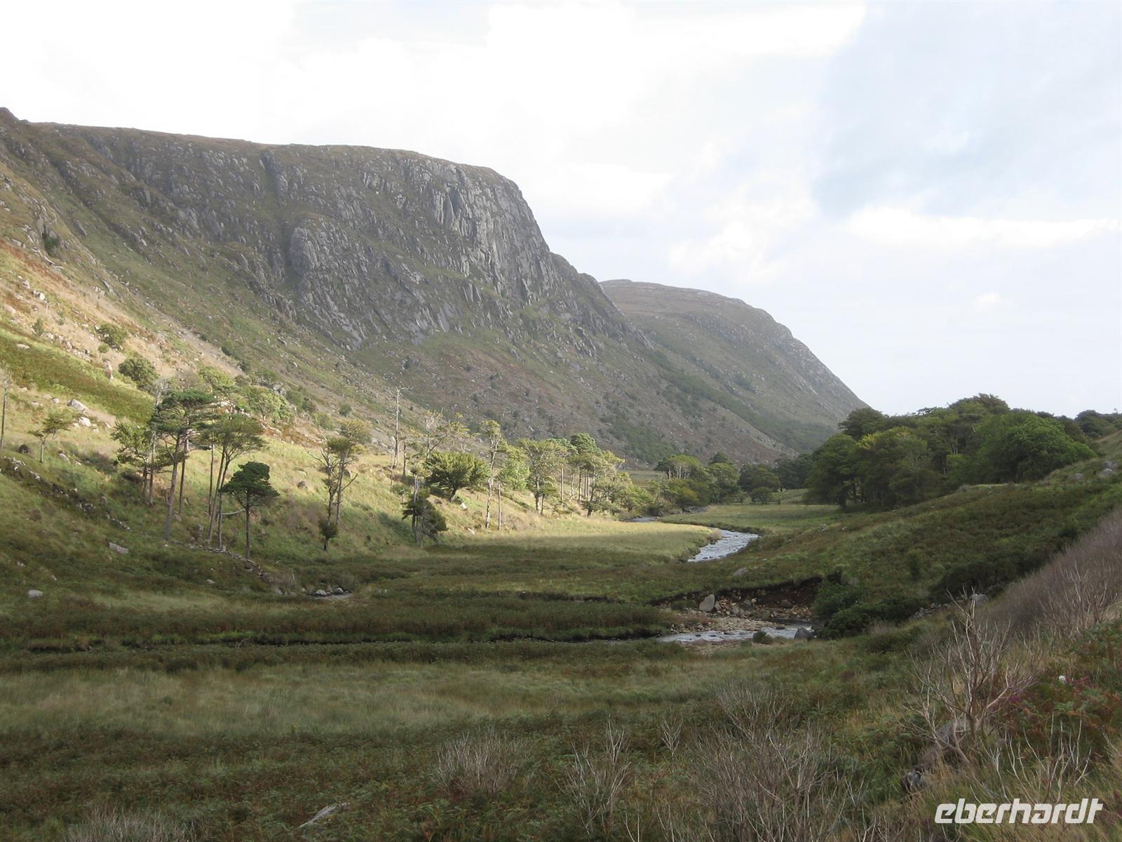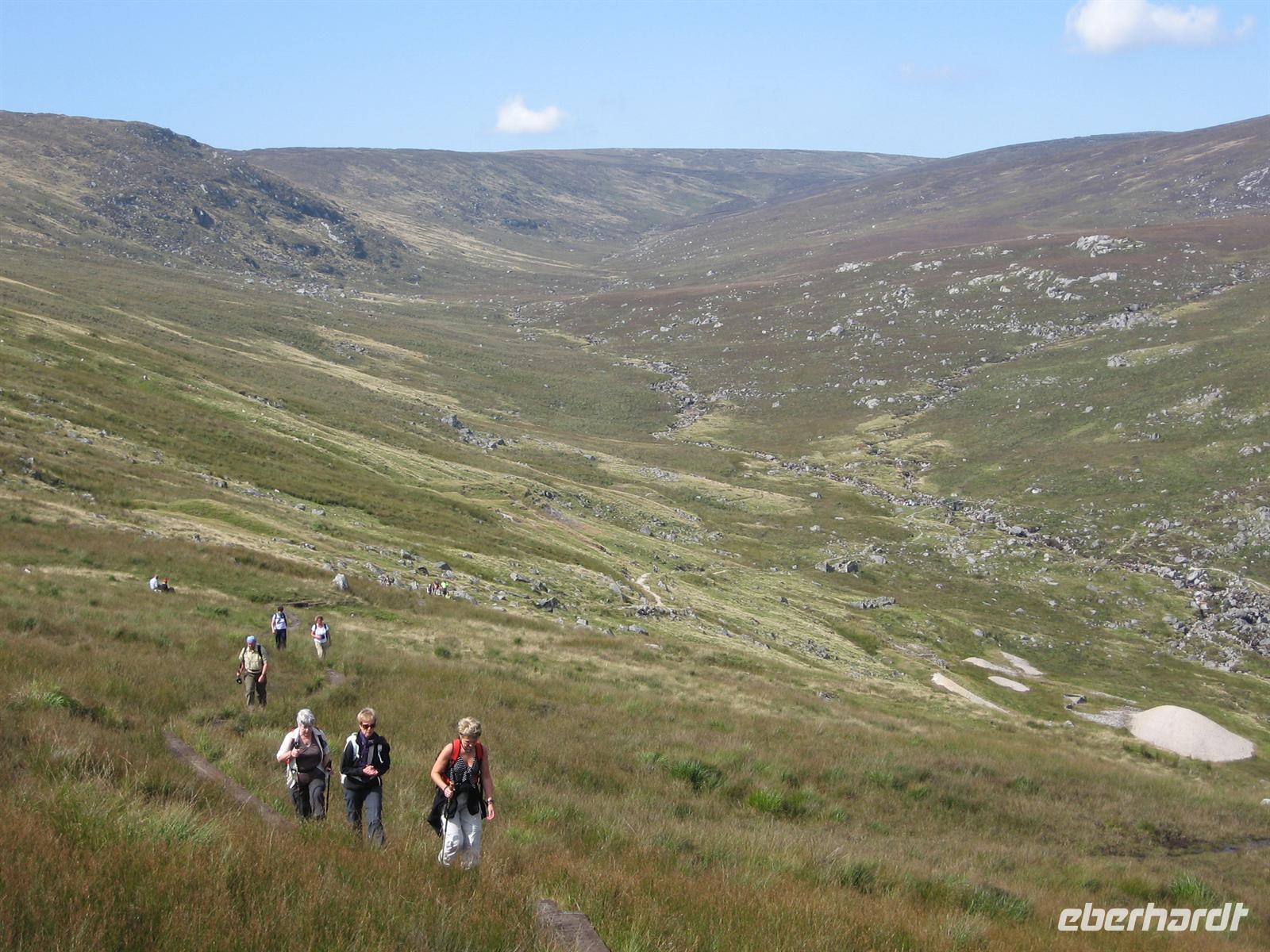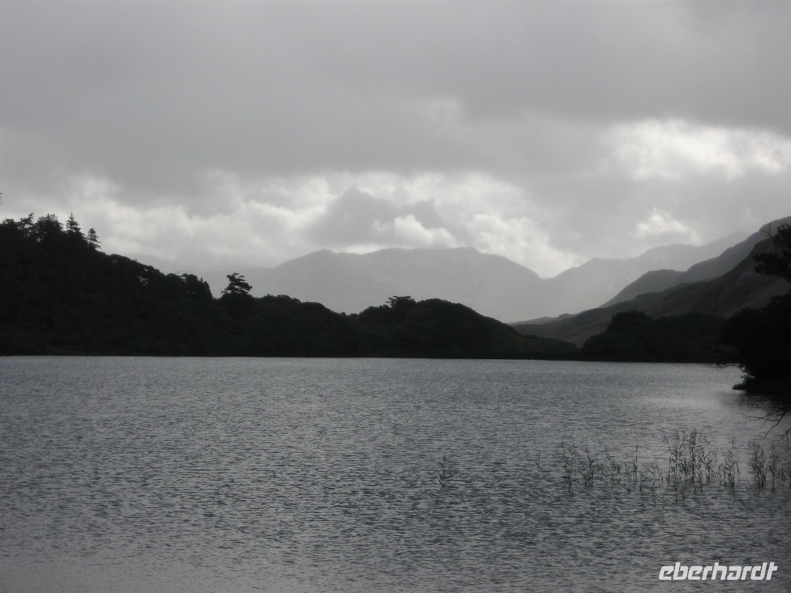 Heute geht es zu unserer letzten Wanderung. Am Morgen scheint die Sonne und auch der irische Fernsehwetterbericht hat uns einen trockenen Sonntag versprochen. Ganz wird das versprechen nicht gehalten, aber wir werden nicht wirklich nass. Dafür können wir mehrfach sehen wie in unserer Nähe ein Regenguss niedergeht. Es heißt hier, wenn ein Regenschauer schnell kommt geht er auch schnell wieder, zieht das Regenwetter jedoch zwei Stunden auf, so kann es auch zwei Stunden lang regnen. Unser Wanderausgangspunkt liegt am Westende des Glenveagh NP, weit Oberhalb des Lough Veagh. Das Gelände des Nationalparks ist mit einem Wildzaun umzäunt, denn im Park leben Hirsche und diese sollen dadurch geschützt werden. Wir steigen gemächlich, immer mit dem Blick auf den See ab.