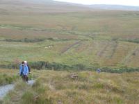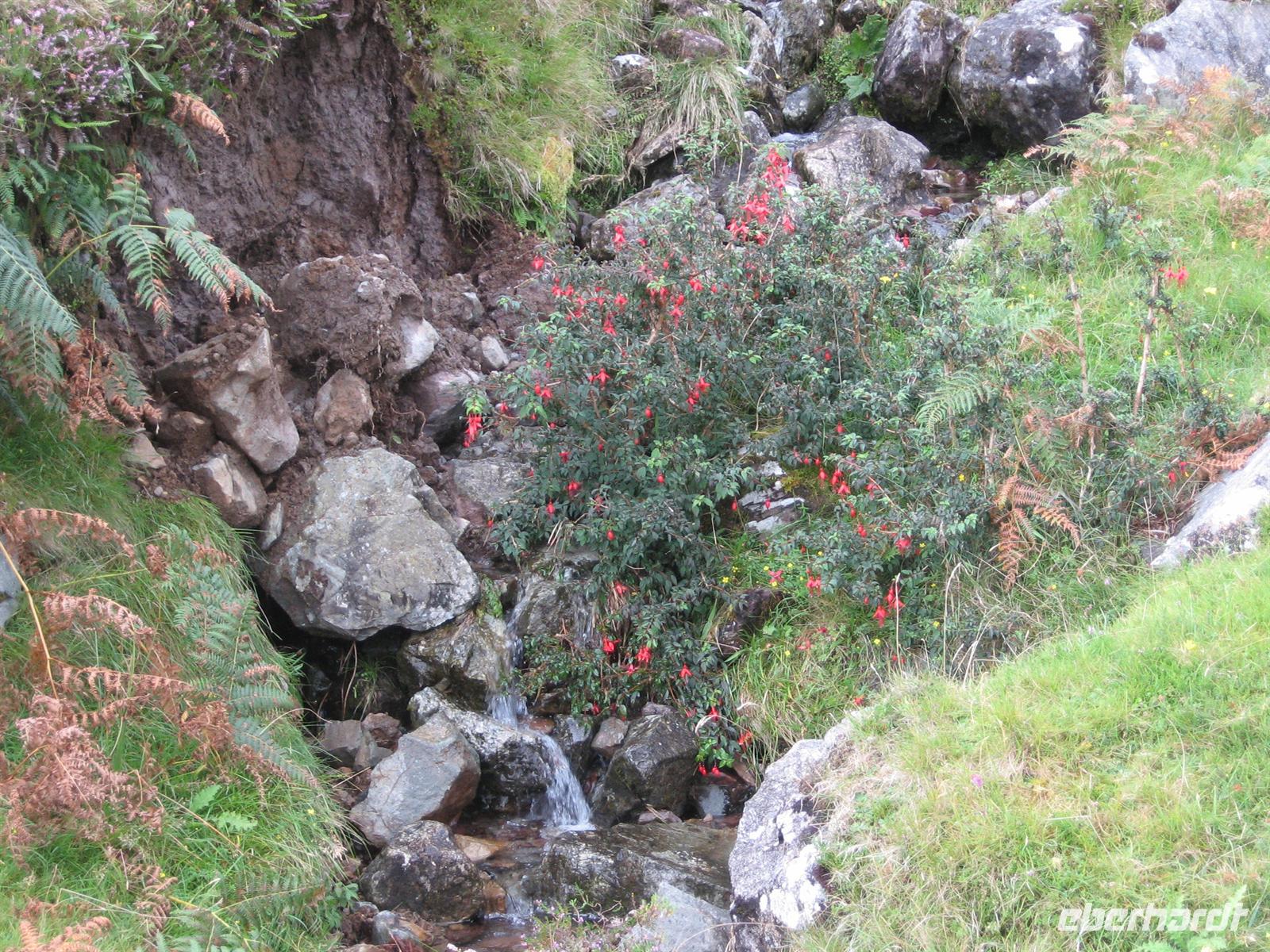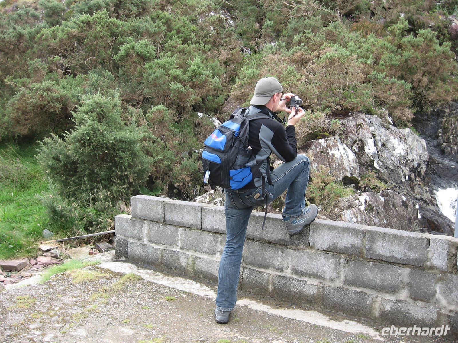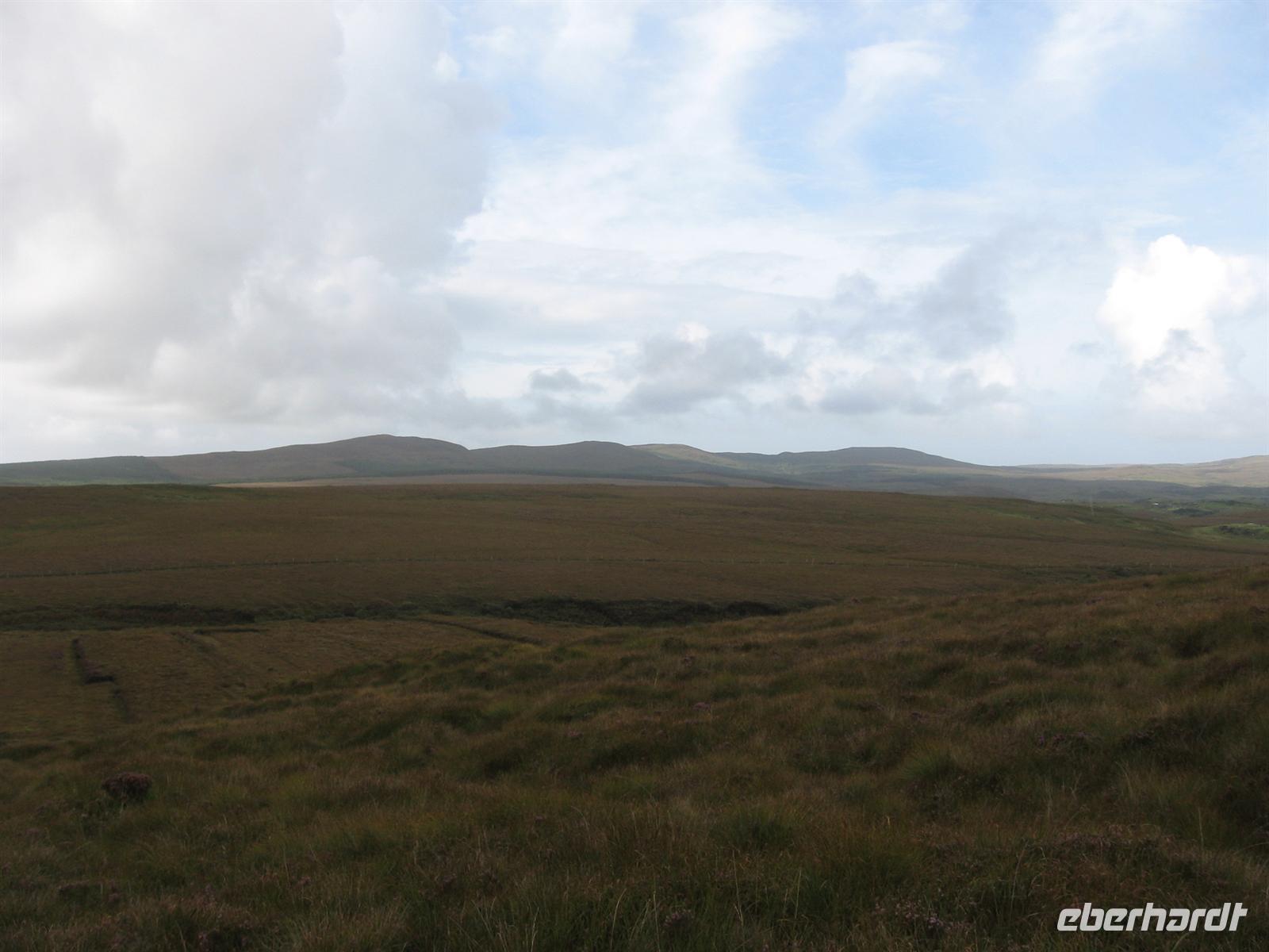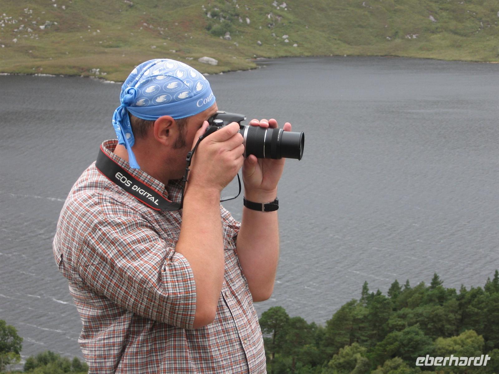 Heute geht es zu unserer letzten Wanderung. Am Morgen scheint die Sonne und auch der irische Fernsehwetterbericht hat uns einen trockenen Sonntag versprochen. Ganz wird das versprechen nicht gehalten, aber wir werden nicht wirklich nass. Dafür können wir mehrfach sehen wie in unserer Nähe ein Regenguss niedergeht. Es heißt hier, wenn ein Regenschauer schnell kommt geht er auch schnell wieder, zieht das Regenwetter jedoch zwei Stunden auf, so kann es auch zwei Stunden lang regnen. Unser Wanderausgangspunkt liegt am Westende des Glenveagh NP, weit Oberhalb des Lough Veagh. Das Gelände des Nationalparks ist mit einem Wildzaun umzäunt, denn im Park leben Hirsche und diese sollen dadurch geschützt werden. Wir steigen gemächlich, immer mit dem Blick auf den See ab.