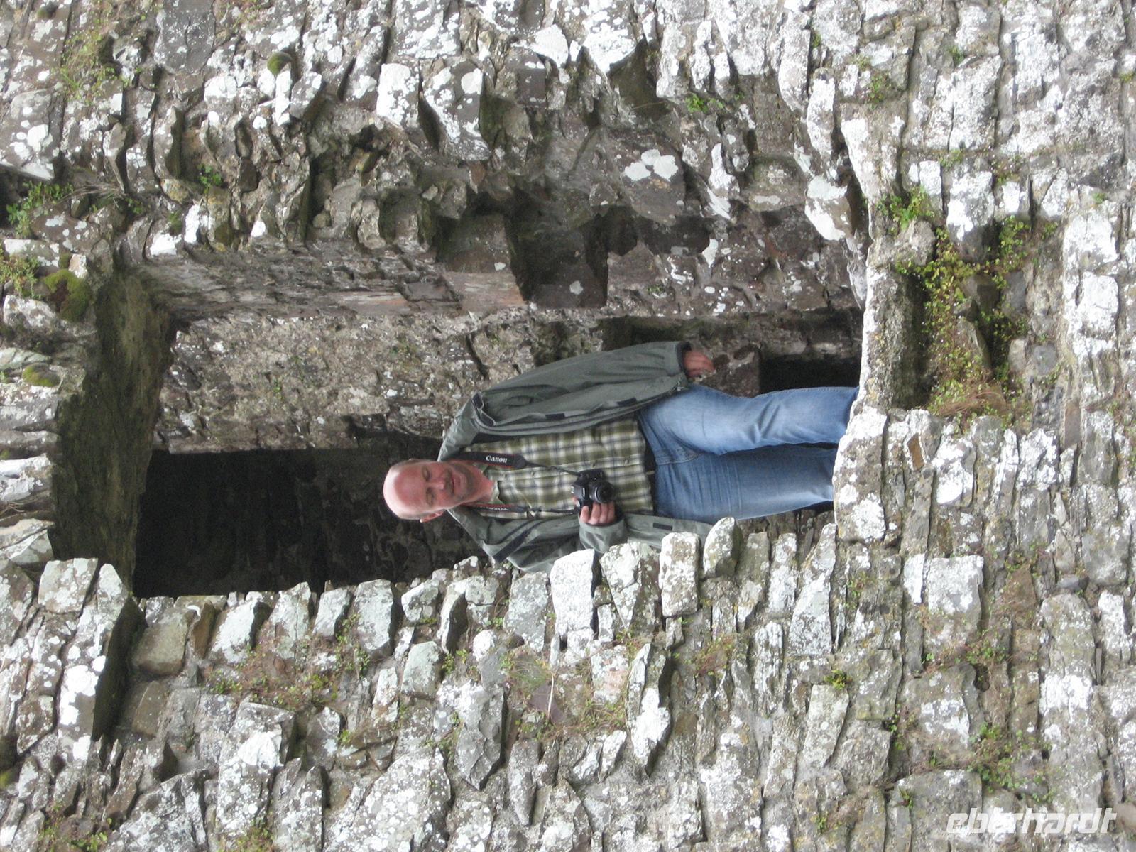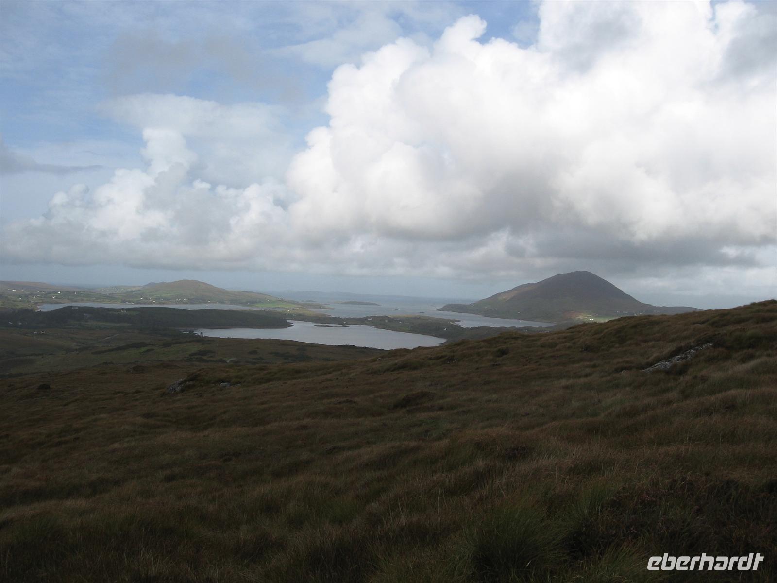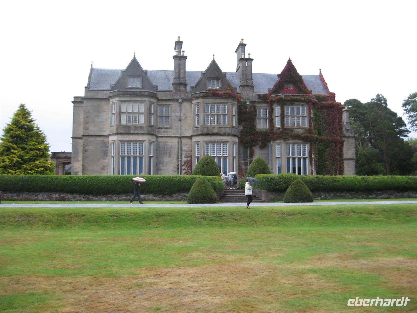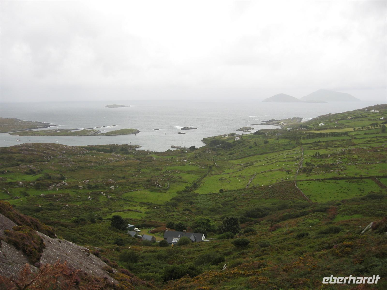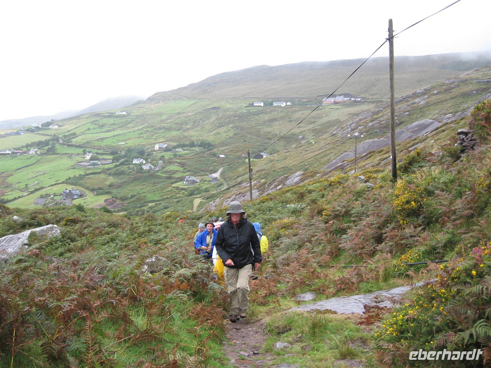 Unterwegs machen wir noch einige Fotostopps u.a. mit Blick auf die gegenüberliegende Halbinsel Dingle. Dann besuchen wir bei Cahersiveen das Cahergall Ringfort. Wir können so sehen wie in früheren Zeiten, dieses hier stammt aus dem 10. Jh., die Menschen gelebt haben. Auf den hohen Mauern kann man gut herumlaufen und hat wie die Menschen damals einen Blick über das weite Land. Unsere Mittagspause verbringen wir in Waterville, einem Ort an der Ballinskelligbay, wo auch schon Charlie Chaplin gern Urlaub machte. Nicht weit vom Ort entfernt befindet sich der 210 Meter hohe Coomakista Pass und kurz danach beginnt unsere kleine Wanderung. Leider hat es sich inzwischen stark ein getrübt und beginnt erst leicht und wenig später stark zu regnen. Und wir werden natürlich ganz schön nass, mancher von uns, trotz Regenkleidung, bis auf die Knochen. Nur Irmchen hat nach der Wanderung noch eine trockenen Hose. Am Derrynane House wartet unser Bus und wir fahren weiter nach Sneem für eine kurze Pause. Danach weiter zum Muckross House, auch hier wieder regen, so dass wir nur einen schnellen Rundgang um das das alte Herrenhaus machen. Nach dem Abendessen gehen noch einige Gäste mit in einen Pub, bei Live-Musik genießen wir die Atmosphäre im verlängerten Wohnzimmer der Iren, welche an diesem Abend zahlreich und lautstark vertreten waren.