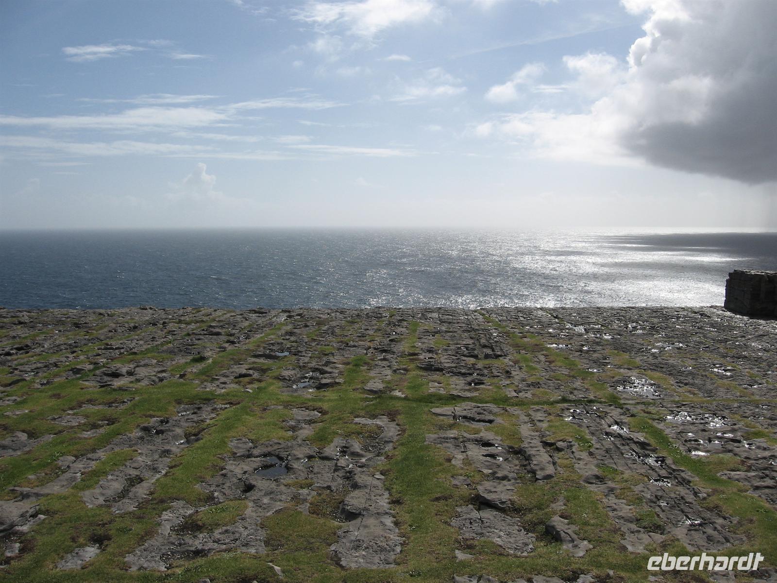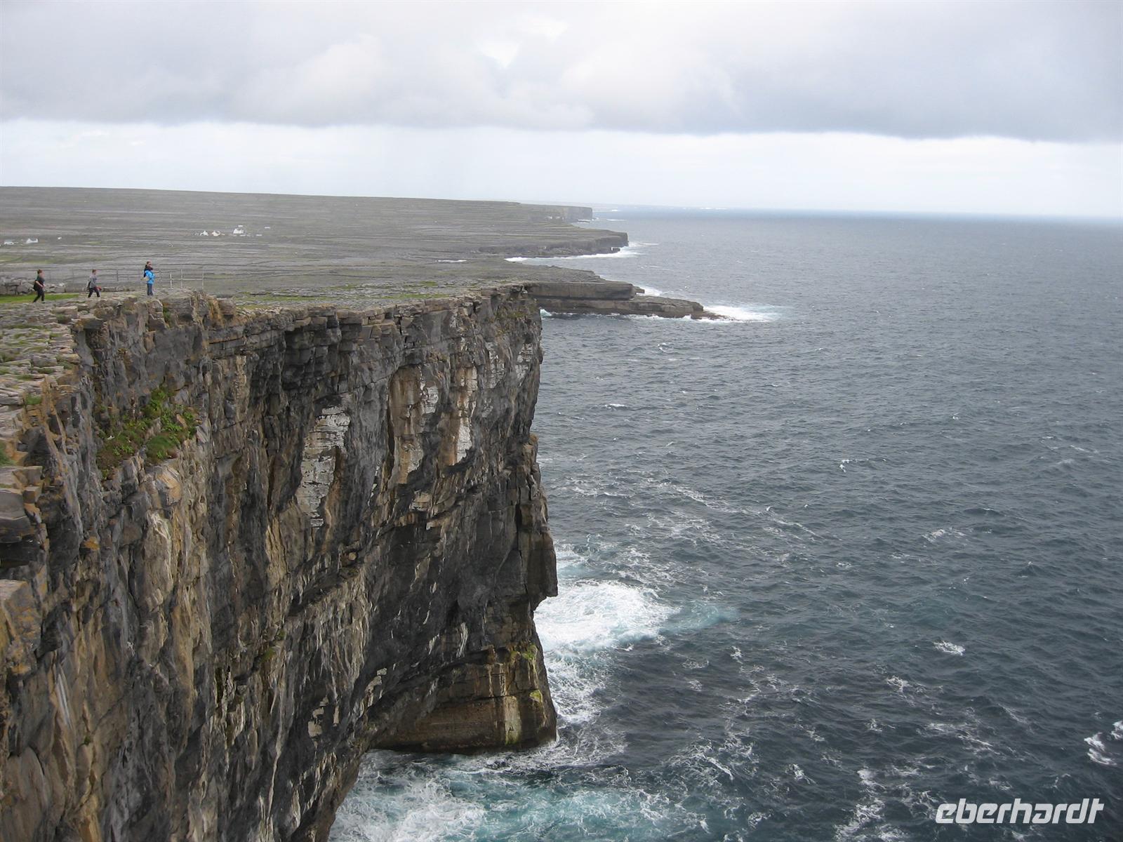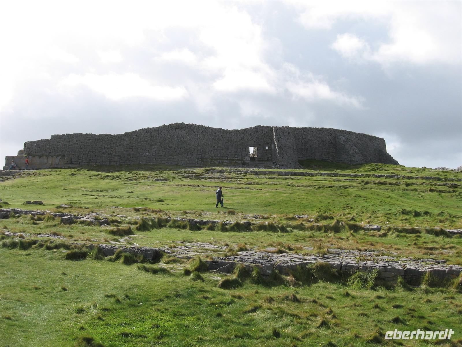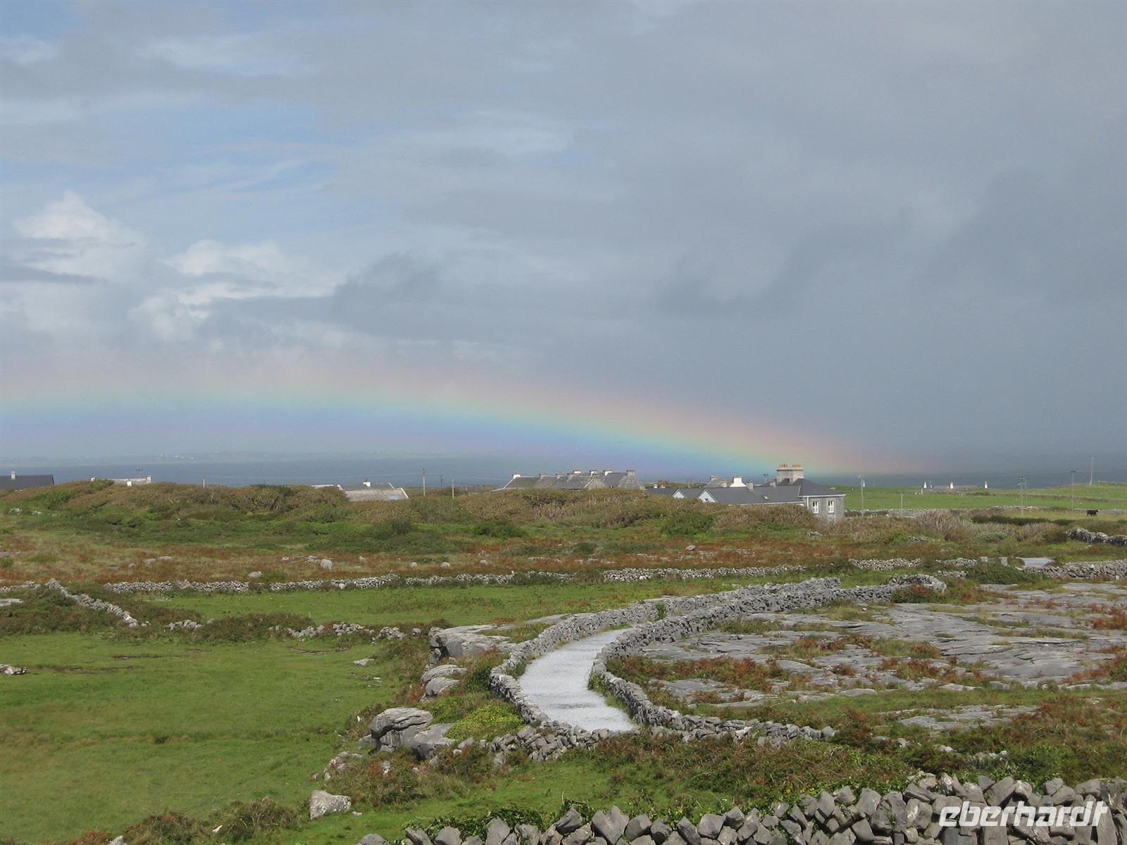 Heute heißt es zeitig abreisen und vor dem Frühstück schon Koffer laden. Wir wollen die AranIslands besuchen, genauer die Insel Inishmore. Dazu müssen wir zum Hafen nach Rosaveel fahren, von dort fährt das Schiff ab. Auf unserem Weg kommen wir an Galway vorbei, der viertgrößten Stadt Irlands. Hier ist immer viel Betrieb. „Stolz wie ein Kaufmann aus Galway" war hier früher ein geflügeltes Wort, war die Stadt doch vor allem im 14.-16. Jh. eine wichtiger Umschlagplatz für Wein. Das heute noch benutzte Wort „Lynchjustiz" soll ebenfalls von hier stammen. James Lynch Fitzstephen, Bürgermeister und oberster Richter der Stadt im 16. Jh., soll seinen Sohn Walter eigenhändig erhängt haben als der Scharfrichter sich weigerte es zu tun. Walter war des Mordes an einem spanischen Seemann angeklagt und der Vater war ein strenger Richter und ließ keine Gnade ergehen, auch nicht bei seinem eigenen Sohn. Inzwischen fahren wir schon am Meer entlang, die Bucht von Galway immer zu unserer Linken und wir können die Berge des Burren sehen, wo wir gestern wanderten. Im Hafen angekommen können wir gleich das Schiff besteigen, auch wenn es noch einige Minuten bis zur Abfahrt dauert. Das Wetter scheint sich aufzuklären. Die Überfahrt ist dann doch ganz schön stürmisch und wir sind froh als wir den Hafen im kleinen Inselhauptort Kilronan erreichen. Wir wandern immer entlang der Nordküste, der Wanderweg führt hier entlang der Straße. Es herrscht allerdings kaum Verkehr, mal ein PKW oder auch eine Kutsche die Gäste transportiert.