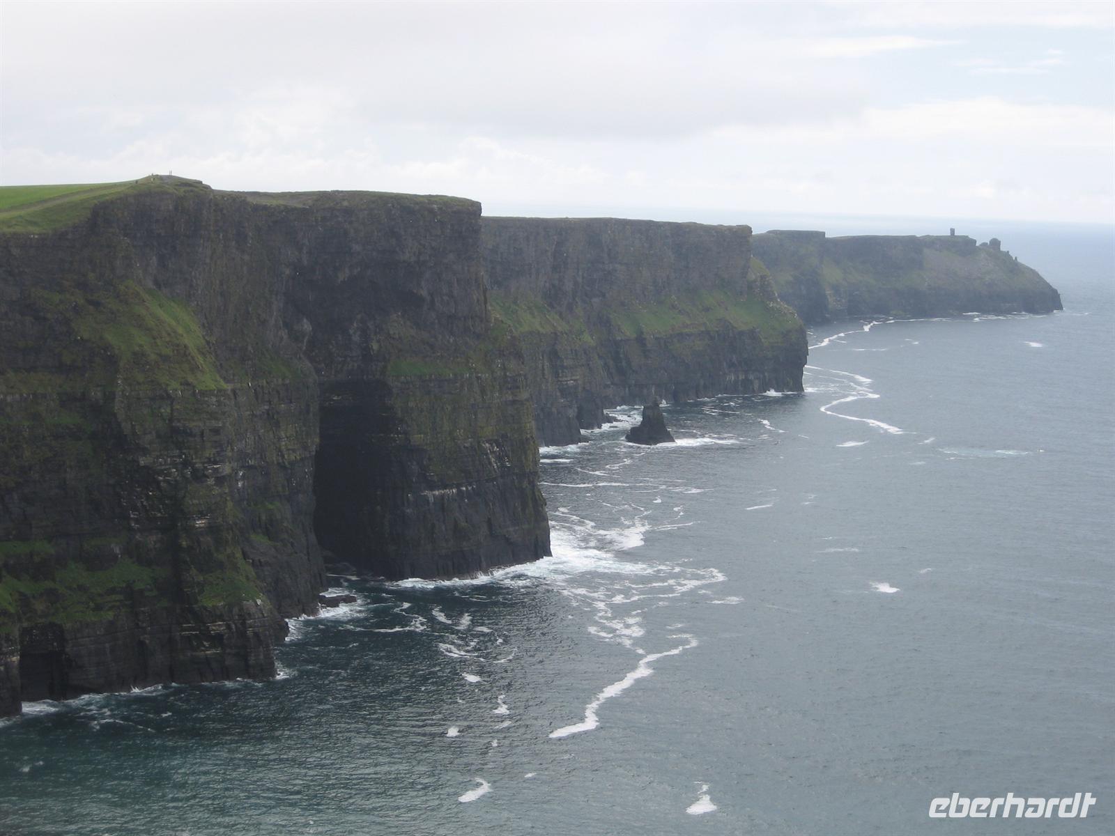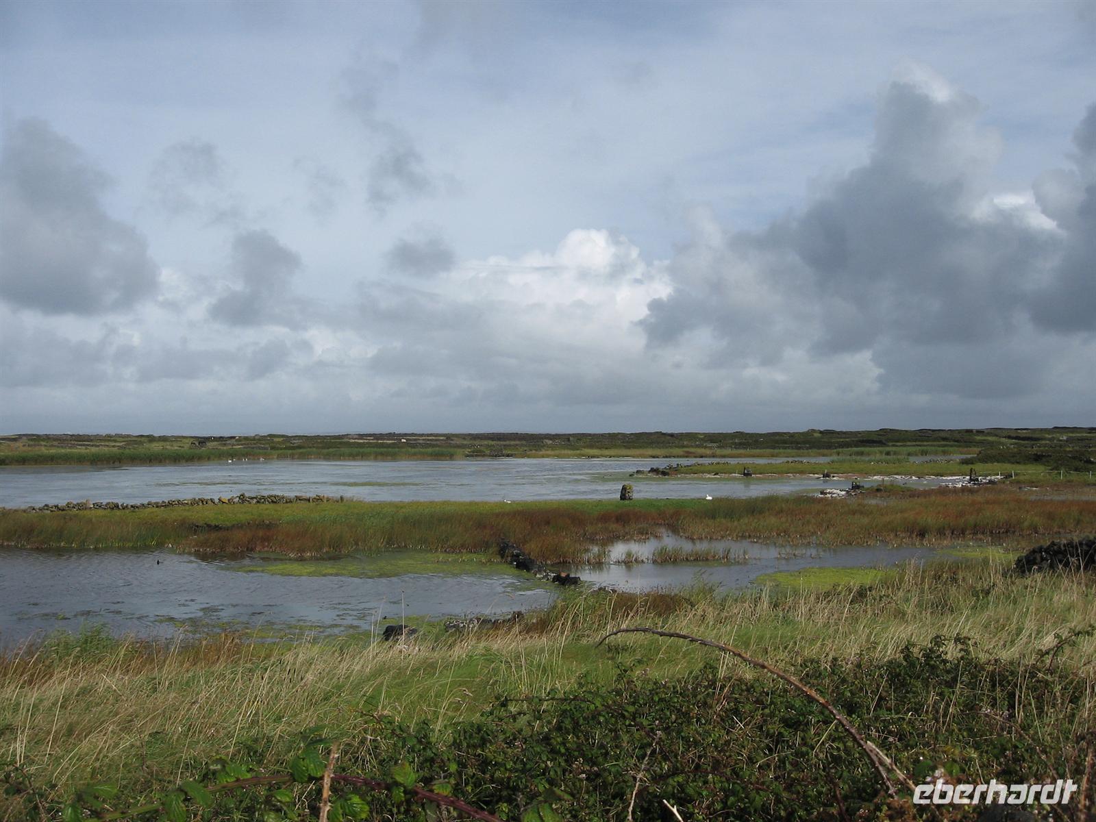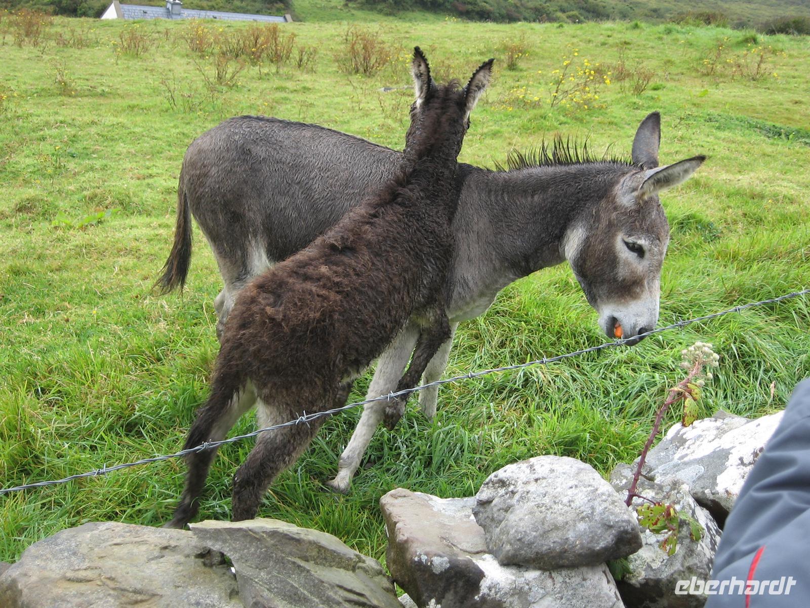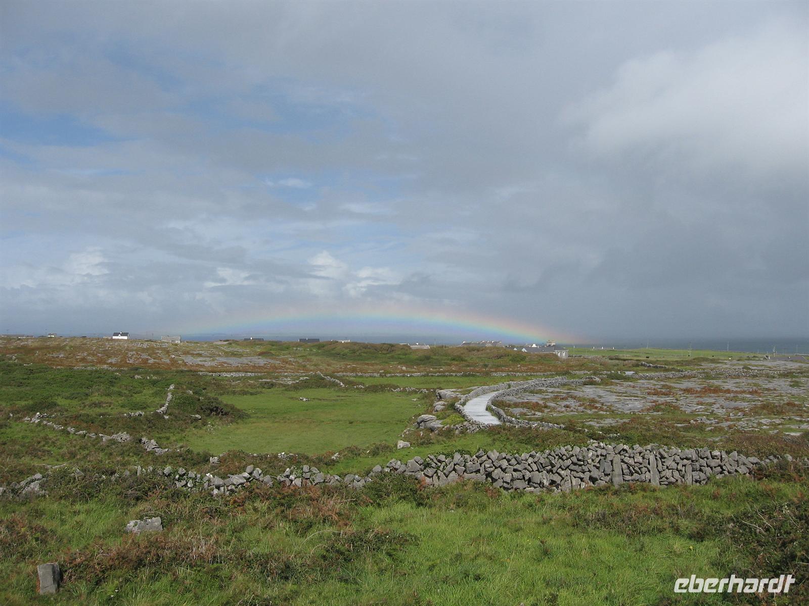 Heute heißt es zeitig abreisen und vor dem Frühstück schon Koffer laden. Wir wollen die AranIslands besuchen, genauer die Insel Inishmore. Dazu müssen wir zum Hafen nach Rosaveel fahren, von dort fährt das Schiff ab. Auf unserem Weg kommen wir an Galway vorbei, der viertgrößten Stadt Irlands. Hier ist immer viel Betrieb. „Stolz wie ein Kaufmann aus Galway" war hier früher ein geflügeltes Wort, war die Stadt doch vor allem im 14.-16. Jh. eine wichtiger Umschlagplatz für Wein. Das heute noch benutzte Wort „Lynchjustiz" soll ebenfalls von hier stammen. James Lynch Fitzstephen, Bürgermeister und oberster Richter der Stadt im 16. Jh., soll seinen Sohn Walter eigenhändig erhängt haben als der Scharfrichter sich weigerte es zu tun. Walter war des Mordes an einem spanischen Seemann angeklagt und der Vater war ein strenger Richter und ließ keine Gnade ergehen, auch nicht bei seinem eigenen Sohn. Inzwischen fahren wir schon am Meer entlang, die Bucht von Galway immer zu unserer Linken und wir können die Berge des Burren sehen, wo wir gestern wanderten. Im Hafen angekommen können wir gleich das Schiff besteigen, auch wenn es noch einige Minuten bis zur Abfahrt dauert. Das Wetter scheint sich aufzuklären. Die Überfahrt ist dann doch ganz schön stürmisch und wir sind froh als wir den Hafen im kleinen Inselhauptort Kilronan erreichen. Wir wandern immer entlang der Nordküste, der Wanderweg führt hier entlang der Straße. Es herrscht allerdings kaum Verkehr, mal ein PKW oder auch eine Kutsche die Gäste transportiert.