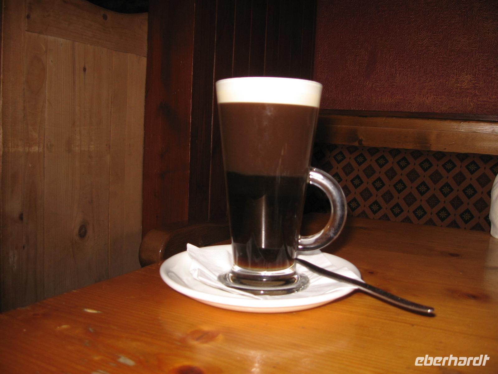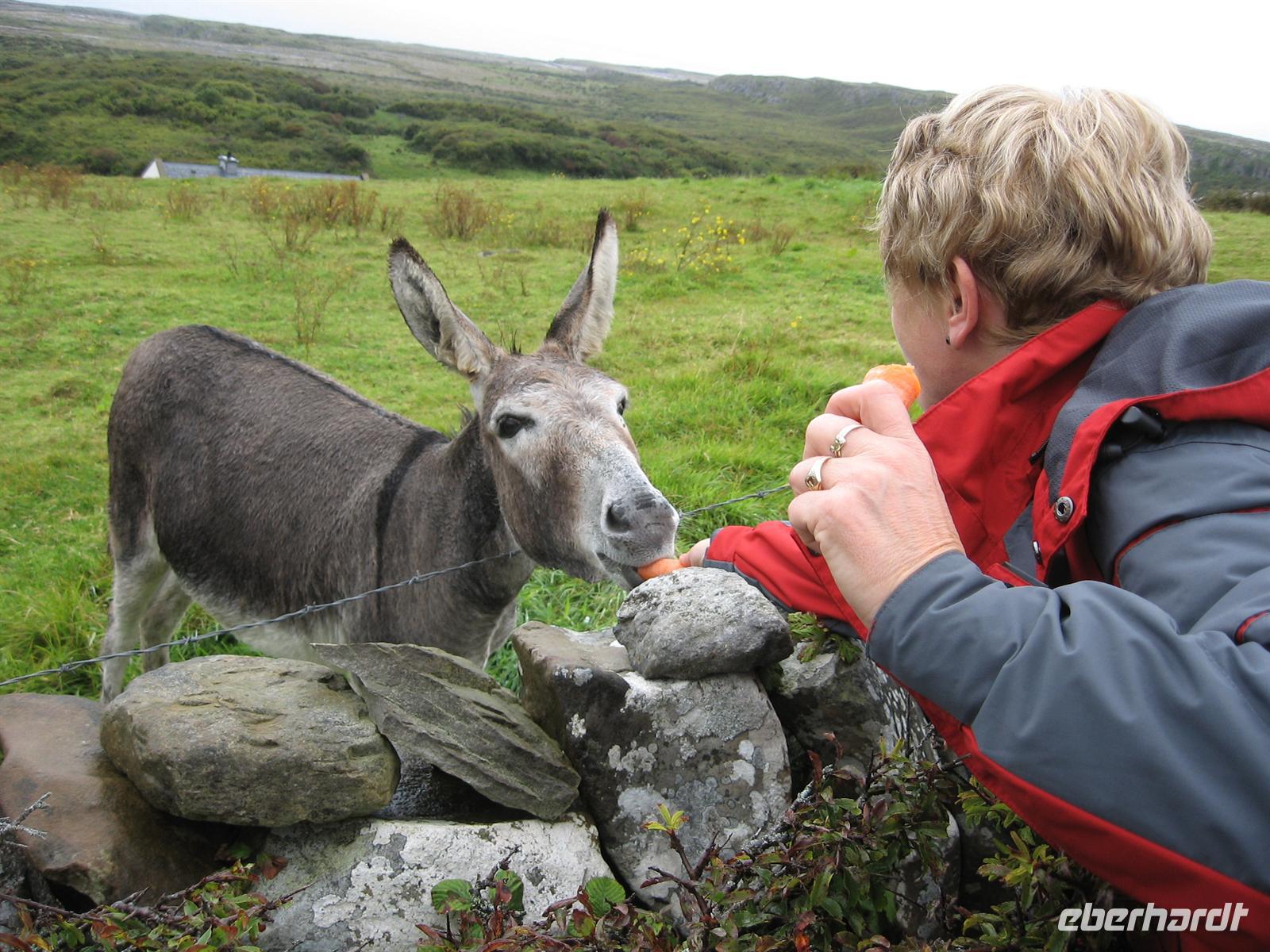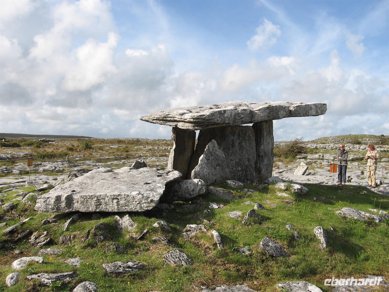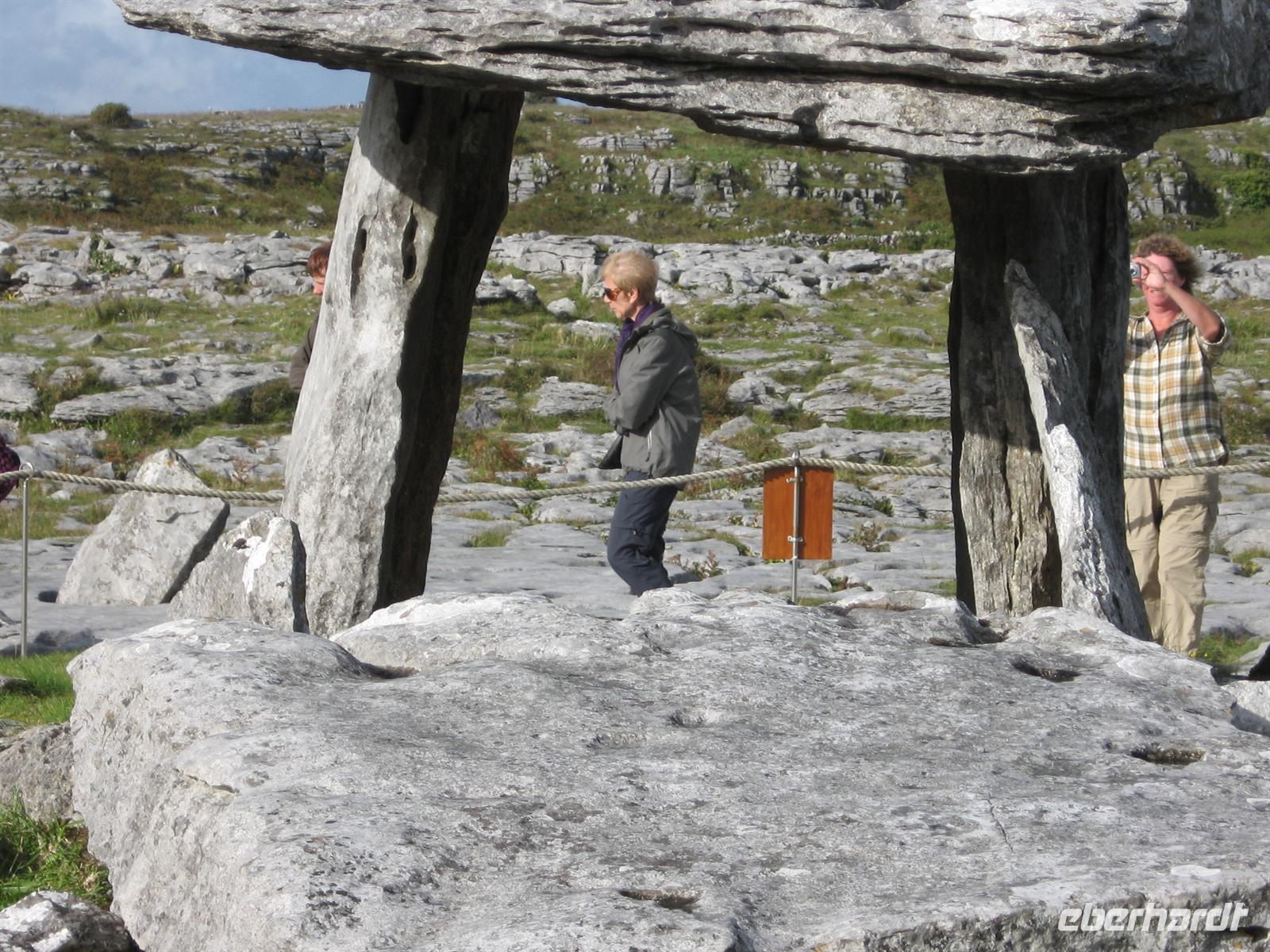 Danach heißt es noch einmal aufsteigen und über einen Hügel geht es ins nächste Tal hinein. Unterwegs haben wir auch immer wieder Pferde, Esel und Kühe auf Ihren Weiden getroffen, meistens kommen sie neugierig an um zu sehen was denn da los ist. Und unsere Möhren schmecken ihnen durchaus auch. Noch ein letzter lang gestreckter Anstieg ist zu überwinden und dann eröffnet sich uns wieder ein Blick auf das Meer, die Bucht von Galway liegt vor uns. Wir steigen steil ab und erreichen die Straße nach Ballynavaugh wo unser Bus wartet. Wir fahren die kurze Strecke bis ins Dorf Ballynavaugh und lassen uns in einem Pub einen Irish Coffee schmecken. Dieses Getränk ist 1934 von einem Barkeeper auf dem Flugplatz von Foyne erfunden wurden um Gäste, welche durch schlechte Wetterverhältnisse nicht fliegen konnten, bei Laune zu halten. Als diese fragten ob das brasilianischer Kaffee wäre antwortete der Barkeeper auf die schnelle es sei Irischer Kaffee. Zubereitet in einem Glas besteht er aus Whiskey, Zucker, Kaffee und Sahne. Getrunken wir der leicht schlürfend durch die Sahne. Auf dem Weg zum Hotel machen wir noch einen Stopp am Poulnabrone Dolmen, dem wahrscheinlich bekanntesten Fotoobjekt im Burren. Es handelt sich dabei um Portalgrab aus der Zeit um 2500 v.Ch.