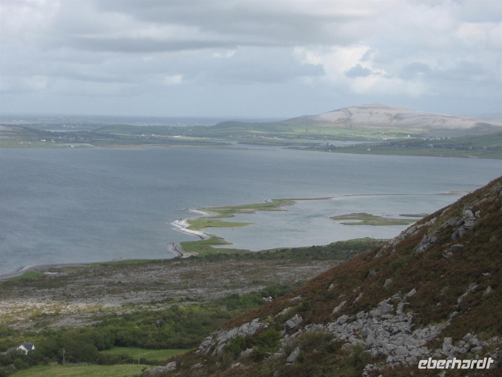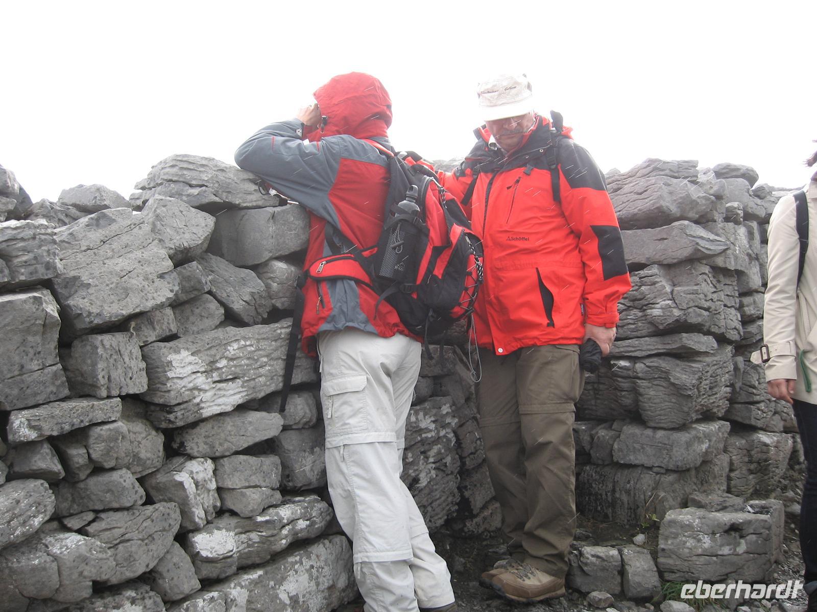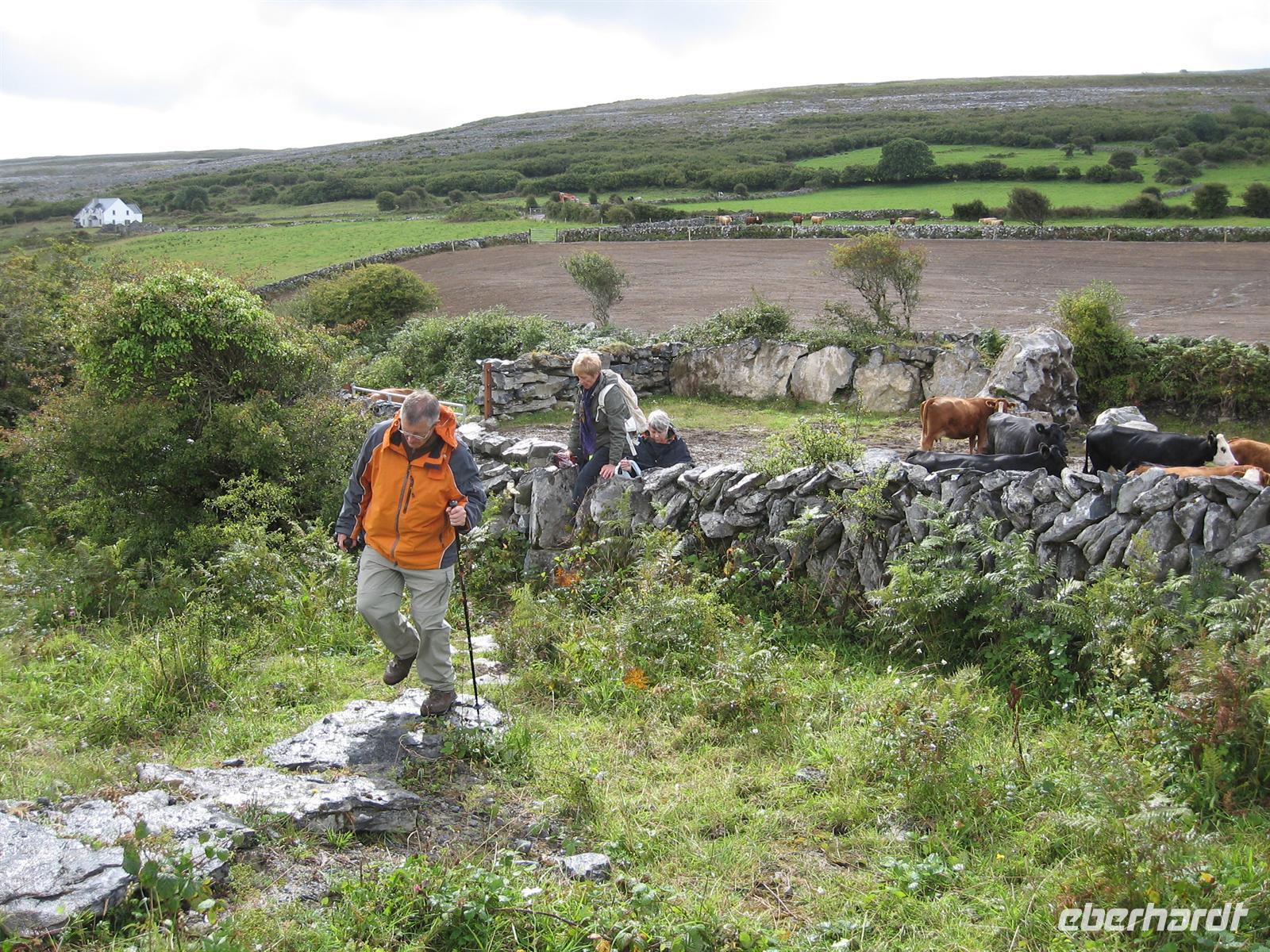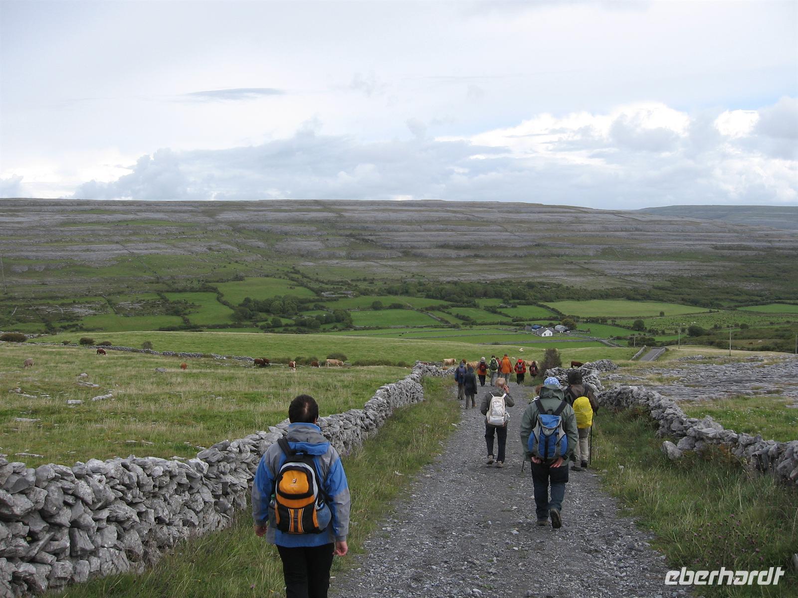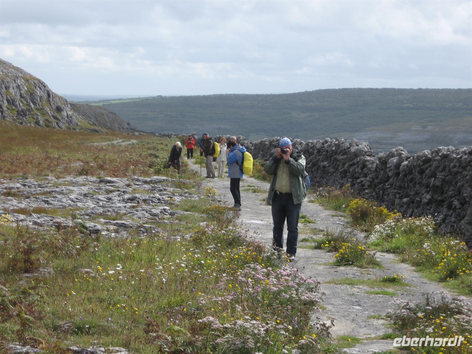 Am Morgen regnet es, aber ich bin froher Hoffnung. Und die soll sich auch erfüllen. Kurz nach dem wir unsere Wanderung begonnen haben hört es auf zu regnen. So können wir unsere Regenkleidung wieder ablegen und die Wanderung genießen. Startpunkt war in der Nähe des Ballynaklan Castle unweit von Lisdonvarna. Der Weg führt durch eine Streusiedlung und in der Ferne am westlichen Horizont können wir wieder die Aran Islands sehen, welche wir morgen besuchen werden. Langsam geht unser Weg in eine Green Road über, eine Grasstraße. Über diese hat man früher das Vieh von einem Ort zum anderen getrieben. Immer wieder schöne Ausblicke auf das Meer, vor uns ist der Strand von Fanore zu sehen. Langsam ändert sich auch die Landschaft, wir erreichen das Kaltsteinplateau des Burren. Dieses 160 km² große Gebiet ist einmalig in Irland, ein Karstgebiet. Manchmal hat man den Eindruck das es wie eine Mondlandschaft aussieht. Wir steigen hinab in ein kleines Tal und nutzen die Sitzgelegenheiten an einem, zur Zeit nicht vermieteten, Ferienhaus für unsere Mittagspause.
