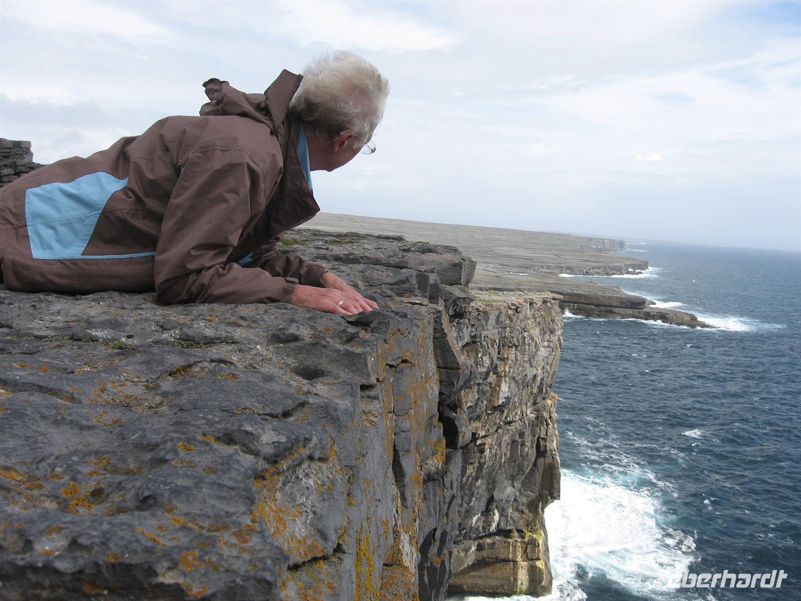 Unterwegs machen wir halt an Kirians Kapelle, einer kleinen Kirche, welche St. Kirian, der Gründer von Clonmacnoise, gestiftet haben soll. Später sehen wir in einem Teich nicht nur Höckerschwäne sondern auch die seltenen Singschwäne und wenig später können wir Robben beobachten, welche sich in der Sonne regeln. Unterwegs überrascht uns mal ein Regenschauer, aber so schnell wie diese kommen sind sie auch wieder weg. Unser Ziel, die Ringburg Dun Aengus kommt jetzt schon ins Blickfeld. Bevor wir zu ihr aufsteigen machen wir erstmal unsere Mittagspause im Café des Visitor Centers. Und dann geht es hinauf zum Ringfort. Es ist vor allem wegen seiner spektakulären Lage direkt an den Klippen interessant. Wer es erbaut hat ist nicht eindeutig klar, auch nicht wer Dun Aengus war. Der Name wurde erst im 20. Jh. vergeben. Nachdem man die innere Mauer hinter sich gelassen hat könnte man meinen man verlässt diese Welt, denn vor sich ist nur noch das Meer. Auf dem Bauch liegend darf man die Klippen hinab schauen, 100 Meter unter uns tost das Meer. Und natürlich lassen sich einige Gäste das auch nicht entgehen. Am Visitor Center wartet auf ein kleiner Bus und bringt uns zurück zum Hafen nach Kilronan. Wir fahren mit dem Schiff zurück nach Rosaveel und dann mit dem Bus noch eine Stunde nach Leenane, wo sich unser Hotel für die nächsten zwei Nächte befindet.