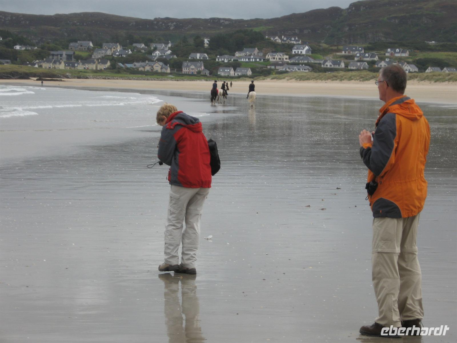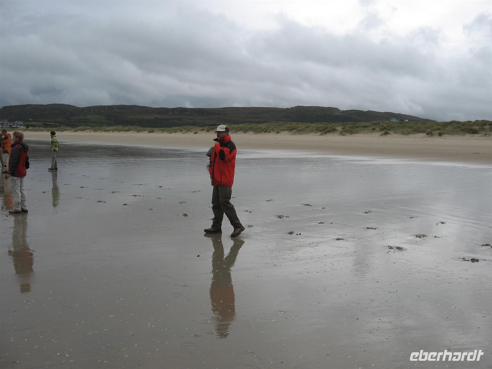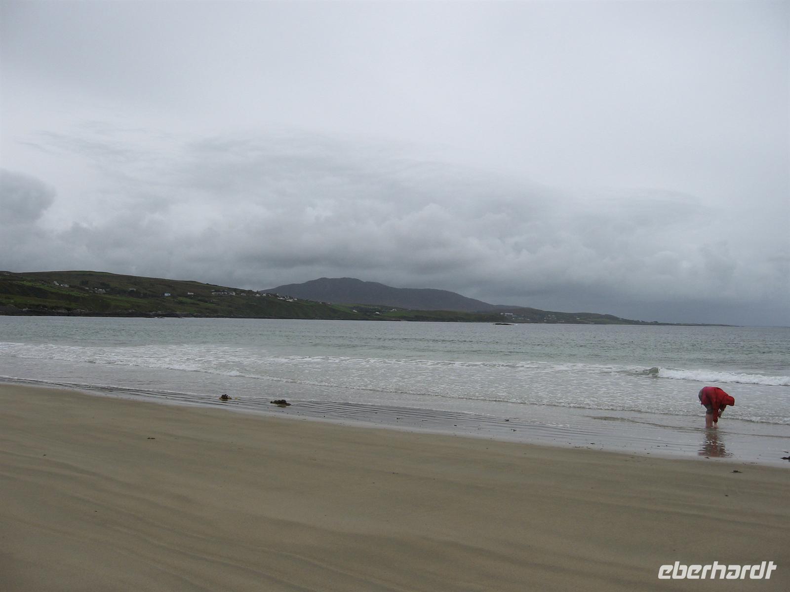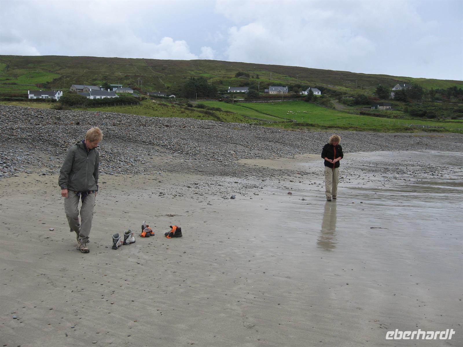 Entlang des Kilarry Harbour, dem einzigen Fjord Irlands wandern wir gut 9 Kilometer bis nach Rosroe. Faszinierende Blicke auf die Umgebung bieten sich auf Schritt und Tritt. Unterwegs sehen wir einen Muschelzuchtbetrieb. Ich bitte den Besitzer, das ich erklären kann wie es von statten geht. Der nette Ire erklärt mir gleich, das er daran denkt in Zukunft Führungen mit Muschelverkostung anzubieten. Denn Geld verdienen ist wichtig. Unterwegs stößt Roy zu uns, unser Busfahrer ist uns entgegen gelaufen. Wie schön, alle freuen sich darüber, auch wenn auf Grund der Sprachbarriere die Kommunikation gering ist. Zurück am Bus treffen wir auch eine Ehepaar wieder, welches eine kleinere Runde gehen wollte. Da der Nachmittag noch früh ist fahren wir noch zu einem Sandstrand ganz in der Nähe. Wir genießen es alle und, natürlich findet jeder ein paar Muscheln. Dann kommt die Flut an den Strand und wir können gar nicht schnell genug Land gewinnen. Einige Gäste unserer Gruppe müssen einen Umweg zum Bus machen, da die beiden Strandteile durch das steigende Wasser getrennt sind. Als wir uns mit dem Bus in Bewegung setzen beginnt es zu regnen, der regen wird die ganze Nacht anhalten. Zum Abendessen lassen wir uns wieder die hervorragende Küche schmecken.