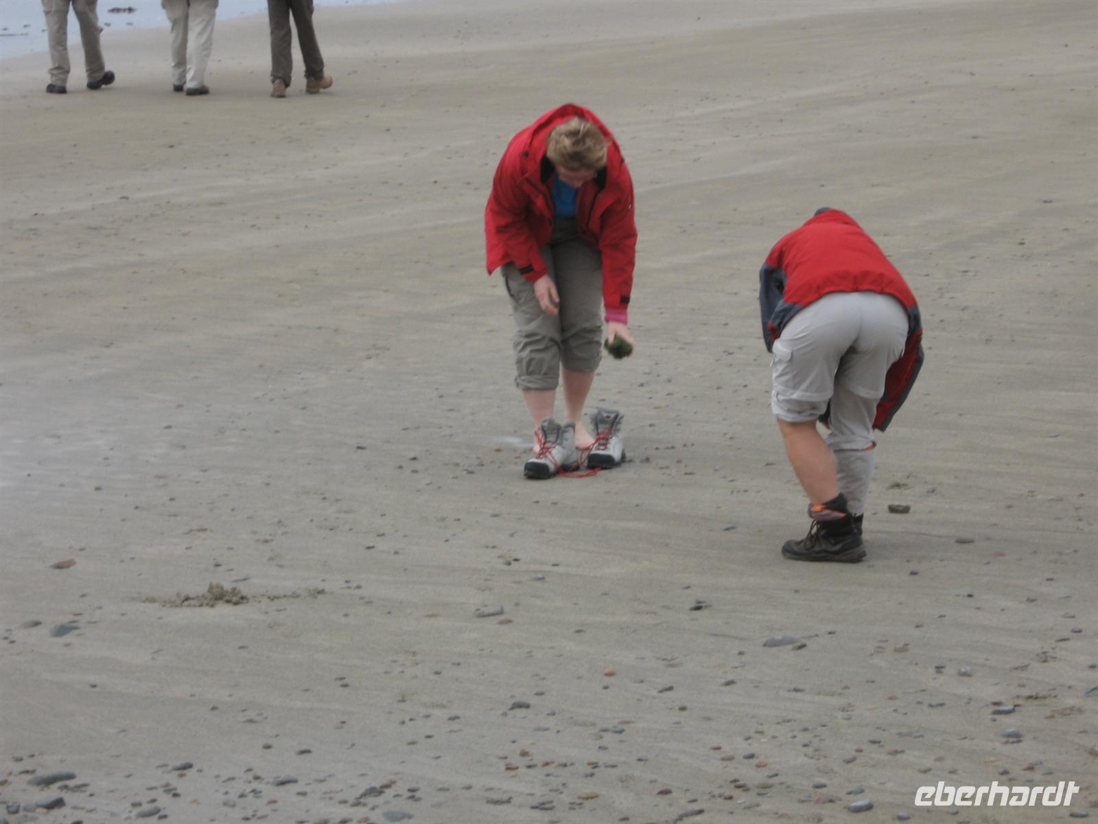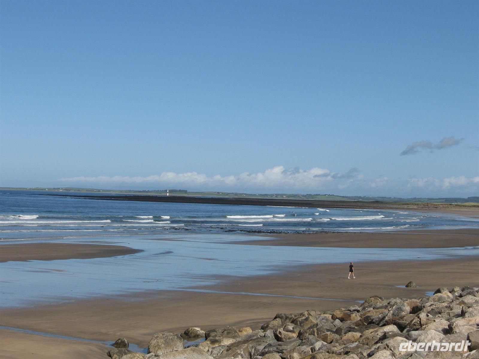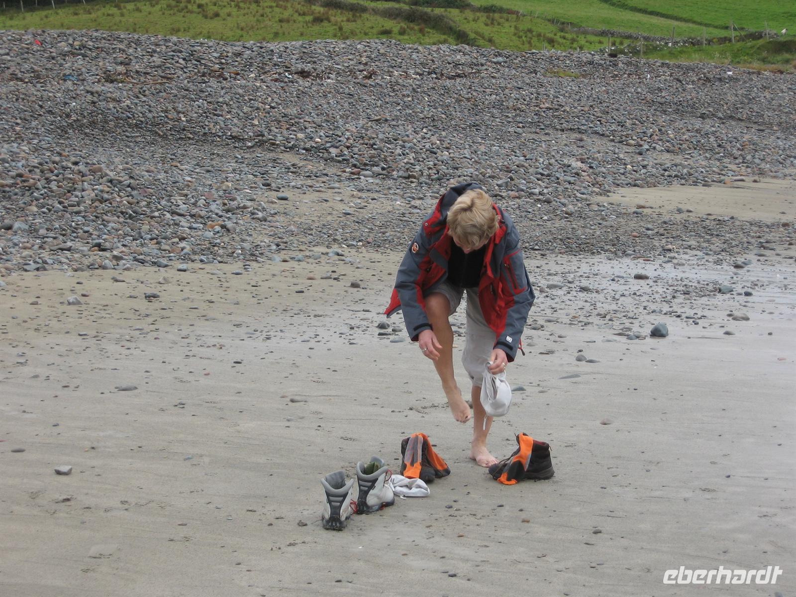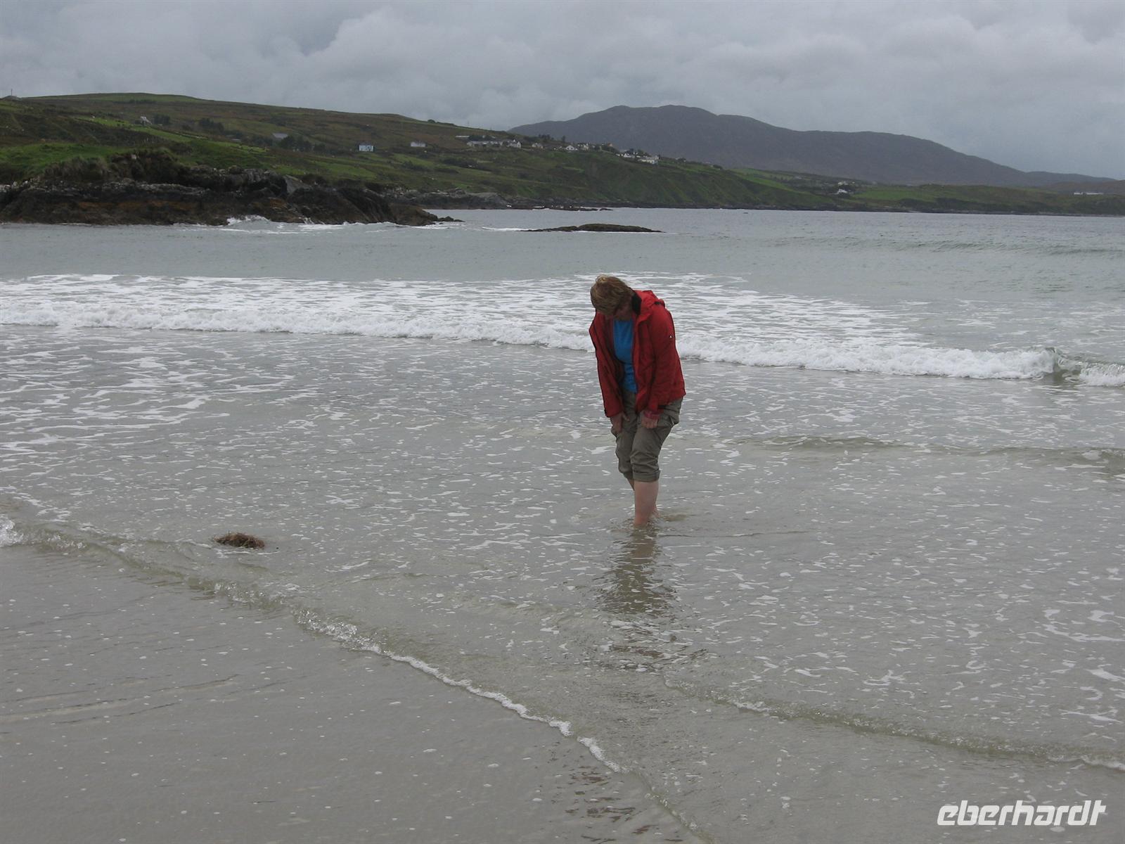 Entlang des Kilarry Harbour, dem einzigen Fjord Irlands wandern wir gut 9 Kilometer bis nach Rosroe. Faszinierende Blicke auf die Umgebung bieten sich auf Schritt und Tritt. Unterwegs sehen wir einen Muschelzuchtbetrieb. Ich bitte den Besitzer, das ich erklären kann wie es von statten geht. Der nette Ire erklärt mir gleich, das er daran denkt in Zukunft Führungen mit Muschelverkostung anzubieten. Denn Geld verdienen ist wichtig. Unterwegs stößt Roy zu uns, unser Busfahrer ist uns entgegen gelaufen. Wie schön, alle freuen sich darüber, auch wenn auf Grund der Sprachbarriere die Kommunikation gering ist. Zurück am Bus treffen wir auch eine Ehepaar wieder, welches eine kleinere Runde gehen wollte. Da der Nachmittag noch früh ist fahren wir noch zu einem Sandstrand ganz in der Nähe. Wir genießen es alle und, natürlich findet jeder ein paar Muscheln. Dann kommt die Flut an den Strand und wir können gar nicht schnell genug Land gewinnen. Einige Gäste unserer Gruppe müssen einen Umweg zum Bus machen, da die beiden Strandteile durch das steigende Wasser getrennt sind. Als wir uns mit dem Bus in Bewegung setzen beginnt es zu regnen, der regen wird die ganze Nacht anhalten. Zum Abendessen lassen wir uns wieder die hervorragende Küche schmecken.