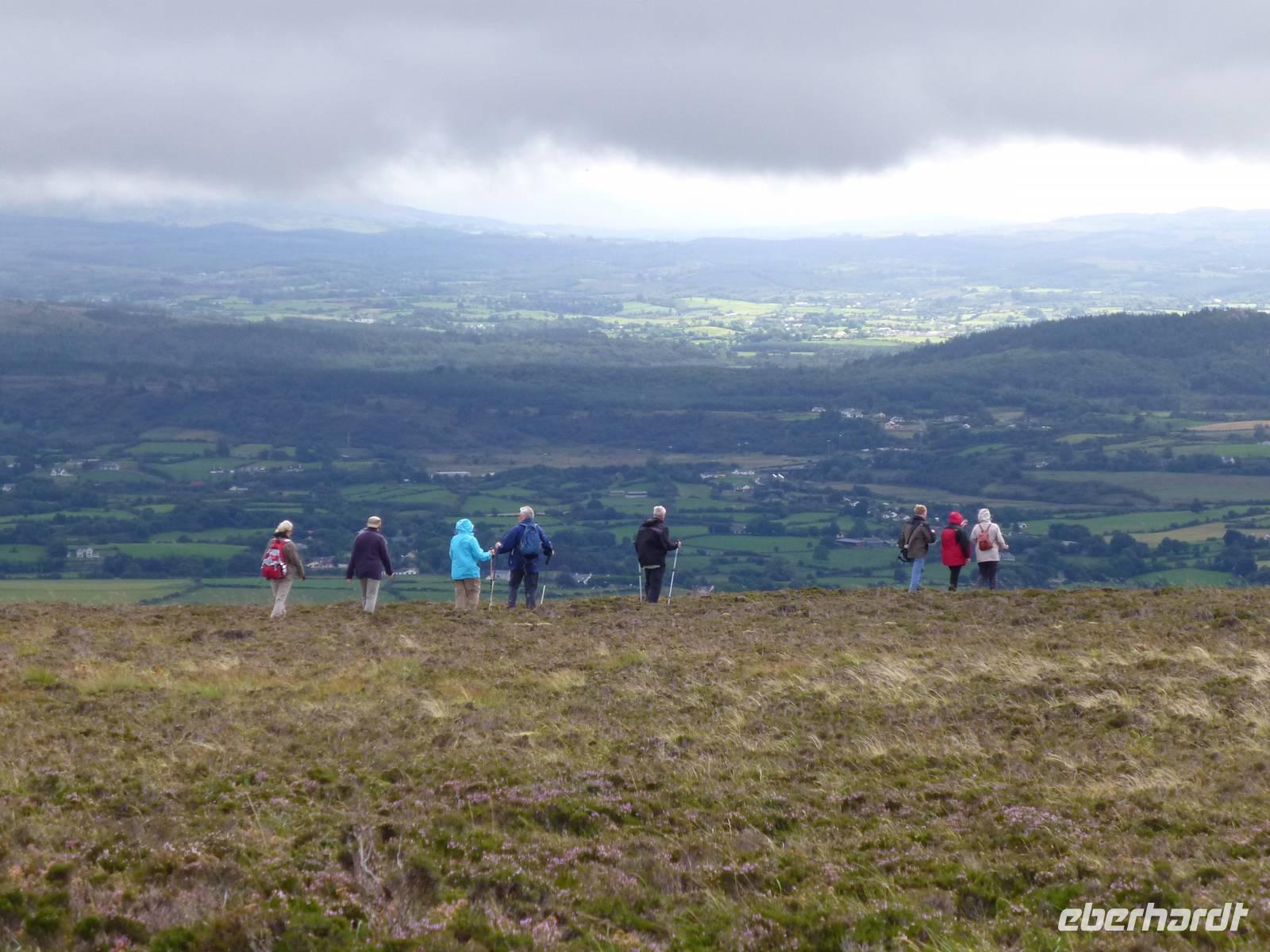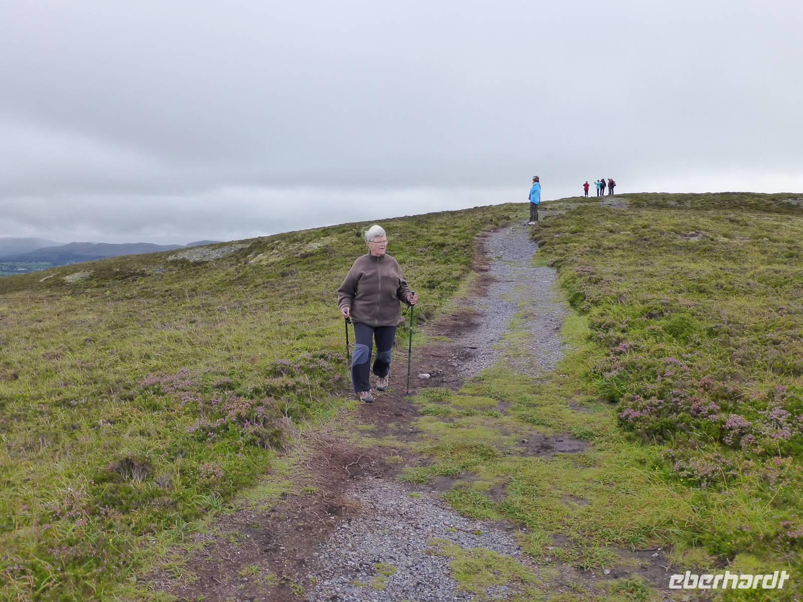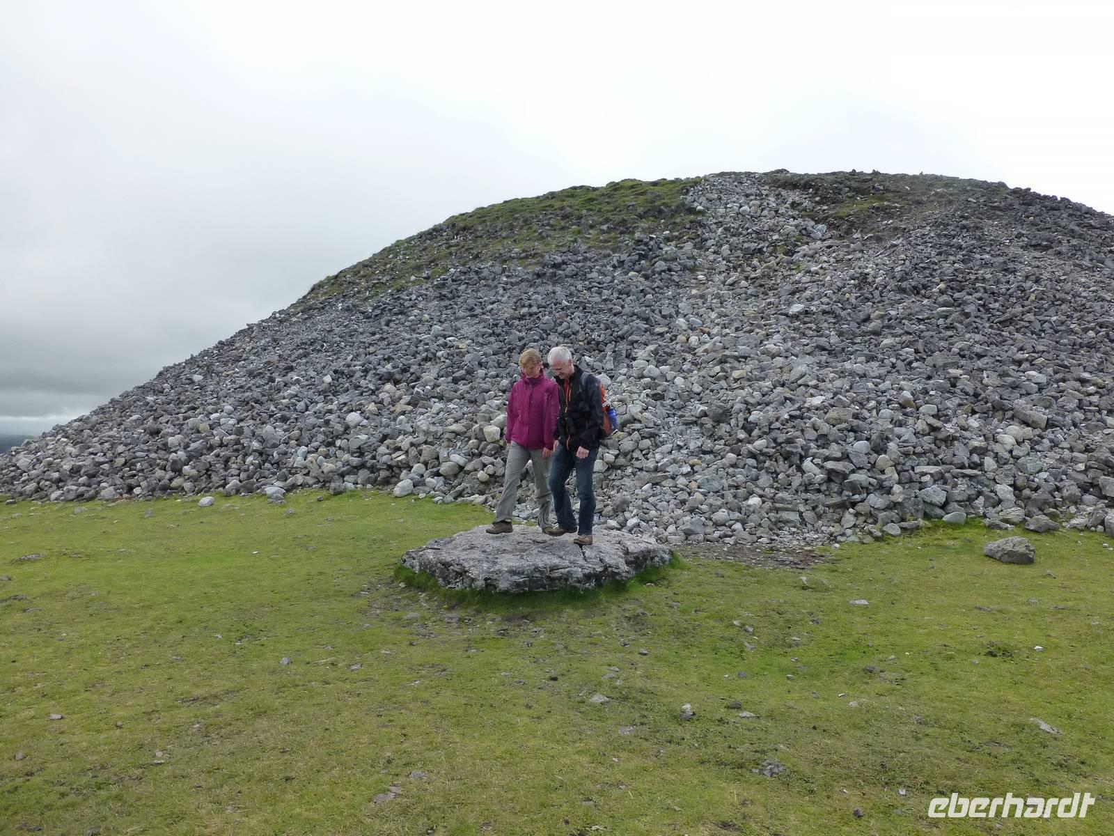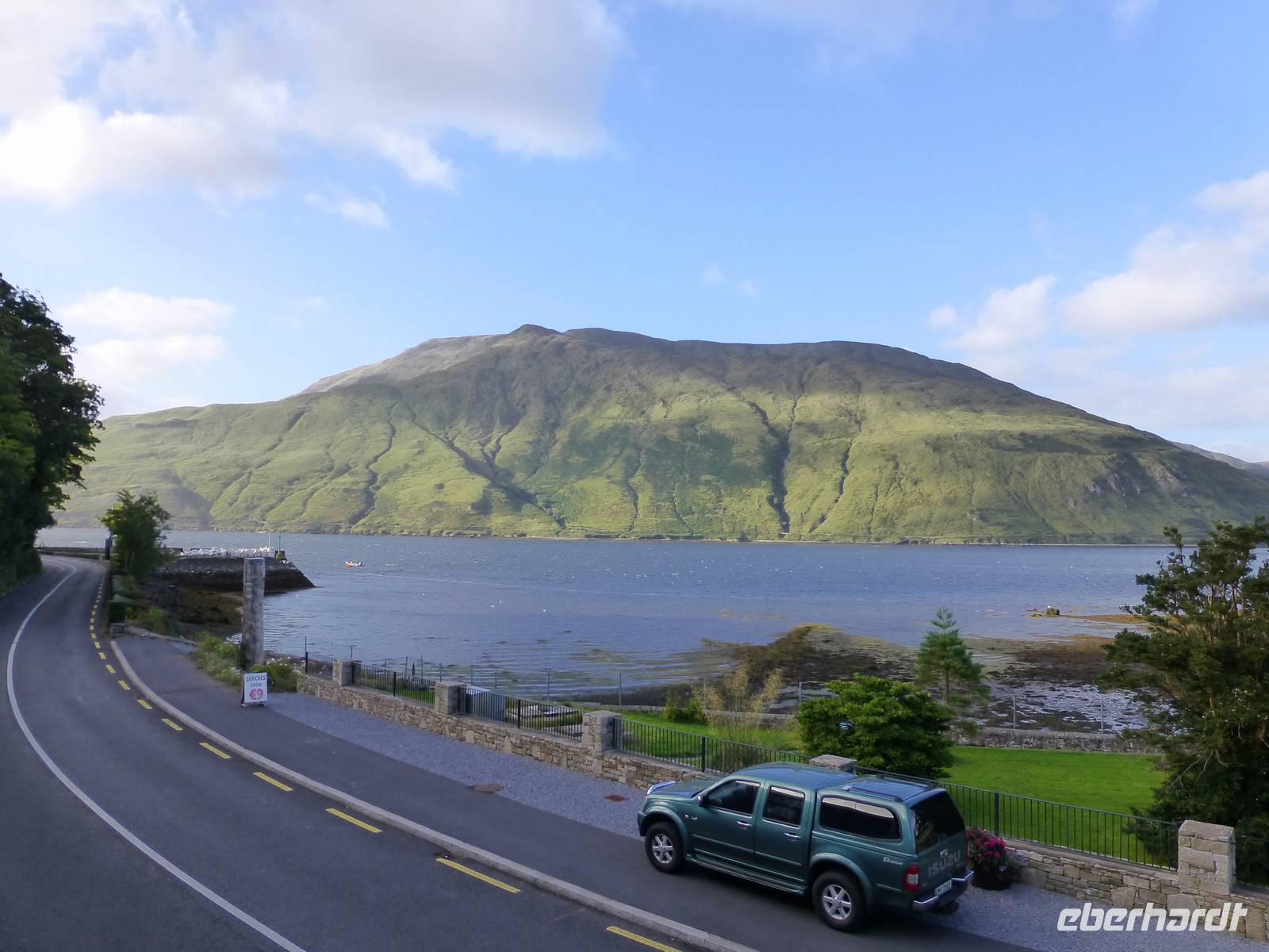 Von Letterkenny brechen wir auf nach Süden, unser Ziel heute heute Leenaun. Unser erster Halt wird in Drumcliff sein. Das Wetter zeigt sich am Morgen mit feinstem Sprühregen. Dieser setzt sich auch an den Bergen fest, so das man den markanten Ben Bulben nur erahnen kann. Unterhalb des Tafelberges Ben Bulben befindet sich im Ort Drumcliff ein kleiner Friedhof mit dem bescheidenen Grab des irischen Schriftstellers William Butler Yeats. Es war sein Wunsch an dieser Stelle begraben zu sein. Auf seinem Grabstein befindet sich eine der berühmtesten selbst verfassten Grabinschriften der Welt: „Wirf einen kalten Blick, auf Leben, auf Tot, Reiter und dann ziehe weiter". Unser nächstes Ziel ist der Berg Knocknarea bei Sligo. Er ist ein markanter Punkt und schon von weiten sieht man ihn. Der Aufstieg auf den Knocknarea ist unkompliziert, in etwas über 30 Minuten sind wir schon oben. Auf dem Gipfel findet sich ein von Menschenhand aufgetürmter Steinhaufen, ein Cairn. Es soll das Grab der einst mächtigen Königin Maeve sein. Wir genießen die Aussicht auf die Sligo Bay und den im Sonnenschein liegenden kleinen Ort Strandhill, wo wir wenig später unsere Mittagspause machen werden. In Westport nutzen wir die Zeit etwas zum bummeln und der eine oder andere von uns hat findet ein Souvenir für zu Hause. Auf dem Weg von Westport zu unserem Übernachtungsort Leenaun haben wir einen schönen Blick auf den heiligen Berg Irlands, den Croagh Patrick. Der Legende nach soll Irlands Nationalheiliger auf dem Berg 40 Tage und Nächte verbracht haben auf der Findung mit sich selbst. Nachdem ihm klar war, das er dem irischen Volk das Christentum bringen muss hat er mit einer Glocke geläutet und dabei ist die Schlange, sie galt als die Hüterin der Weisheit, erschrocken und von der Insel geflohen. Und so gibt es bis heute keine Schlangen in Irland.