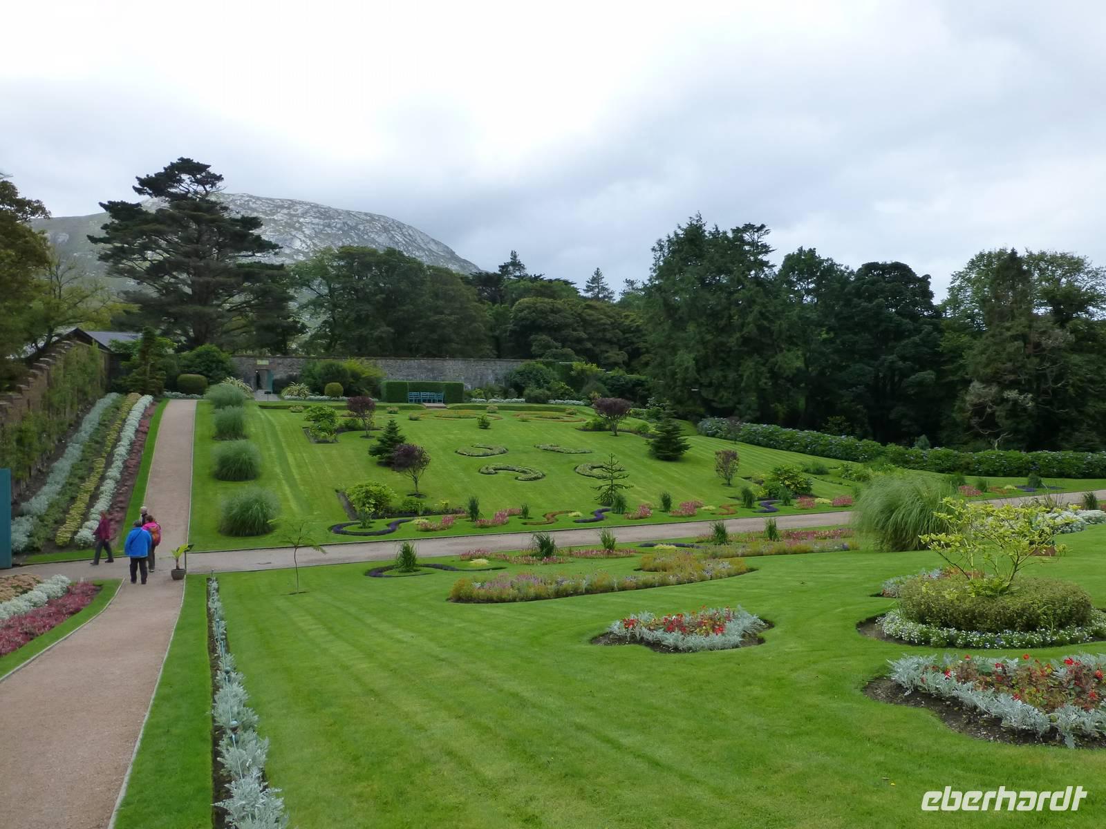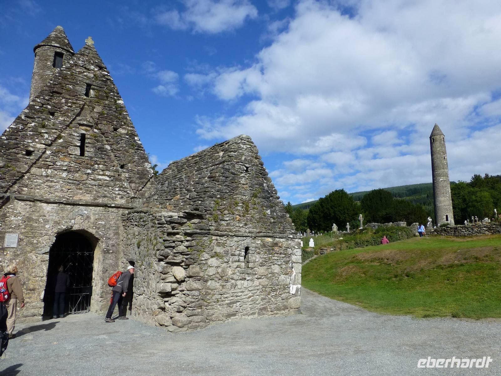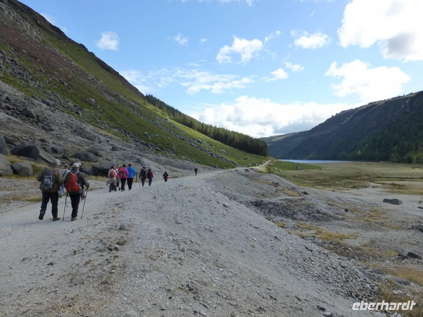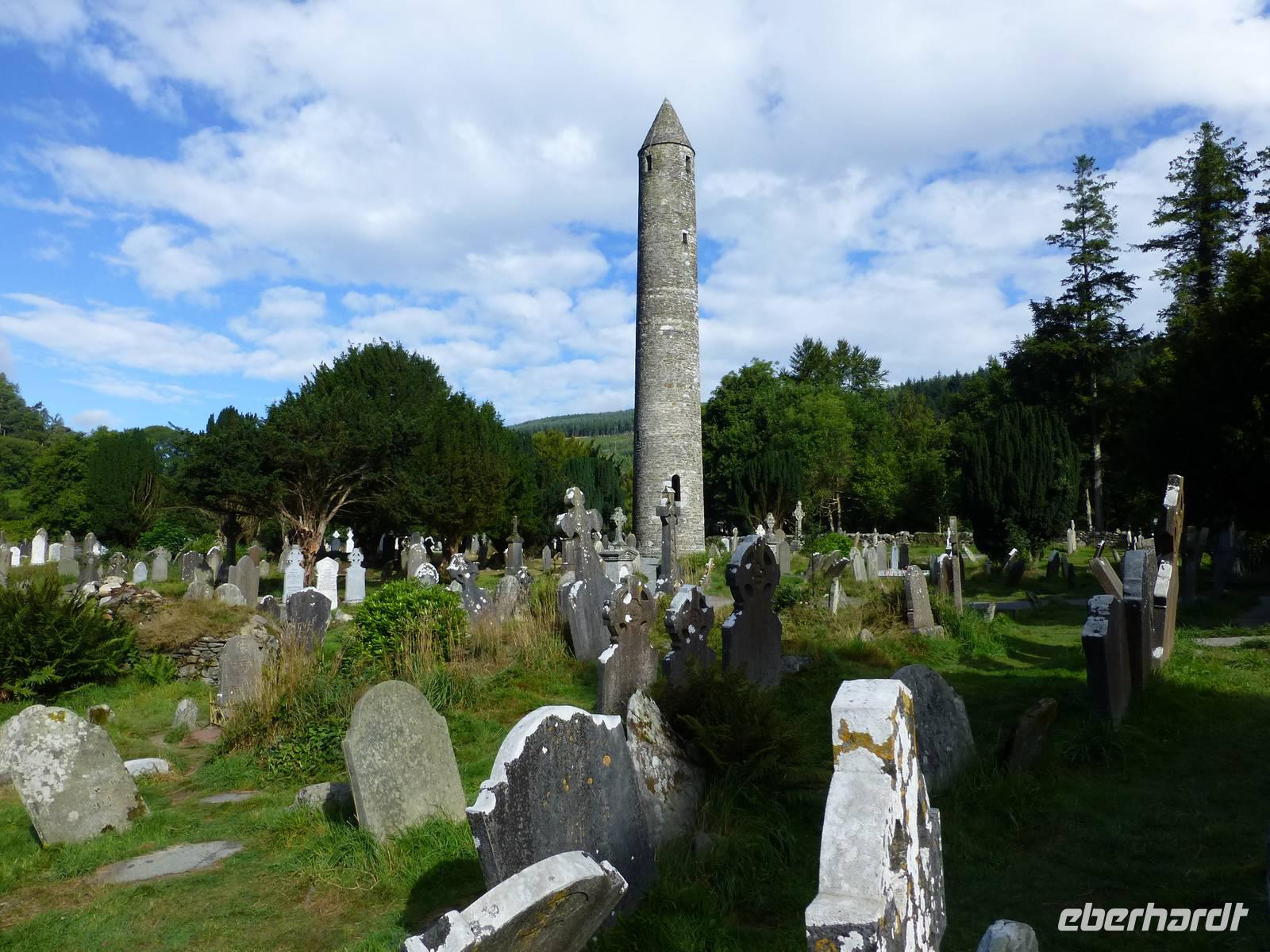 Nach einem guten Frühstück fahren wir nach Glendalough. Hier befand sich eines der wichtigsten frühchristlichen Klöster Irlands, gegründet im 6. Jh. durch St. Kevin. Der christliche Glaube kam durch Patrick vom europäischen Festland nach Irland, verbreitete sich hier und wurde dann von irischen Mönchen wieder auf das europäische Festland zurück gebracht und in den Gebieten, welche nicht unter römischer Herrschaft gestanden haben, verbreitet. Im Visitor Center sehen wir einen Film der darüber und natürlich auch über die Entstehung des Klosters hier berichtet. Anschließend gehen wir gemeinsam mit Fiona, einer deutsch sprechenden Führerin, durch das Klostergelände. Sie zeigt und erklärt uns den Eingang zum Kloster, den Rundturm, die Kathedrale und Kevin Church. Mit Charme und Witz bringt sie uns die Geschichte näher. Das Wetter übrigens meint es mit uns überaus gut und so wandern wir entlang des Lower und des Upper Lake bis zum ehemaligen Miners Village, wo sich einige verfallene Gebäude einer längst geschlossenen Bleimine. Der Wind bläst uns vom Wicklow Gap herunter kräftig ins Gesicht, wir drehen um und laufen zurück zum Café am Upper Lake. Den Nachmittag nutzen wir zur Besichtigung von Powerscourt Garden, dem vielleicht schönsten angelegten Garten in Irland. Bei Sonnenschein genießen wir die wunderschöne Anlage, wandeln durch die einzelnen Gartenteile, den italienischen und japanischen Garten, den Walled Garden mit seiner Blütenpracht. Am Abend erwartet uns dann noch einmal ein ausgezeichnetes Abendessen.
