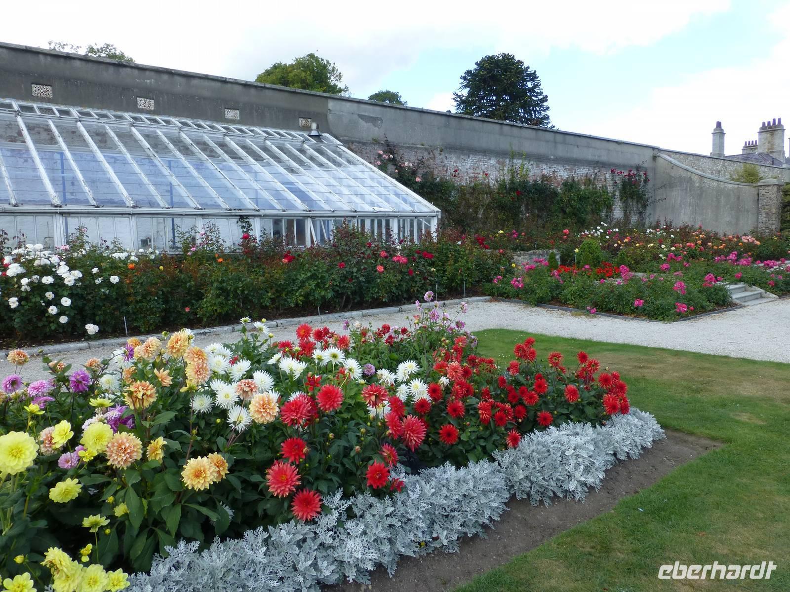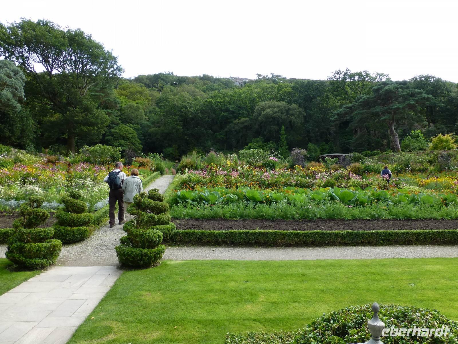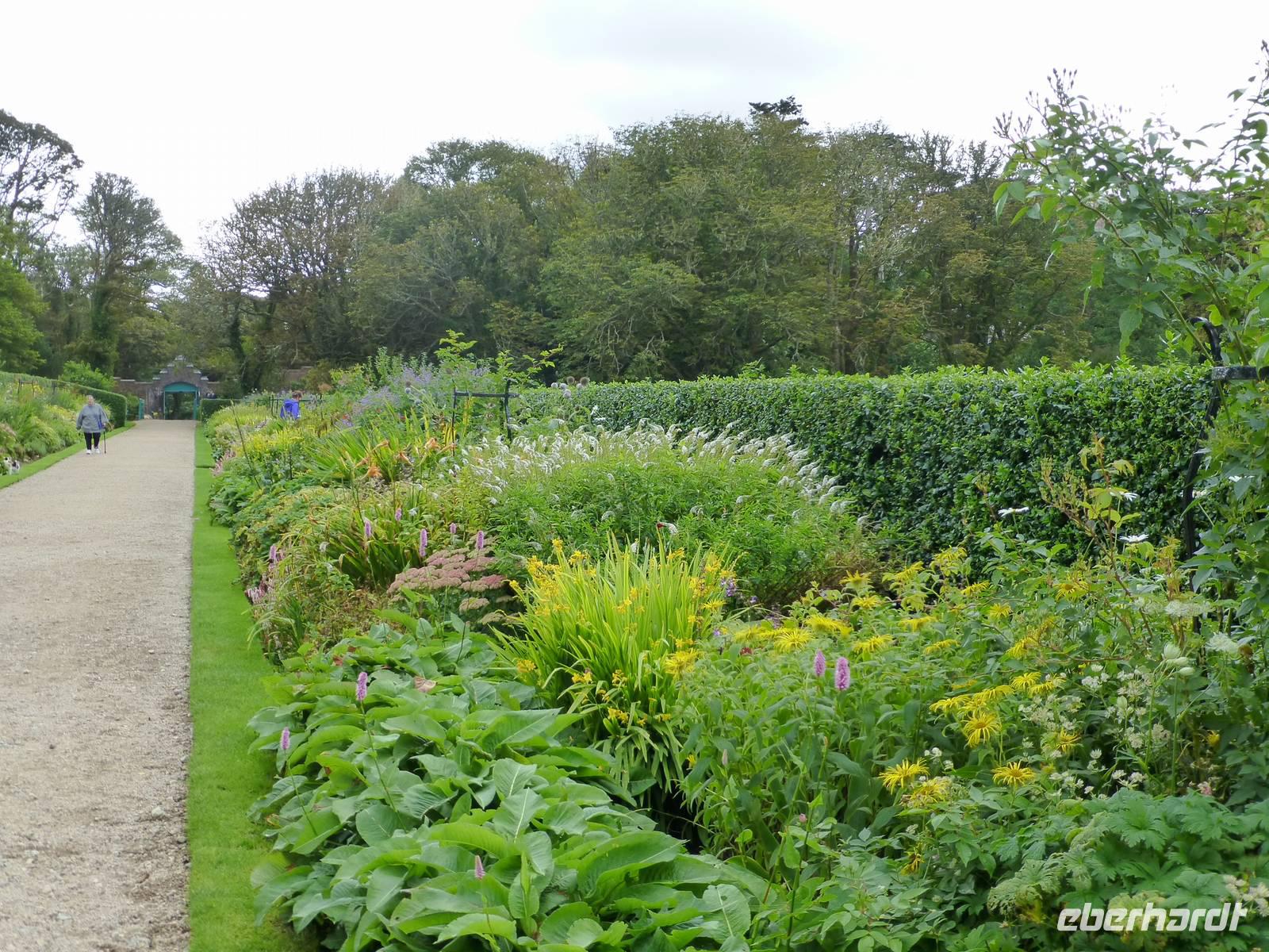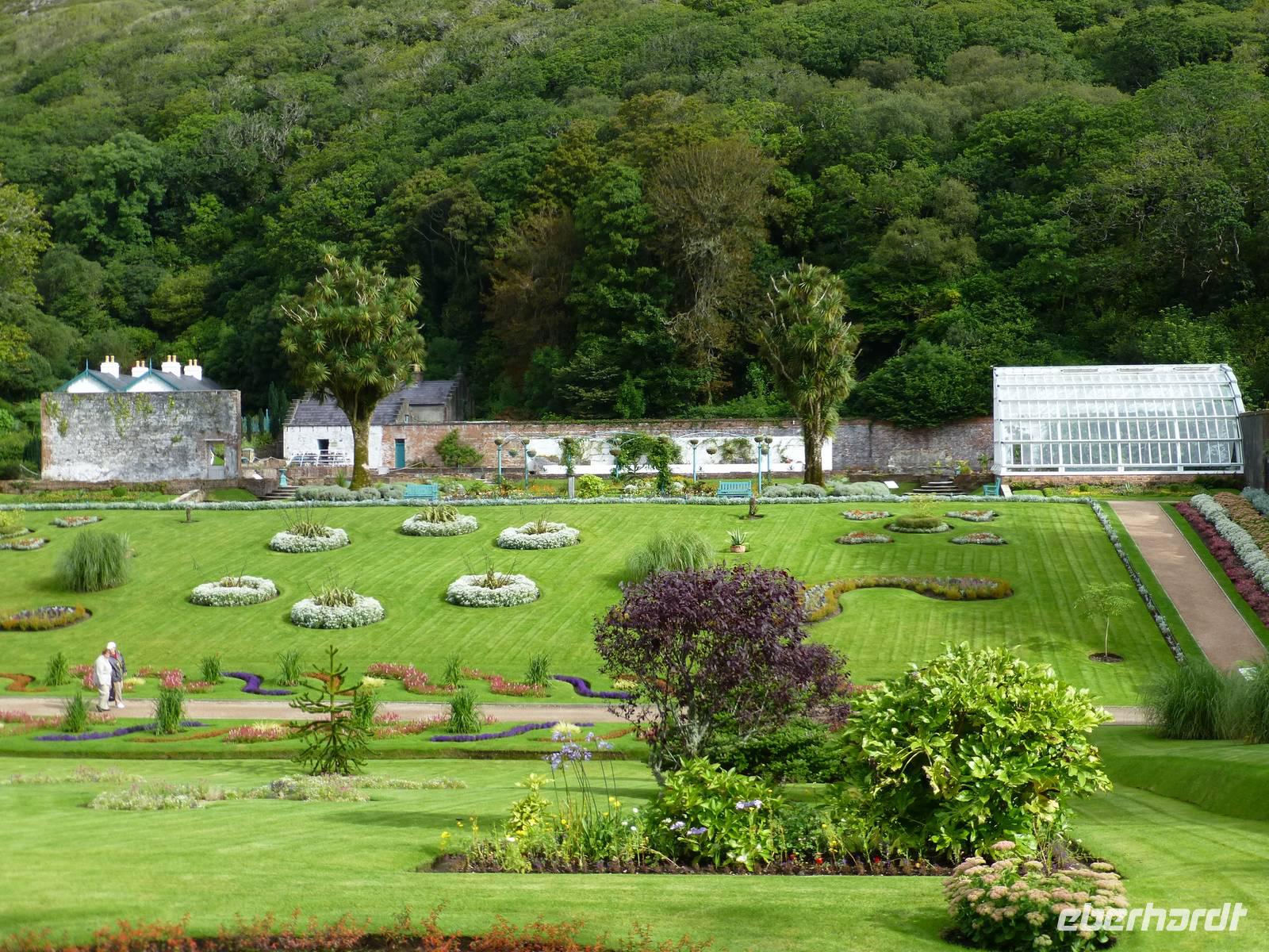 Nach einem guten Frühstück fahren wir nach Glendalough. Hier befand sich eines der wichtigsten frühchristlichen Klöster Irlands, gegründet im 6. Jh. durch St. Kevin. Der christliche Glaube kam durch Patrick vom europäischen Festland nach Irland, verbreitete sich hier und wurde dann von irischen Mönchen wieder auf das europäische Festland zurück gebracht und in den Gebieten, welche nicht unter römischer Herrschaft gestanden haben, verbreitet. Im Visitor Center sehen wir einen Film der darüber und natürlich auch über die Entstehung des Klosters hier berichtet. Anschließend gehen wir gemeinsam mit Fiona, einer deutsch sprechenden Führerin, durch das Klostergelände. Sie zeigt und erklärt uns den Eingang zum Kloster, den Rundturm, die Kathedrale und Kevin Church. Mit Charme und Witz bringt sie uns die Geschichte näher. Das Wetter übrigens meint es mit uns überaus gut und so wandern wir entlang des Lower und des Upper Lake bis zum ehemaligen Miners Village, wo sich einige verfallene Gebäude einer längst geschlossenen Bleimine. Der Wind bläst uns vom Wicklow Gap herunter kräftig ins Gesicht, wir drehen um und laufen zurück zum Café am Upper Lake. Den Nachmittag nutzen wir zur Besichtigung von Powerscourt Garden, dem vielleicht schönsten angelegten Garten in Irland. Bei Sonnenschein genießen wir die wunderschöne Anlage, wandeln durch die einzelnen Gartenteile, den italienischen und japanischen Garten, den Walled Garden mit seiner Blütenpracht. Am Abend erwartet uns dann noch einmal ein ausgezeichnetes Abendessen.