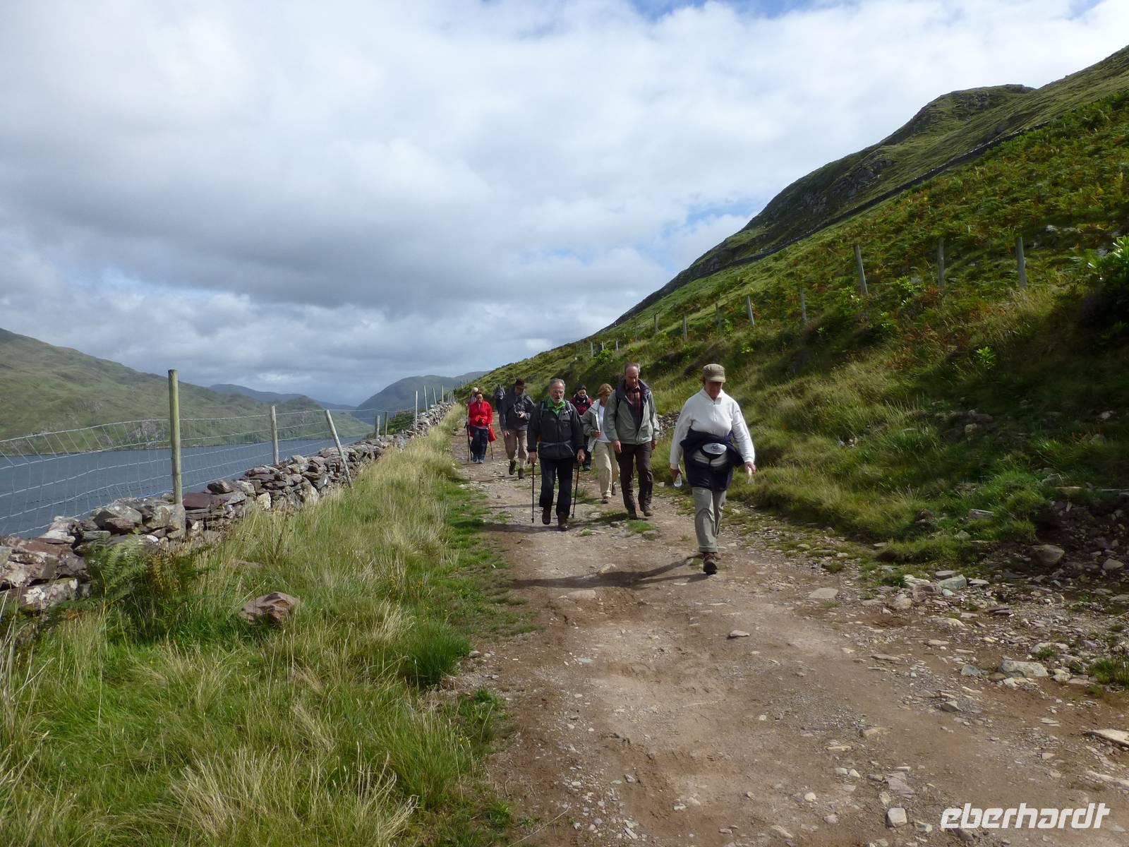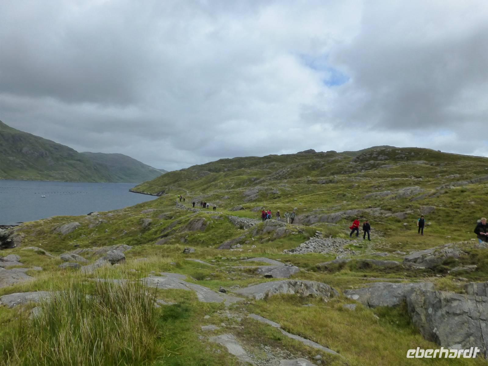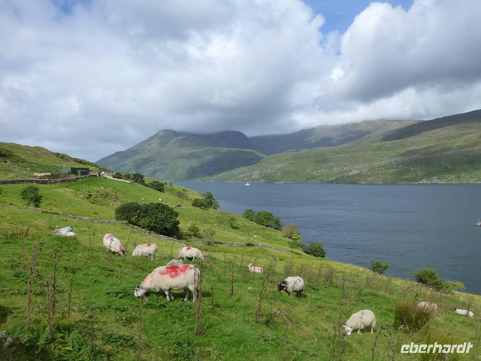 Wir werden heute ein Stück der Conemara Region für uns entdecken. Nach einem guten Frühstück kann es losgehen. Unser Buschauffeur Roy fährt uns erstmal zur Kylemore Abbey. Dabei handelt es sich nicht um eine Abtei im eigentlichen Sinne, sondern um ein von Benediktinern bis 2010 betriebenes internationale Mädchenpensionat. Die Lage des von Henry Mitchel erbauten Gebäudes ist einfach toll. Bei einer Besichtigung können wir das Abteigebäude, die neugotische Kirche und auch den Viktorianischen Garten sehen. Anschließend fahren ein paar Kilometer weiter zum Conemara Nationalpark. Im Nationalparkzentrum erhalten wir Informationen zu den Bogs, den Torffeldern. Unterwegs sind diese uns immer wieder begegnet. Jetzt können wir lernen, wie der Torf entstanden ist, wie er abgebaut wird und welches Leben im Torf herrscht. Das alles kostest übrigens keinen Eintritt, es wird vom irischen Staat finanziert. Wir nutzen gleich noch die Möglichkeit hier unsere Mittagspause zu machen, da wir alle Annehmlichkeiten auf einem Fleck haben. Jetzt heißt es endlich wandern. Entlang des Kilarry Harbour, dem einzigen Fjord Irlands wandern wir gut 9 Kilometer bis nach Rosroe. Faszinierende Blicke auf die Umgebung bieten sich auf Schritt und Tritt. Unterwegs sehen wir einen Muschelzuchtbetrieb. Unterwegs stößt Roy zu uns, unser Busfahrer ist uns entgegen gelaufen. Wie schön, alle freuen sich darüber, auch wenn auf Grund der Sprachbarriere die Kommunikation gering ist. Allen Gästen ist nach der Wanderung eigentlich nach einem Kaffee, aber leider bietet das dünn besiedelte Gebiet kein Kaffee wie wir es uns vorstellen. Da der Nachmittag noch früh ist fahren wir noch zu einem Sandstrand ganz in der Nähe. Wir genießen es alle und, natürlich findet jeder ein paar Muscheln. Zum Abendessen lassen wir uns wieder durch die hervorragende Küche des Leenaun Hotels verwöhnen.