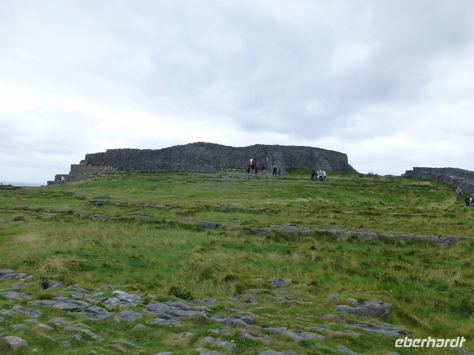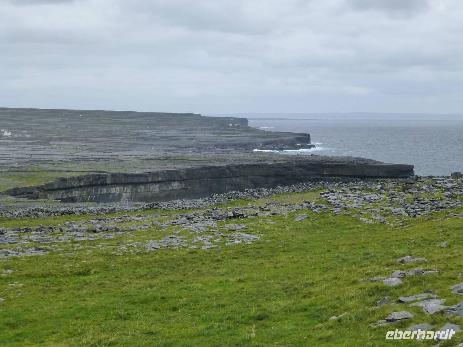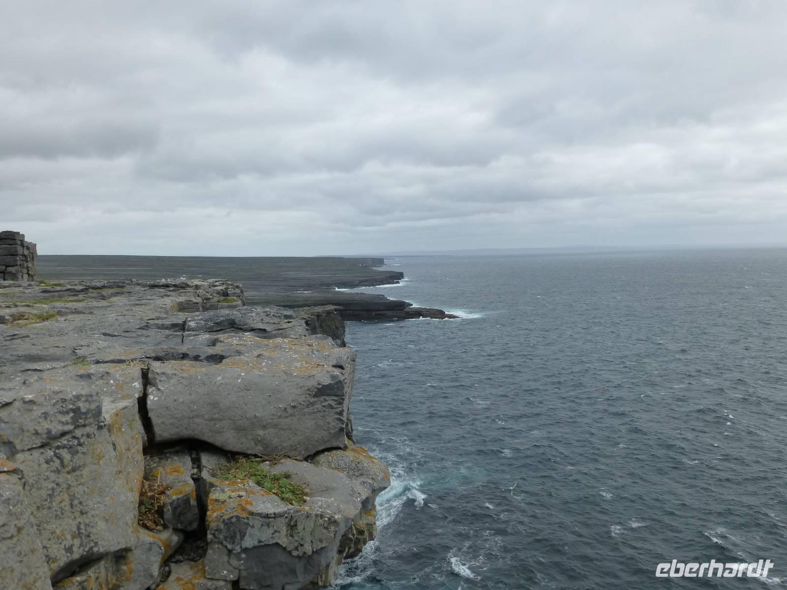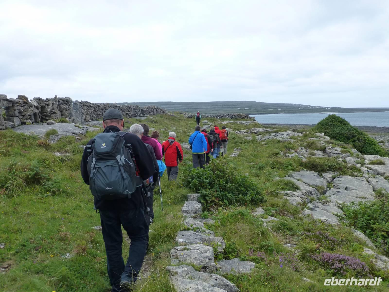 Heute heißt es zeitiger abreisen. Wir wollen die Aran Islands besuchen, genauer die Insel Inishmore. Dazu müssen wir zum Hafen nach Rosaveel fahren, von dort fährt das Schiff ab. Im Hafen angekommen können wir gleich das Schiff besteigen, auch wenn es noch einige Minuten bis zur Abfahrt dauert. Das Wetter sich zu halten, es wird an diesem Tag auch keinen Regen geben. Die Überfahrt ist dann doch ganz schön stürmisch und wir sind froh als wir den Hafen im kleinen Inselhauptort Kilronan erreichen. Wir wandern immer entlang der Nordküste, der Wanderweg führt hier entlang der Straße. Es herrscht allerdings kaum Verkehr, mal ein PKW oder auch eine Kutsche die Gäste transportiert. Unterwegs machen wir halt an Kirians Kapelle, einer kleinen Kirche, welche St. Kirian, der Gründer von Clonmacnoise, gestiftet haben soll. Später sehen wir in einem Teich nicht nur Höckerschwäne sondern auch die seltenen Singschwäne und wenig später können wir Robben beobachten, welche sich in der Sonne regeln. Unterwegs überrascht uns mal ein Regenschauer, aber so schnell wie diese kommen sind sie auch wieder weg. Unser Ziel, die Ringburg Dun Aengus kommt jetzt schon ins Blickfeld. Bevor wir zu ihr aufsteigen machen wir erstmal unsere Mittagspause im Café des Visitor Centers. Und dann geht es hinauf zum Ringfort. Es ist vor allem wegen seiner spektakulären Lage direkt an den Klippen interessant. Wer es erbaut hat ist nicht eindeutig klar, auch nicht wer Dun Aengus war. Der Name wurde erst im 20. Jh. vergeben. Nachdem man die innere Mauer hinter sich gelassen hat könnte man meinen man verlässt diese Welt, denn vor sich ist nur noch das Meer. Auf dem Bauch liegend darf man die Klippen hinab schauen, 100 Meter unter uns tost das Meer. Und natürlich lassen sich einige Gäste das auch nicht entgehen. Am Visitor Center wartet auf ein kleiner Bus und bringt uns zurück zum Hafen nach Kilronan. Wir fahren mit dem Schiff zurück nach Rosaveel und dann mit dem Bus noch eine gute Stunde nach Gort, wo sich unser Hotel für die nächsten zwei Nächte befindet. Inzwischen fahren wir schon am Meer entlang, die Bucht von Galway immer zu unserer Rechten und wir können die Berge des Burren sehen, wo wir morgen wandern werden.Auf unserem Weg kommen wir an Galway vorbei, der viertgrößten Stadt Irlands. Hier ist immer viel Betrieb. „Stolz wie ein Kaufmann aus Galway" war hier früher ein geflügeltes Wort, war die Stadt doch vor allem im 14.-16. Jh. eine wichtiger Umschlagplatz für Wein. Das heute noch benutzte Wort „Lynchjustiz" soll ebenfalls von hier stammen. James Lynch Fitzstephen, Bürgermeister und oberster Richter der Stadt im 16. Jh., soll seinen Sohn Walter eigenhändig erhängt haben als der Scharfrichter sich weigerte es zu tun. Walter war des Mordes an einem spanischen Seemann angeklagt und der Vater war ein strenger Richter und ließ keine Gnade ergehen, auch nicht bei seinem eigenen Sohn.