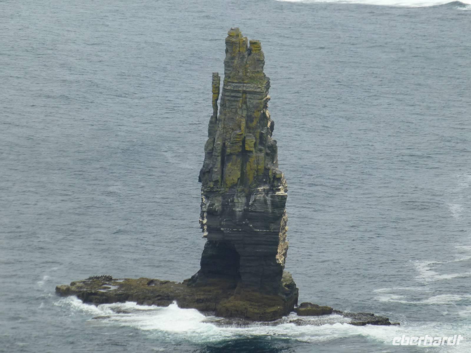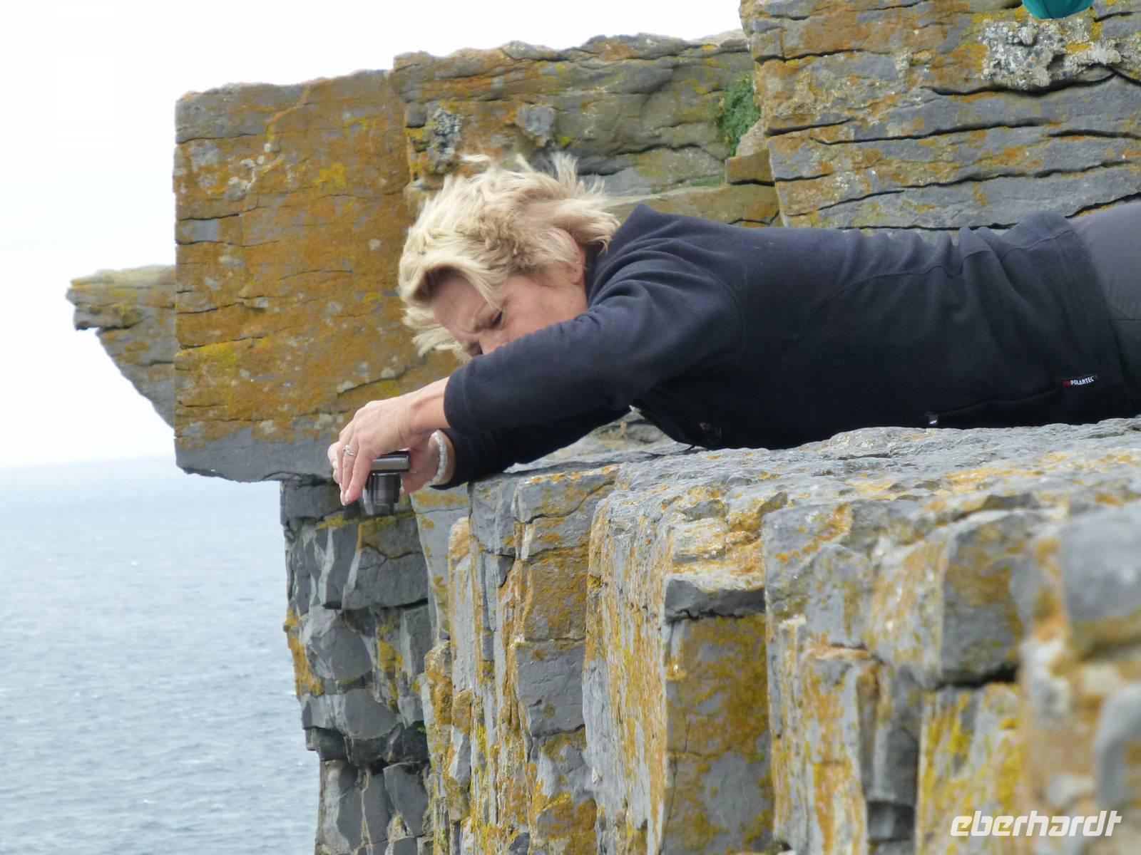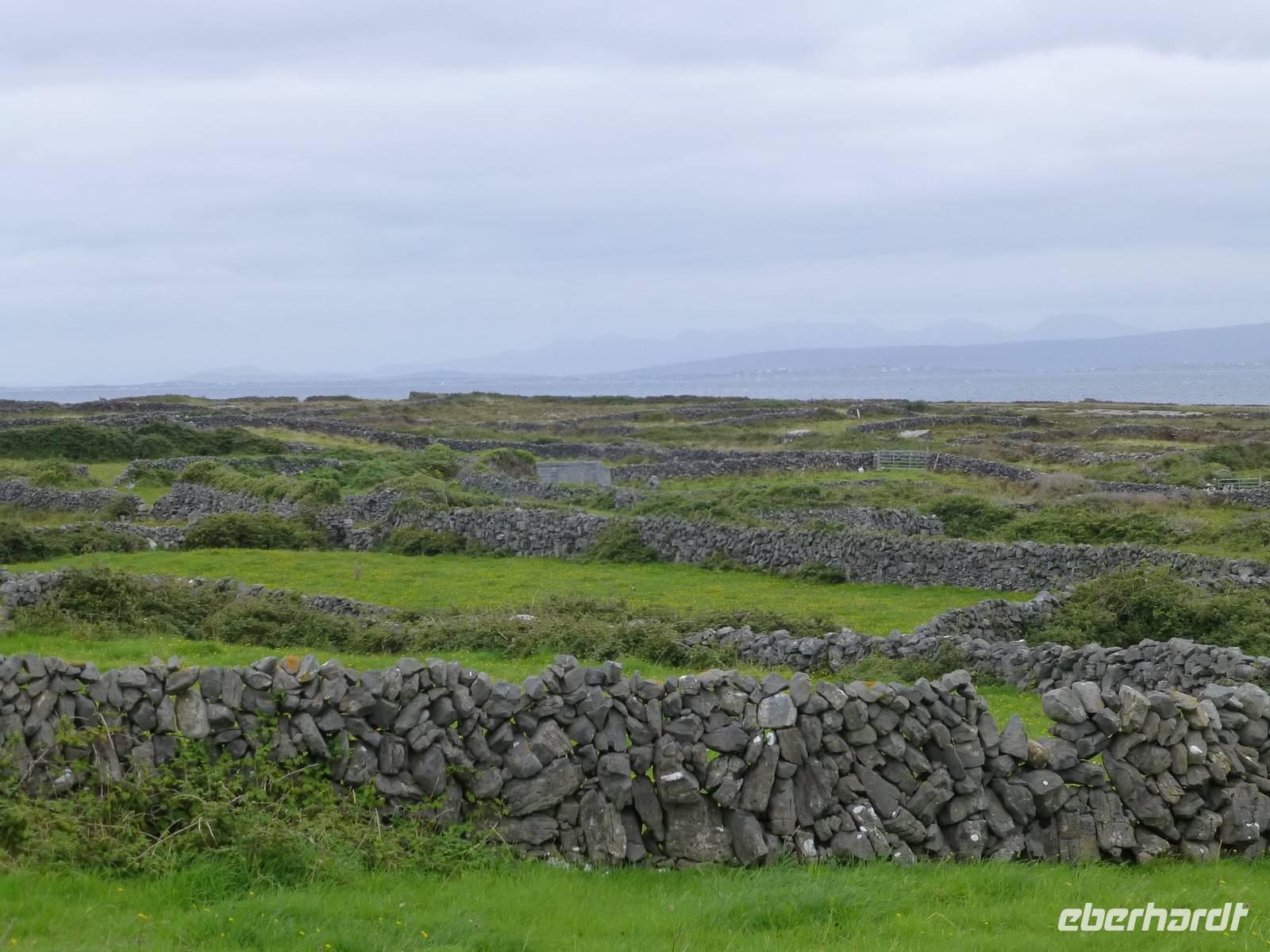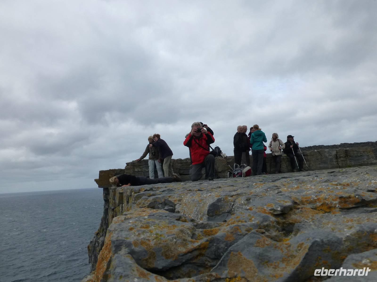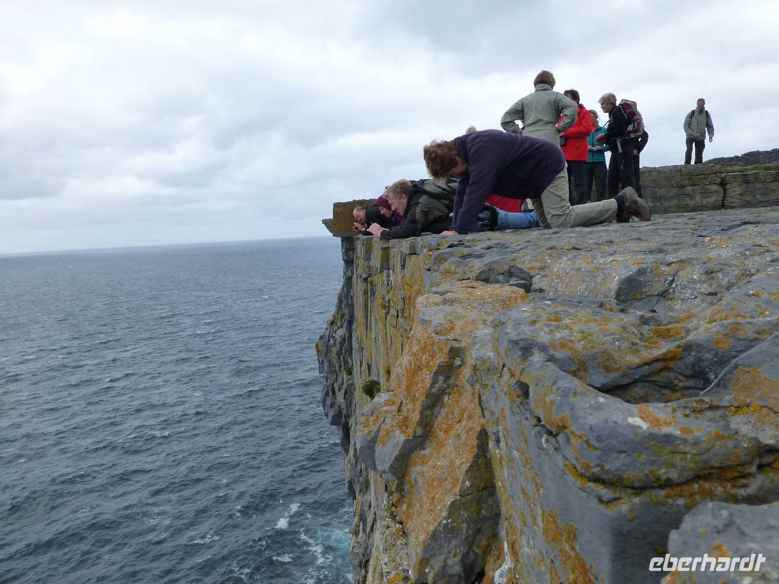Heute heißt es zeitiger abreisen. Wir wollen die Aran Islands besuchen, genauer die Insel Inishmore. Dazu müssen wir zum Hafen nach Rosaveel fahren, von dort fährt das Schiff ab. Im Hafen angekommen können wir gleich das Schiff besteigen, auch wenn es noch einige Minuten bis zur Abfahrt dauert. Das Wetter sich zu halten, es wird an diesem Tag auch keinen Regen geben. Die Überfahrt ist dann doch ganz schön stürmisch und wir sind froh als wir den Hafen im kleinen Inselhauptort Kilronan erreichen. Wir wandern immer entlang der Nordküste, der Wanderweg führt hier entlang der Straße. Es herrscht allerdings kaum Verkehr, mal ein PKW oder auch eine Kutsche die Gäste transportiert. Unterwegs machen wir halt an Kirians Kapelle, einer kleinen Kirche, welche St. Kirian, der Gründer von Clonmacnoise, gestiftet haben soll. Später sehen wir in einem Teich nicht nur Höckerschwäne sondern auch die seltenen Singschwäne und wenig später können wir Robben beobachten, welche sich in der Sonne regeln. Unterwegs überrascht uns mal ein Regenschauer, aber so schnell wie diese kommen sind sie auch wieder weg. Unser Ziel, die Ringburg Dun Aengus kommt jetzt schon ins Blickfeld. Bevor wir zu ihr aufsteigen machen wir erstmal unsere Mittagspause im Café des Visitor Centers. Und dann geht es hinauf zum Ringfort. Es ist vor allem wegen seiner spektakulären Lage direkt an den Klippen interessant. Wer es erbaut hat ist nicht eindeutig klar, auch nicht wer Dun Aengus war. Der Name wurde erst im 20. Jh. vergeben. Nachdem man die innere Mauer hinter sich gelassen hat könnte man meinen man verlässt diese Welt, denn vor sich ist nur noch das Meer. Auf dem Bauch liegend darf man die Klippen hinab schauen, 100 Meter unter uns tost das Meer. Und natürlich lassen sich einige Gäste das auch nicht entgehen. Am Visitor Center wartet auf ein kleiner Bus und bringt uns zurück zum Hafen nach Kilronan. Wir fahren mit dem Schiff zurück nach Rosaveel und dann mit dem Bus noch eine gute Stunde nach Gort, wo sich unser Hotel für die nächsten zwei Nächte befindet. Inzwischen fahren wir schon am Meer entlang, die Bucht von Galway immer zu unserer Rechten und wir können die Berge des Burren sehen, wo wir morgen wandern werden.Auf unserem Weg kommen wir an Galway vorbei, der viertgrößten Stadt Irlands. Hier ist immer viel Betrieb. „Stolz wie ein Kaufmann aus Galway" war hier früher ein geflügeltes Wort, war die Stadt doch vor allem im 14.-16. Jh. eine wichtiger Umschlagplatz für Wein. Das heute noch benutzte Wort „Lynchjustiz" soll ebenfalls von hier stammen. James Lynch Fitzstephen, Bürgermeister und oberster Richter der Stadt im 16. Jh., soll seinen Sohn Walter eigenhändig erhängt haben als der Scharfrichter sich weigerte es zu tun. Walter war des Mordes an einem spanischen Seemann angeklagt und der Vater war ein strenger Richter und ließ keine Gnade ergehen, auch nicht bei seinem eigenen Sohn.
