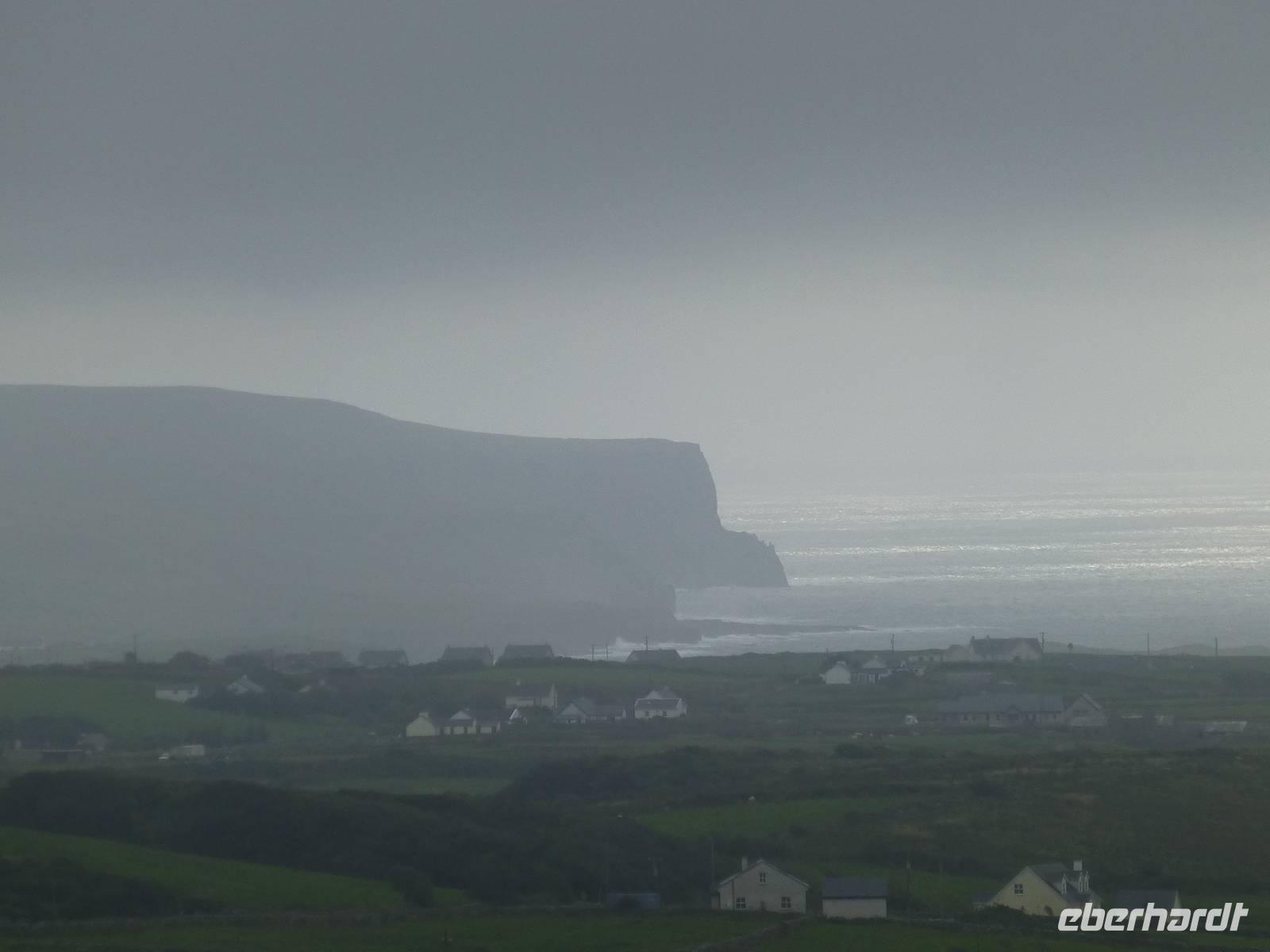 Am Morgen herrscht dichter Nebel und es regnet etwas, aber ich bin froher Hoffnung. Und zumindest Regen werden wir zum wandern nicht haben Zuerst stoppen wir an der Kilmagdough Abbey, einem ehemaligen Kloster, sehen wir einen sehr schönen Rundturm, das besondere an ihm ist, das er 60 cm außer Lot steht. Unser weiterer Weg bringt uns noch nach Kilfenora, wo wir die dortige kleine Kathedrale besuchen. Hier findet man interessante Hochkreuze mit christlichen Symbolen aber auch mit keltischen Motiven. Noch einen weiteren Halt machen wir am Poulnabrone Dolmen, dem wahrscheinlich bekanntesten Fotomotiv im Burren. Es handelt sich dabei um Portalgrab aus der Zeit um 2500 v.Ch. Nun ist es fast schon Mittag, am Horizont scheint es sich aufzuklären. Also geht es los mit wandern. Die Wanderung für den heutigen Tag habe ich gedreht, so das wir in Fanore beginnen. Über eine Fahrstraße erreichen wir den Burren Way und beginnen dann mit dem Aufstieg. Je höher wir kommen um so nebliger und windiger wird es. Und das wird fast den ganzen Weg über so bleiben. Am Ende der Wanderung, in der Nähe des Ballynaklan Castle können wir sehen, wie der Nebel sich im Nichts auflöst. Auf einmal erscheinen am Horizont die Klippen der Cliffs of Moher, ein imposantes Schauspiel. Die Wanderung war ganz schön anstrengend und wir fahren wir noch kurz nach Doolin. Hier gibt es die Möglichkeit in Connors Pub einen Irish Coffee zu trinken. Eine Belohnung, an welche man sich gewöhnen könnte.