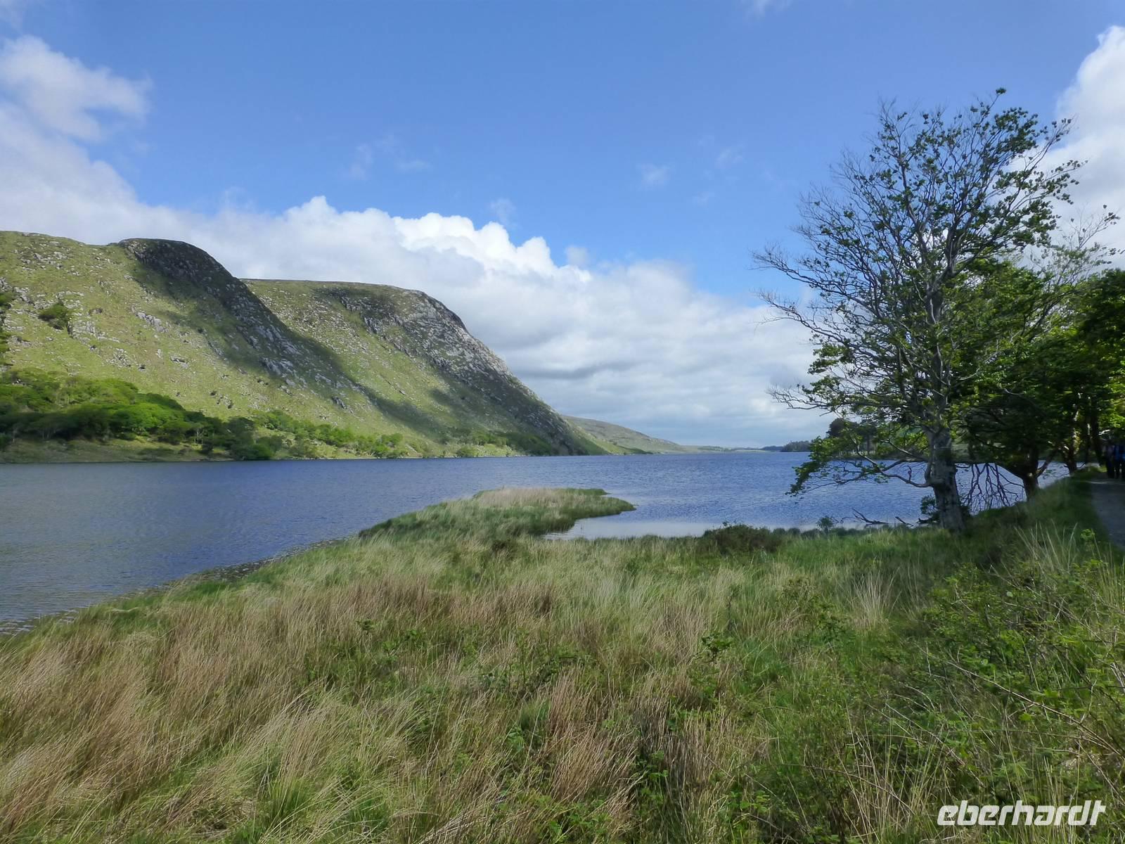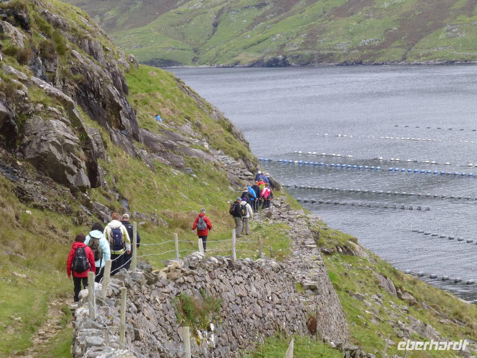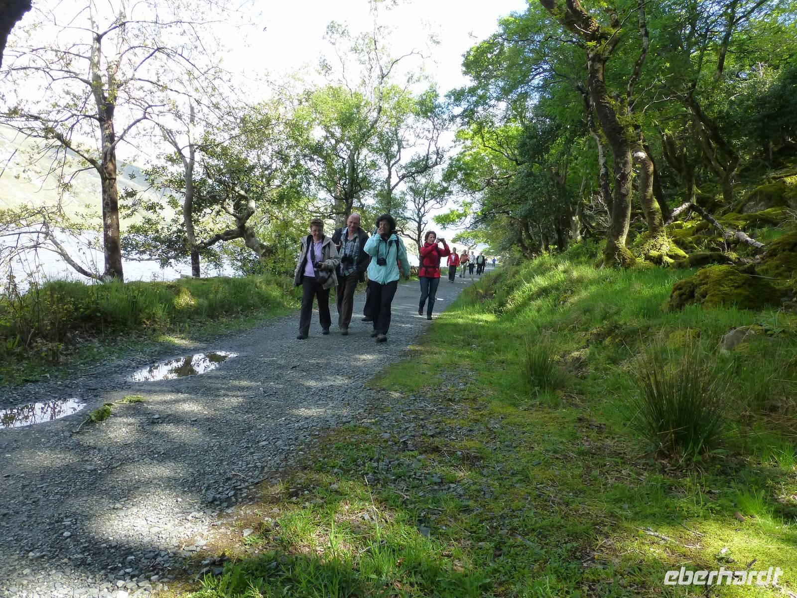 Wir werden heute ein Stück der Conemara Region für uns entdecken. Nach einem guten Frühstück kann es losgehen. Unser Buschauffeur Roy fährt uns erstmal zur Kylemore Abbey. Dabei handelt es sich nicht um eine Abtei im eigentlichen Sinne, sondern um ein von Benediktinern bis 2010 betriebenes internationales Mädchenpensionat. Die Lage des von Henry Mitchel erbauten Gebäudes ist einfach toll. Bei einer Besichtigung können wir das Abteigebäude, die neugotische Kirche und auch den Viktorianischen Garten sehen. Anschließend fahren ein paar Kilometer weiter zum Conemara Nationalpark. Im Nationalparkzentrum erhalten wir Informationen zu den Bogs, den Torffeldern. Unterwegs sind diese uns immer wieder begegnet. Jetzt können wir lernen, wie der Torf entstanden ist, wie er abgebaut wird und welches Leben im Torf herrscht. Das alles kostet übrigens keinen Eintritt, es wird vom irischen Staat finanziert. Wir nutzen gleich noch die Möglichkeit hier unsere Mittagspause zu machen, da wir alle Annehmlichkeiten auf einem Fleck haben. Jetzt heißt es endlich wandern. Entlang des Kilarry Harbour, dem einzigen Fjord Irlands wandern wir gut 9 Kilometer bis nach Rosroe. Faszinierende Blicke auf die Umgebung bieten sich auf Schritt und Tritt. Unterwegs sehen wir einen Muschelzuchtbetrieb. Unterwegs stößt Roy zu uns, unser Busfahrer ist uns entgegen gelaufen. Wie schön, alle freuen sich darüber, auch wenn auf Grund der Sprachbarriere die Kommunikation gering ist. Auf dem Rückweg zum Hotel fahren wir noch kurz zum Wasserfall „Ashleigh Falls", einem wirklich kleinem Wasserfall. Ich hatte ihn irgendwie anders in Erinnerung. Zum Abendessen lassen wir uns wieder durch die hervorragende Küche des Leenaun Hotels verwöhnen.