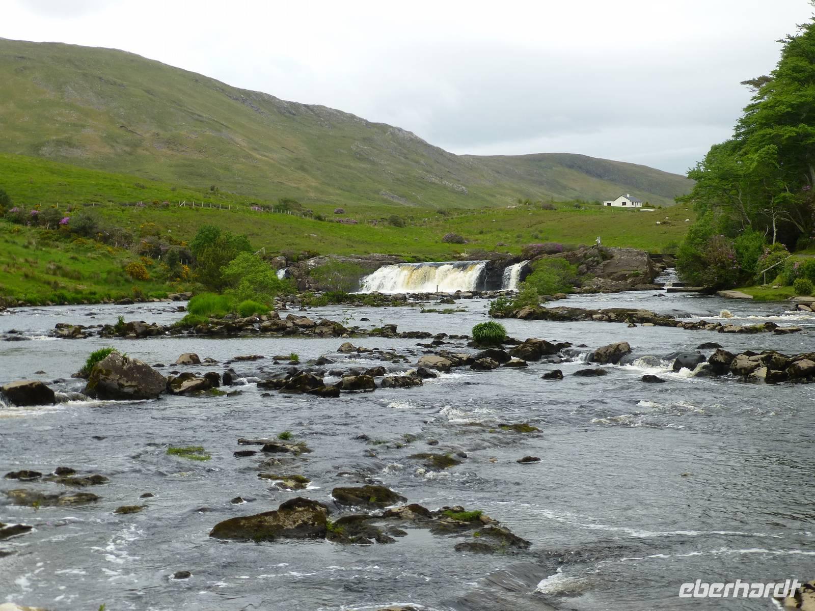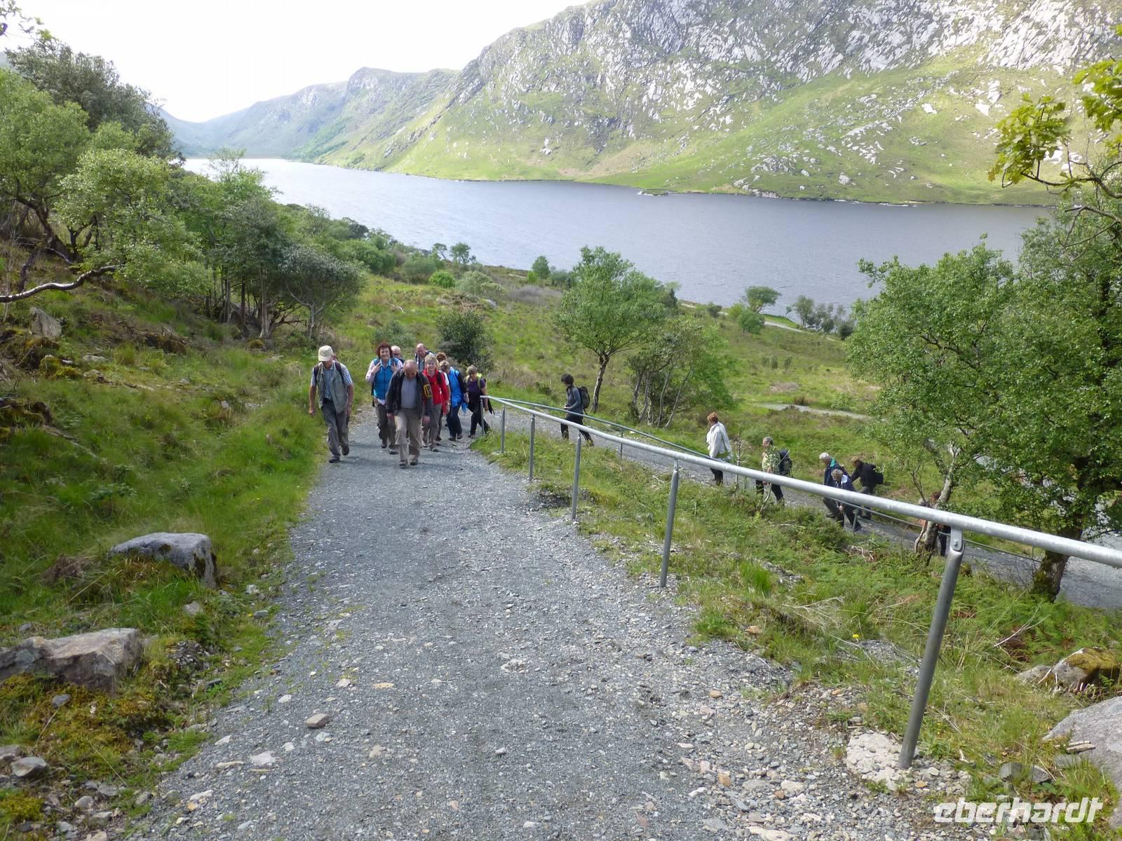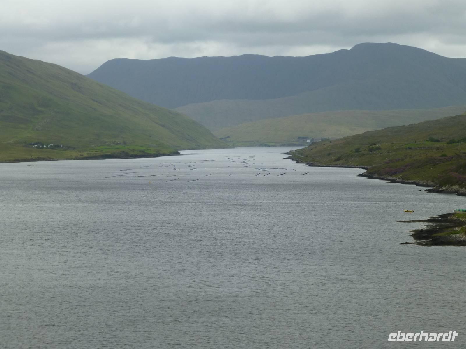 Wir werden heute ein Stück der Conemara Region für uns entdecken. Nach einem guten Frühstück kann es losgehen. Unser Buschauffeur Roy fährt uns erstmal zur Kylemore Abbey. Dabei handelt es sich nicht um eine Abtei im eigentlichen Sinne, sondern um ein von Benediktinern bis 2010 betriebenes internationales Mädchenpensionat. Die Lage des von Henry Mitchel erbauten Gebäudes ist einfach toll. Bei einer Besichtigung können wir das Abteigebäude, die neugotische Kirche und auch den Viktorianischen Garten sehen. Anschließend fahren ein paar Kilometer weiter zum Conemara Nationalpark. Im Nationalparkzentrum erhalten wir Informationen zu den Bogs, den Torffeldern. Unterwegs sind diese uns immer wieder begegnet. Jetzt können wir lernen, wie der Torf entstanden ist, wie er abgebaut wird und welches Leben im Torf herrscht. Das alles kostet übrigens keinen Eintritt, es wird vom irischen Staat finanziert. Wir nutzen gleich noch die Möglichkeit hier unsere Mittagspause zu machen, da wir alle Annehmlichkeiten auf einem Fleck haben. Jetzt heißt es endlich wandern. Entlang des Kilarry Harbour, dem einzigen Fjord Irlands wandern wir gut 9 Kilometer bis nach Rosroe. Faszinierende Blicke auf die Umgebung bieten sich auf Schritt und Tritt. Unterwegs sehen wir einen Muschelzuchtbetrieb. Unterwegs stößt Roy zu uns, unser Busfahrer ist uns entgegen gelaufen. Wie schön, alle freuen sich darüber, auch wenn auf Grund der Sprachbarriere die Kommunikation gering ist. Auf dem Rückweg zum Hotel fahren wir noch kurz zum Wasserfall „Ashleigh Falls", einem wirklich kleinem Wasserfall. Ich hatte ihn irgendwie anders in Erinnerung. Zum Abendessen lassen wir uns wieder durch die hervorragende Küche des Leenaun Hotels verwöhnen.