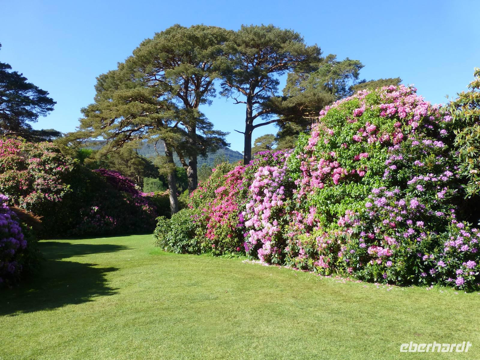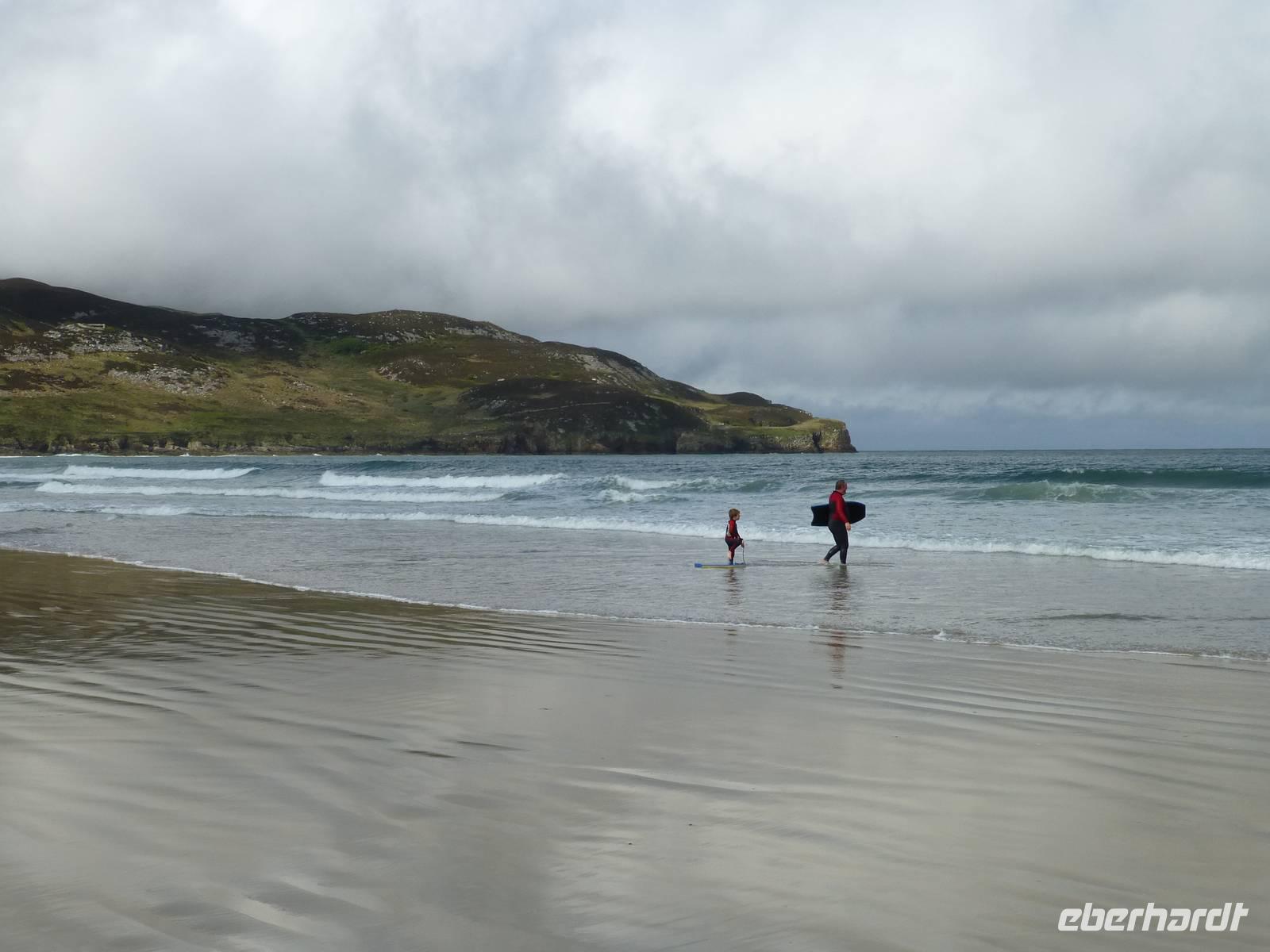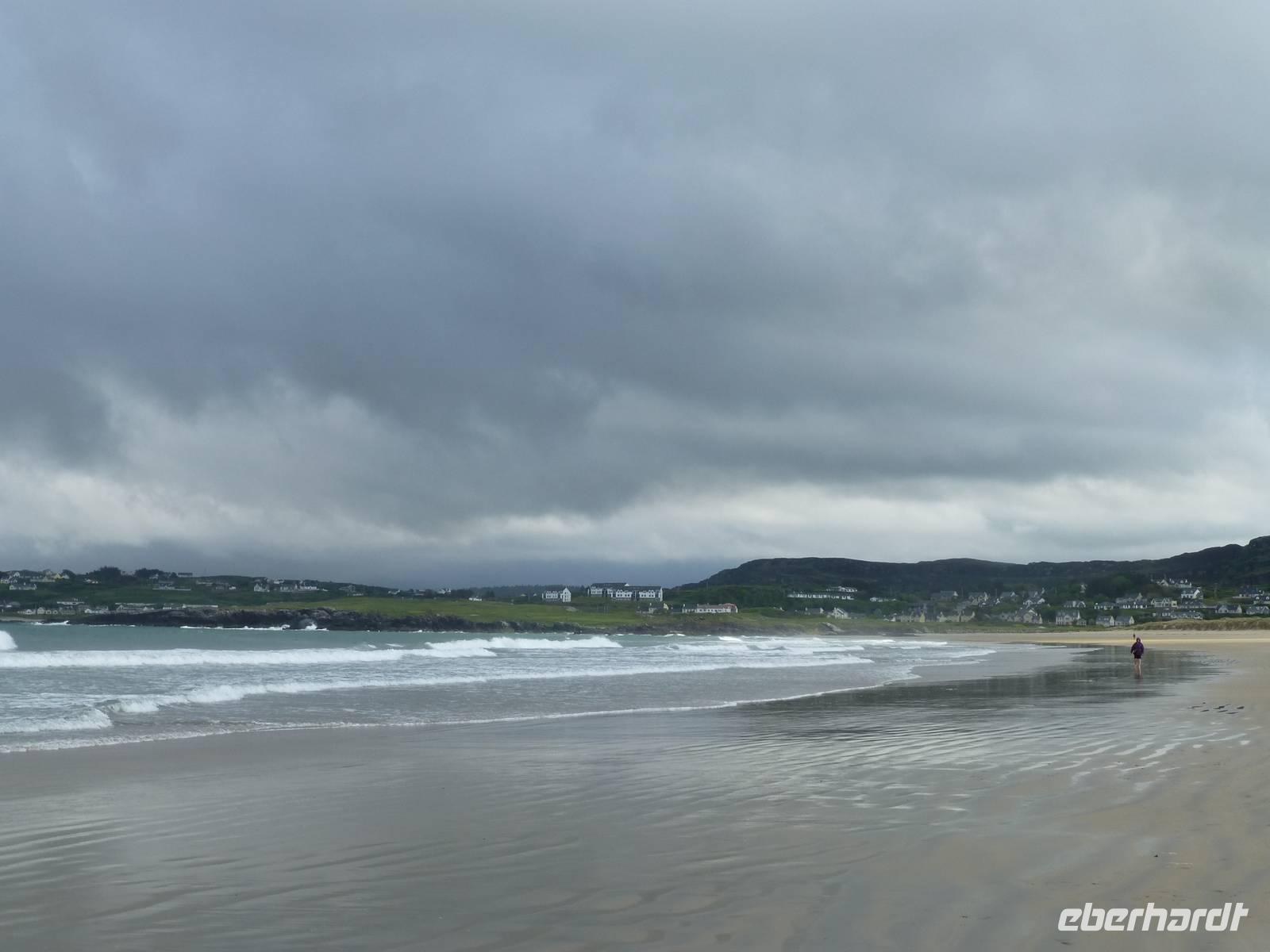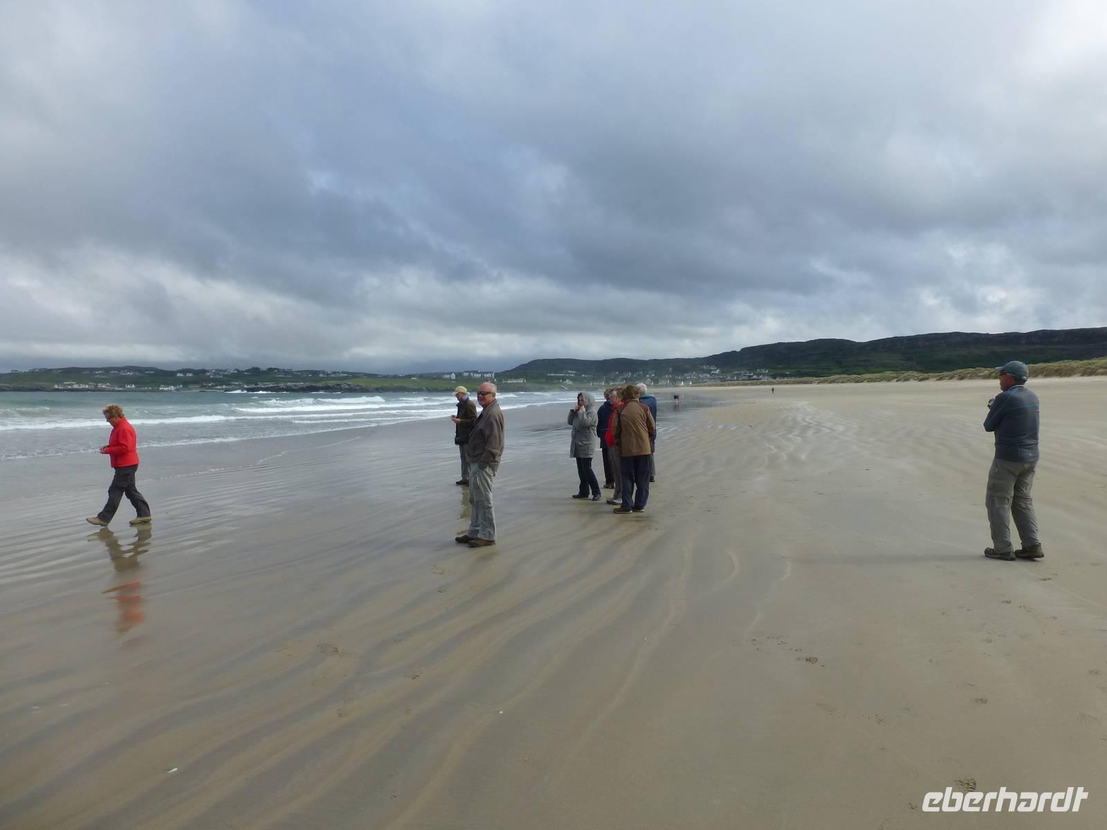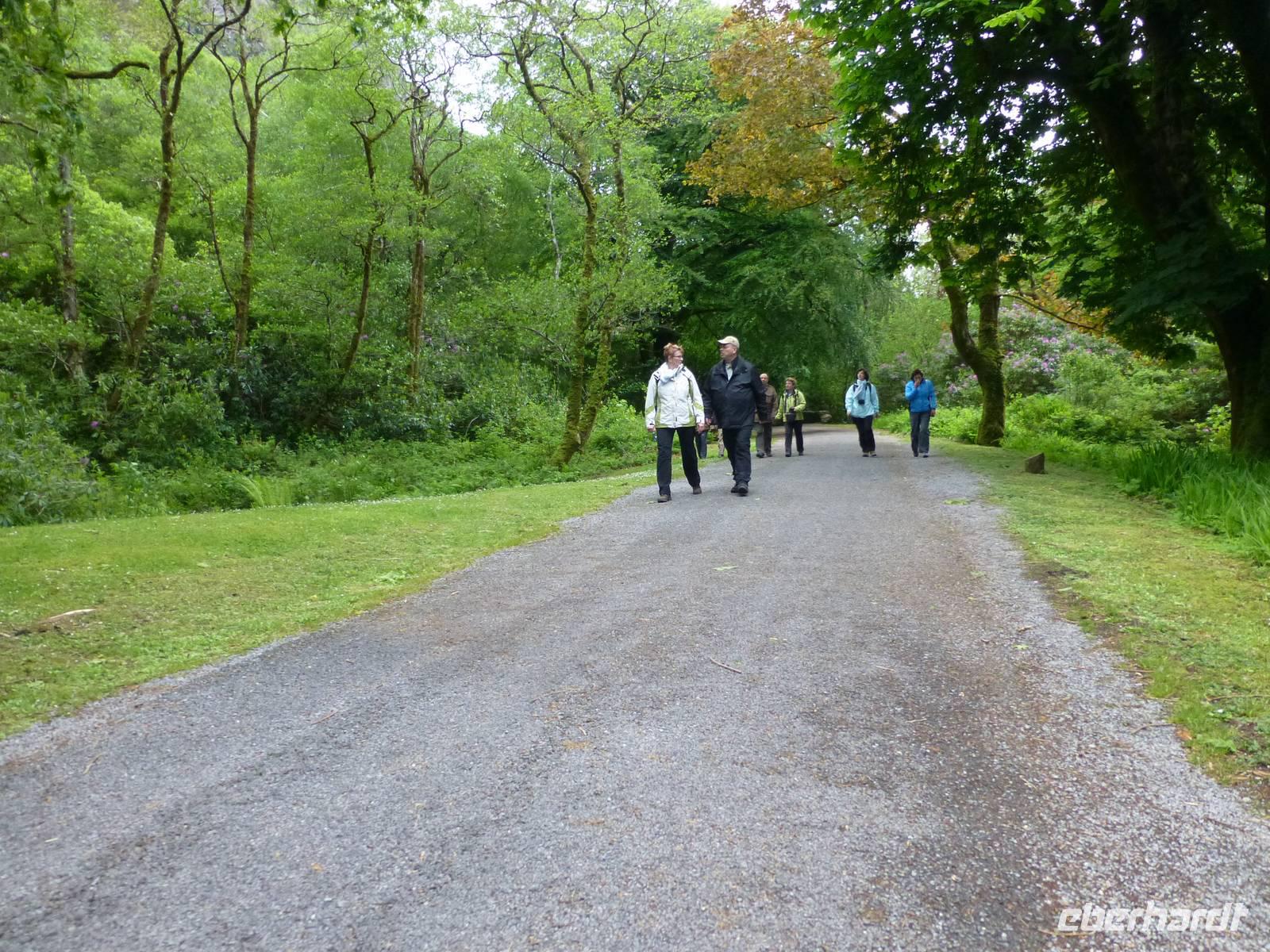 Der heutige Tag führt uns in den Glenveagh NP, welcher nur etwa eine halbe Stunde von Letterkenny entfernt liegt. Im Visitorcenter sehen wir zuerst einen kurzen Film, welcher uns mit der Geschichte der Entstehung des Glenveagh Castle und dem Weg zum Nationalpark bekannt macht. Mit Shuttlebussen fahren wir dann zum Glenveagh Castle und besichtigen nun das in der Mitte des 18. Jh. gebaute kleine Schlösschen. Der letzte Besitzer, ein Amerikaner mit irischen Wurzeln, hat es bereits in den 1970iger Jahren dem irischen Staat übergeben, welcher es bis heute pflegt. Er hatte übrigens immer interessanten Besuch, so weilte mehrmals Greta Garbo hier und auch der berühmte Geiger Yehudi Menuin war zu Gast. Nach der Besichtigung laufen wir entlang des Sees, unterwegs sind viele eigenartig geformte Bäume zu sehen, immer mal wieder hat man den Eindruck das wir Schlafplätze von Feen oder die Eingänge zu den Leprachaun Behausungen zu passieren. Nach einer Pause laufen wir denselben weg zurück und kurz vor dem Castle steigen wir auf einen Aussichtspunkt, von welchem ein schöner Blick über das gesamte Tal möglich ist. Die Gartenanlage ist ebenfalls sehr sehenswert und auch das Café lädt zu einem Besuch ein. Bis zum Busparkplatz verläuft unser Weg noch einmal entlang des Sees. Zum Abschluss des Tages fahren wir nach Dunfanaghy an die Küste und lassen uns den Wind am Meer um die Nase wehen. Mit vielen Glücksgefühlen und einem Tag voll Sonnenschein fahren wir wieder zurück zum Hotel und freuen uns auf unser gutes Abendessen.