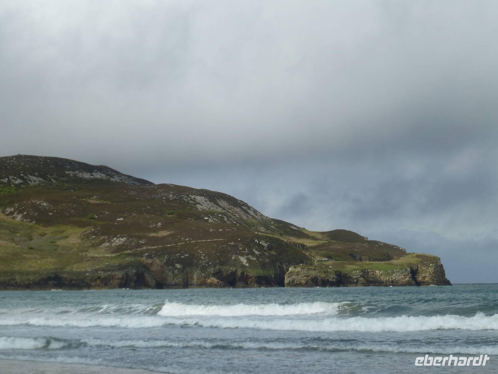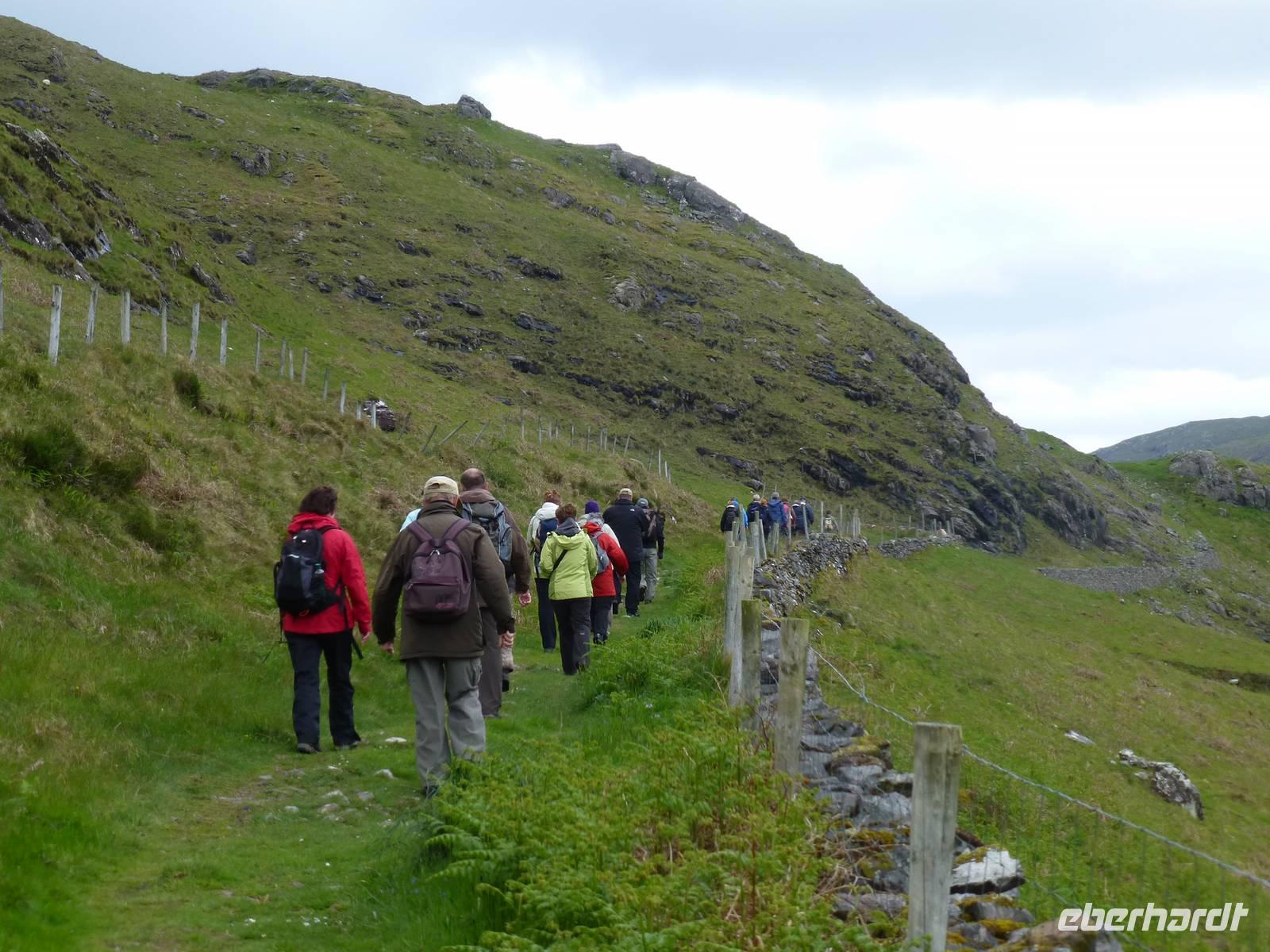 Von Letterkenny brechen wir auf nach Süden, unser Ziel heute heute Leenaun. Unser erster Halt wird in Drumcliff sein. Das Wetter zeigt sich am Morgen mit feinstem Sprühregen. Dieser setzt sich auch an den Bergen fest, so dass man den markanten Ben Bulben nur erahnen kann. Unterhalb des Tafelberges Ben Bulben befindet sich im Ort Drumcliff ein kleiner Friedhof mit dem bescheidenen Grab des irischen Schriftstellers William Butler Yeats. Es war sein Wunsch an dieser Stelle begraben zu sein. Auf seinem Grabstein befindet sich eine der berühmtesten selbst verfassten Grabinschriften der Welt: „Wirf einen kalten Blick, auf Leben, auf Tot, Reiter und dann ziehe weiter". Unser nächstes Ziel ist der Berg Knocknarea bei Sligo. Er ist ein markanter Punkt und schon von weiten sieht man ihn. Der Aufstieg auf den Knocknarea ist unkompliziert, in etwas über 30 Minuten sind wir schon oben. Auf dem Gipfel findet sich ein von Menschenhand aufgetürmter Steinhaufen, ein Cairn. Es soll das Grab der einst mächtigen Königin Maeve sein. Leider können wir die Aussicht auf die Sligo Bay und die weitere Umgebung nicht so recht genießen. Ein Regenschauer und kalter Wind lassen uns schnell wieder absteigen. Unsere Mittagspause verbringen wir inStrandhill, einem kleinen Ort direkt an der Küste. In Westport nutzen wir die Zeit etwas zum Bummeln und der eine oder andere von uns hat ein Souvenir für zu Hause gefunden. Auf dem Weg von Westport zu unserem Übernachtungsort Leenaun haben wir einen schönen Blick auf den heiligen Berg Irlands, den Croagh Patrick. Der Legende nach soll Irlands Nationalheiliger auf dem Berg 40 Tage und Nächte verbracht haben auf der Findung mit sich selbst. Nachdem ihm klar war, dass er dem irischen Volk das Christentum bringen muss hat er mit einer Glocke geläutet und dabei ist die Schlange, sie galt als die Hüterin der Weisheit, erschrocken und von der Insel geflohen. Und so gibt es bis heute keine Schlangen in Irland.