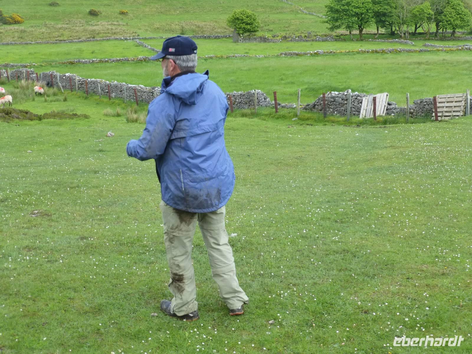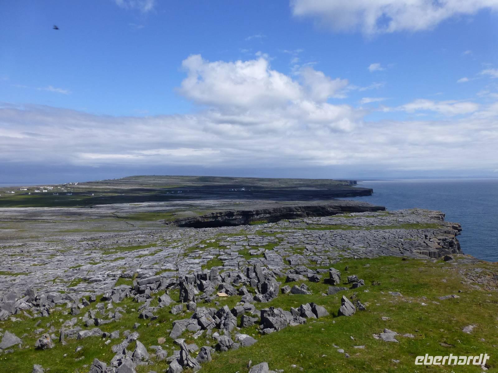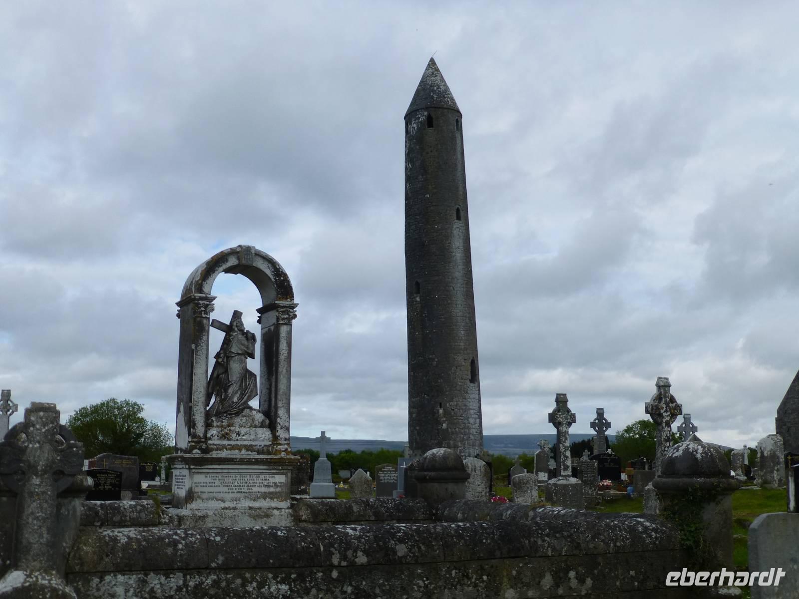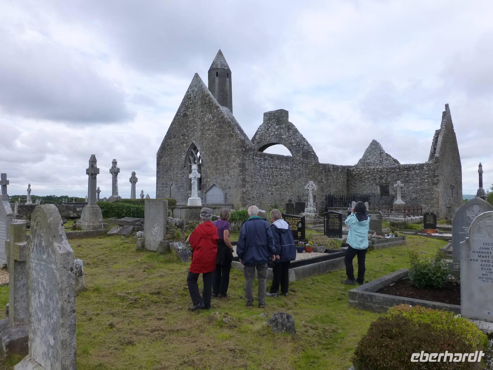 Nach dem Frühstück beginnt unser Tag im Burren zuerst mit einem Fotostopp an der Kilmagdough Abbey, einem ehemaligen Kloster. Hier sehen wir einen sehr schönen Rundturm, das besondere an ihm ist, das er 60 cm außer Lot steht. Unser weiterer Weg bringt uns nach Kilfenora, wo wir die dortige kleine Kathedrale besuchen. Hier findet man interessante Hochkreuze mit christlichen Symbolen aber auch mit keltischen/skandinavischen Motiven. Noch einen weiteren Halt machen wir am Poulnabrone Dolmen, dem wahrscheinlich bekanntesten Fotomotiv im Burren. Es handelt sich dabei um Portalgrab aus der Zeit um 2500 v.Ch. Die Wanderung heute beginnt außerhalb von Fanore im Caher Valley. Über eine Fahrstraße erreichen wir den Burren Way und beginnen dann mit dem Aufstieg. Die Sonne verwöhnt uns auch heute wieder. Über eine Greenroad und zum Schluß etwas Straße wandern wir unserem Bus entgegen, welcher in der Nähe des Ballynaklan Castle wartet. Am Horizont können wir schon die Klippen der Cliffs of Moher sehen. Unsere Rückweg führt über Ennistimon und Ennis nach Gort.
