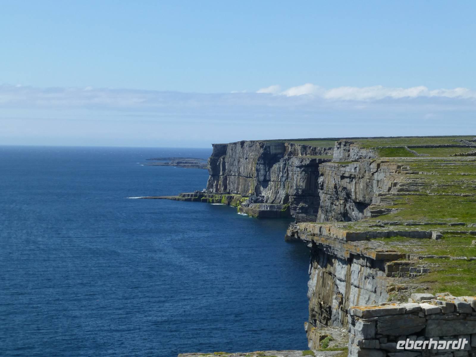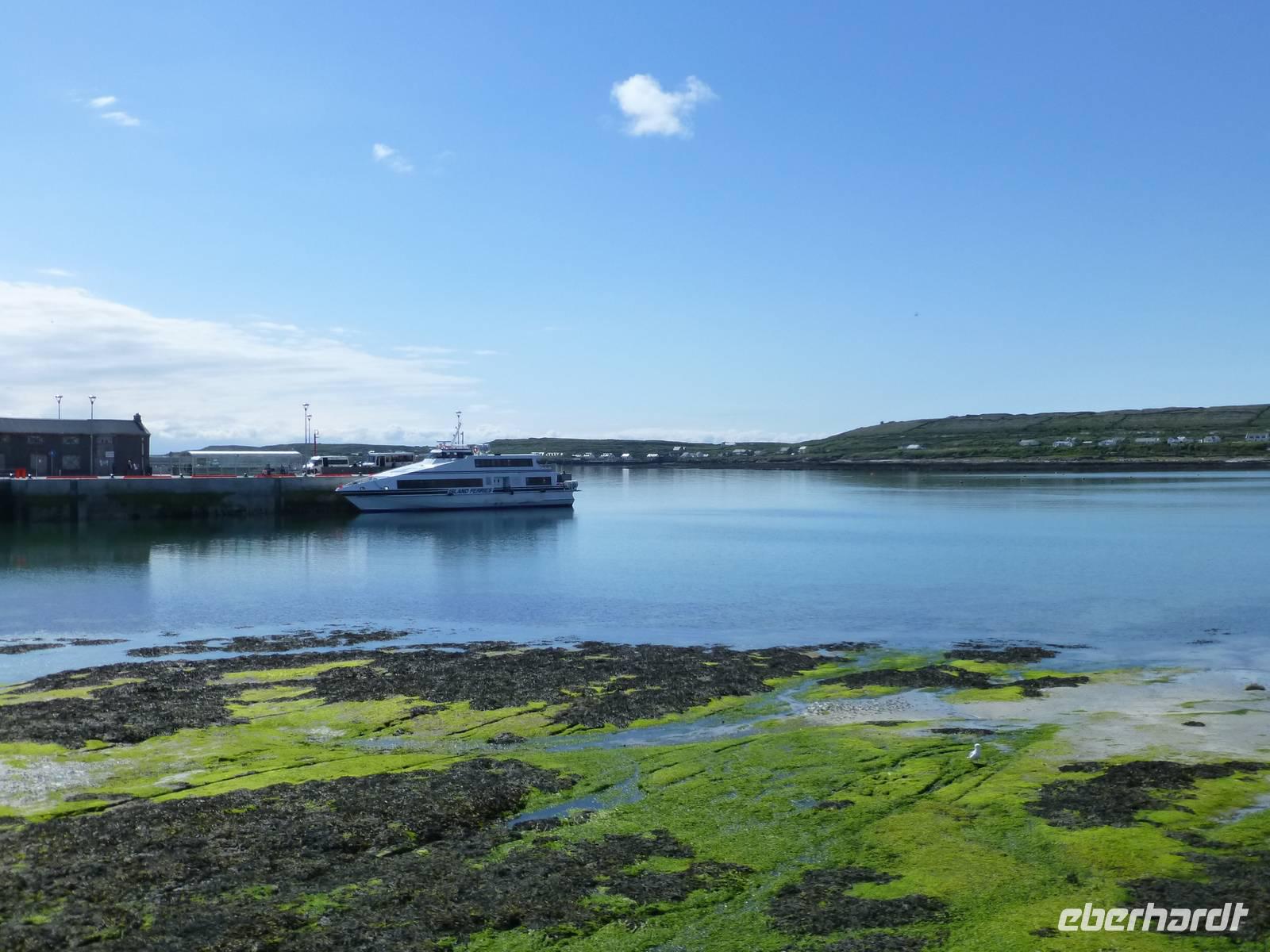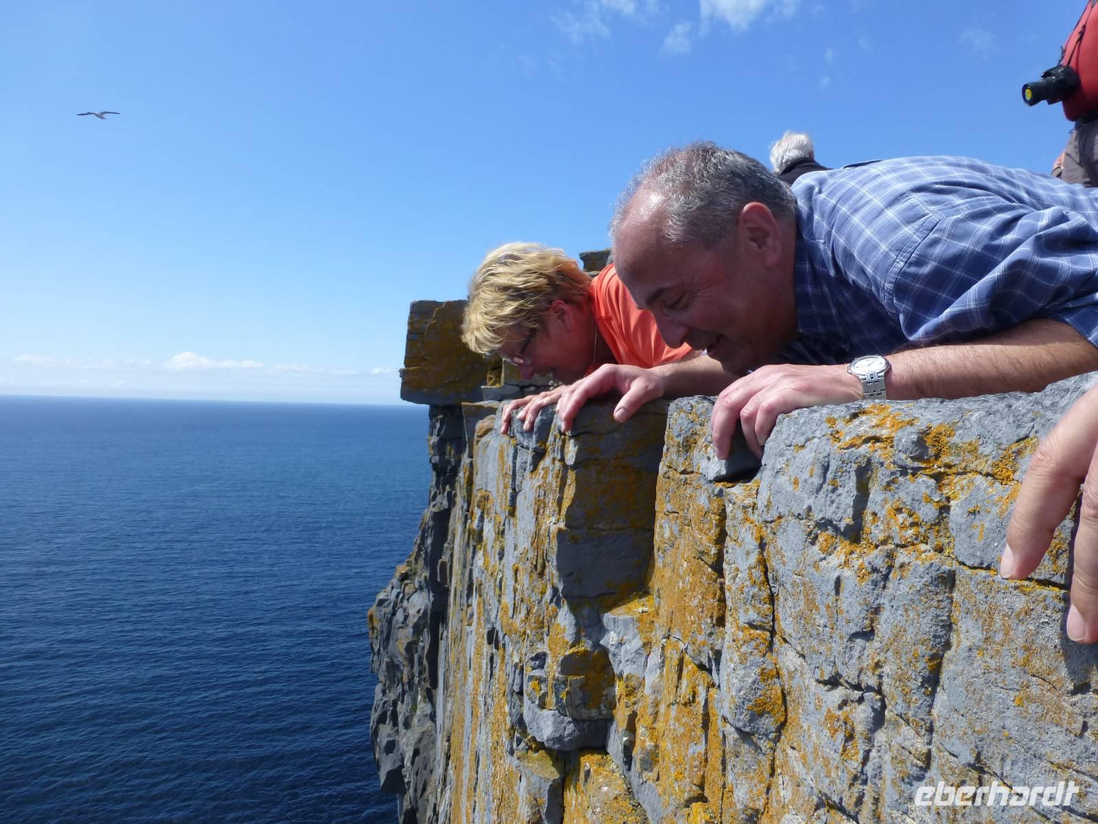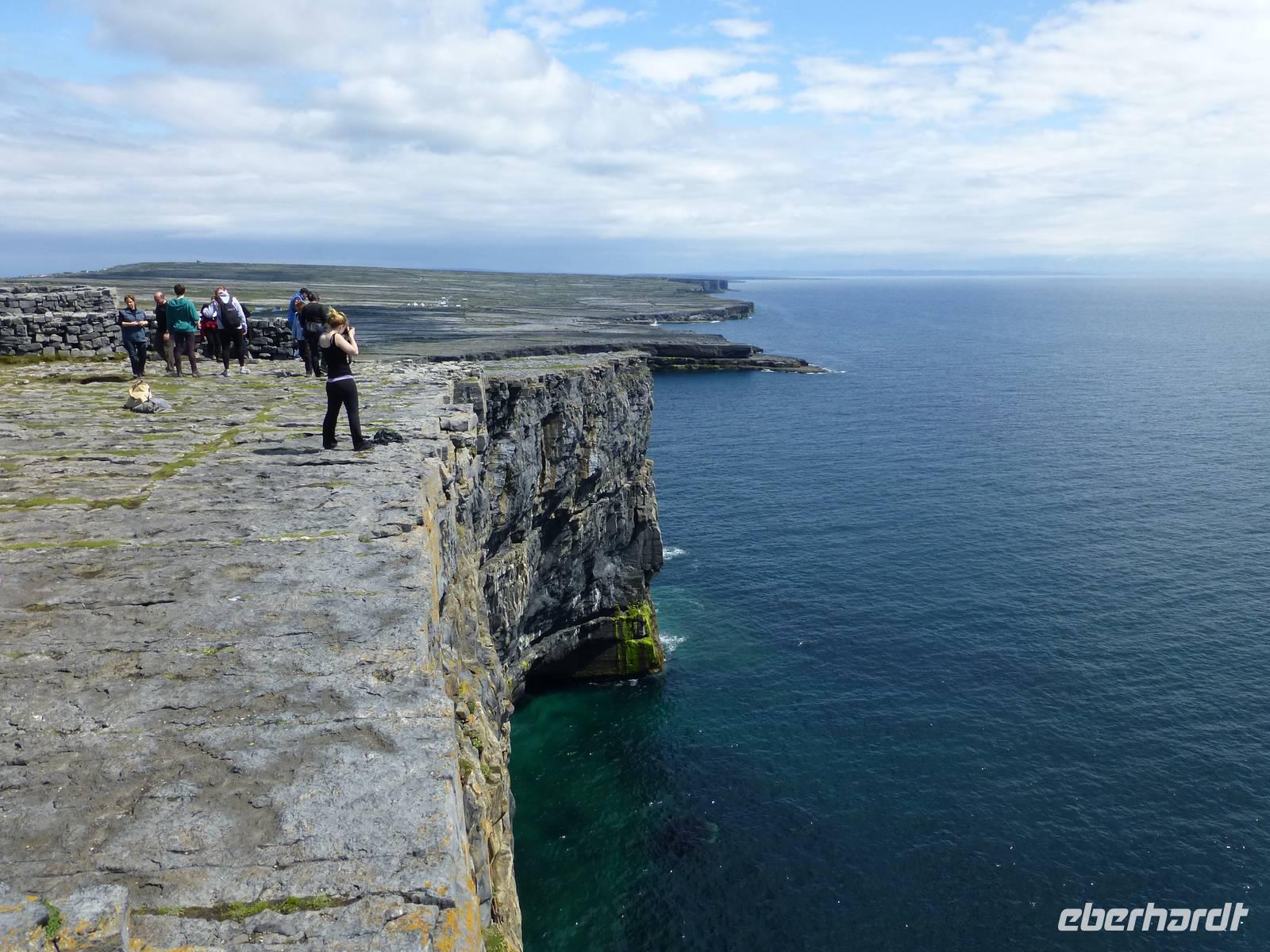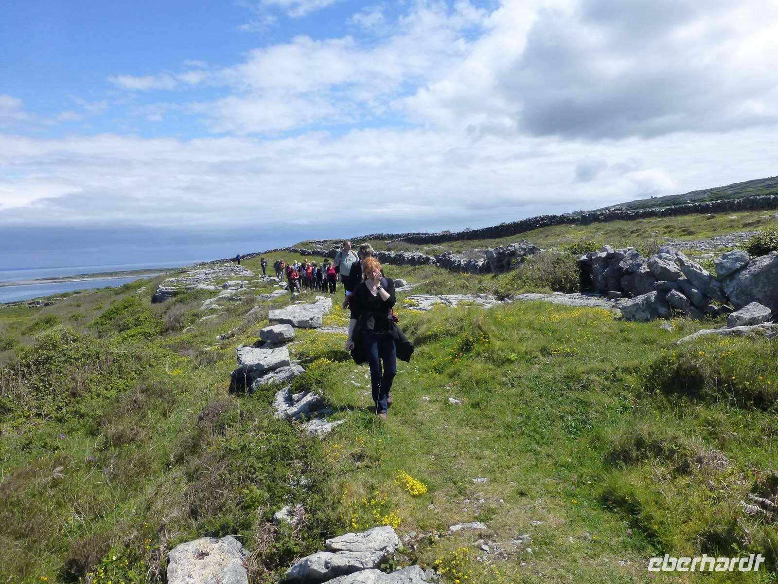 Heute verlassen wir Leenaun. Wir wollen die Aran Islands besuchen, genauer die Insel Inishmore. Dazu müssen wir zum Hafen nach Rosaveel fahren, von dort fährt das Schiff ab. Im Hafen angekommen können wir gleich das Schiff besteigen, auch wenn es noch einige Minuten bis zur Abfahrt dauert. Das Wetter zeigt sich den ganzen Tag von seiner besten Seiten, den ganzen Tag über Sonnenschein und fast kein Wind. Die Überfahrt in den kleinen Inselhauptort Kilronan dauert ca. 45 Minuten. Anschließend wandern wir immer entlang der Nordküste, der Wanderweg führt hier entlang der Straße. Durch die Winterstürme ist die Straße an einigen Stellen beschädigt, so dass kein Autoverkehr wie sonst ist. Unterwegs machen wir halt an Kirians Kapelle, einer kleinen Kirche, welche St. Kirian, der Gründer von Clonmacnoise, gestiftet haben soll. Zur Mittagspause am Seal View Point können wir Robben beobachten. Unser Ziel, die Ringfort Dun Aengus kommt jetzt schon ins Blickfeld. Das Ringfort ist vor allem wegen seiner Mauern aus 6500 t Steinen und der spektakulären Lage direkt an den Klippen interessant. Wer es erbaut hat ist nicht eindeutig klar, auch nicht wer Dun Aengus war. Der Name wurde erst im 20. Jh. vergeben. Nachdem man die innere Mauer hinter sich gelassen hat könnte man meinen man verlässt diese Welt, denn vor sich ist nur noch das Meer. Auf dem Bauch liegend darf man die Klippen hinab schauen, 100 Meter unter uns tost das Meer. Und natürlich lassen sich einige Gäste das auch nicht entgehen. Am Visitor Center wartet später ein kleiner Bus und bringt uns zurück zum Hafen nach Kilronan. Wir fahren mit dem Schiff zurück nach Rosaveel und dann mit dem Bus noch eine gute Stunde nach Gort, wo sich unser Hotel für die nächsten zwei Nächte befindet. Die Straße führt am Meer entlang, die Bucht von Galway immer zu unserer Rechten und wir können die Berge des Burren sehen, wo wir morgen wandern werden. Auf unserem Weg kommen wir an Galway vorbei, der viertgrößten Stadt Irlands. Hier ist immer viel Betrieb. „Stolz wie ein Kaufmann aus Galway" war hier früher ein geflügeltes Wort, war die Stadt doch vor allem im 14.-16. Jh. ein wichtiger Umschlagplatz für Wein. Das heute noch benutzte Wort „Lynchjustiz" soll ebenfalls von hier stammen. James Lynch Fitzstephen, Bürgermeister und oberster Richter der Stadt im 16. Jh. soll seinen Sohn Walter eigenhändig erhängt haben als der Scharfrichter sich weigerte es zu tun. Walter war des Mordes an einem spanischen Seemann angeklagt und der Vater war ein strenger Richter und ließ keine Gnade ergehen, auch nicht bei seinem eigenen Sohn.
