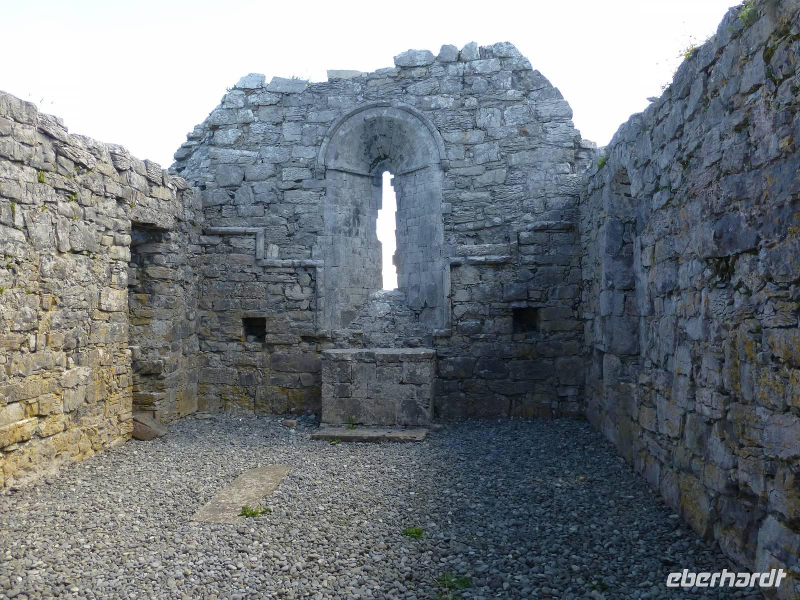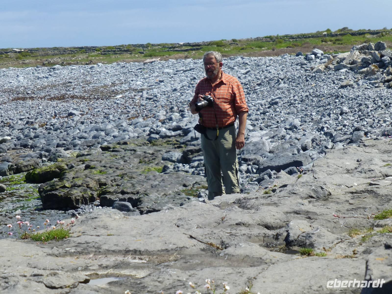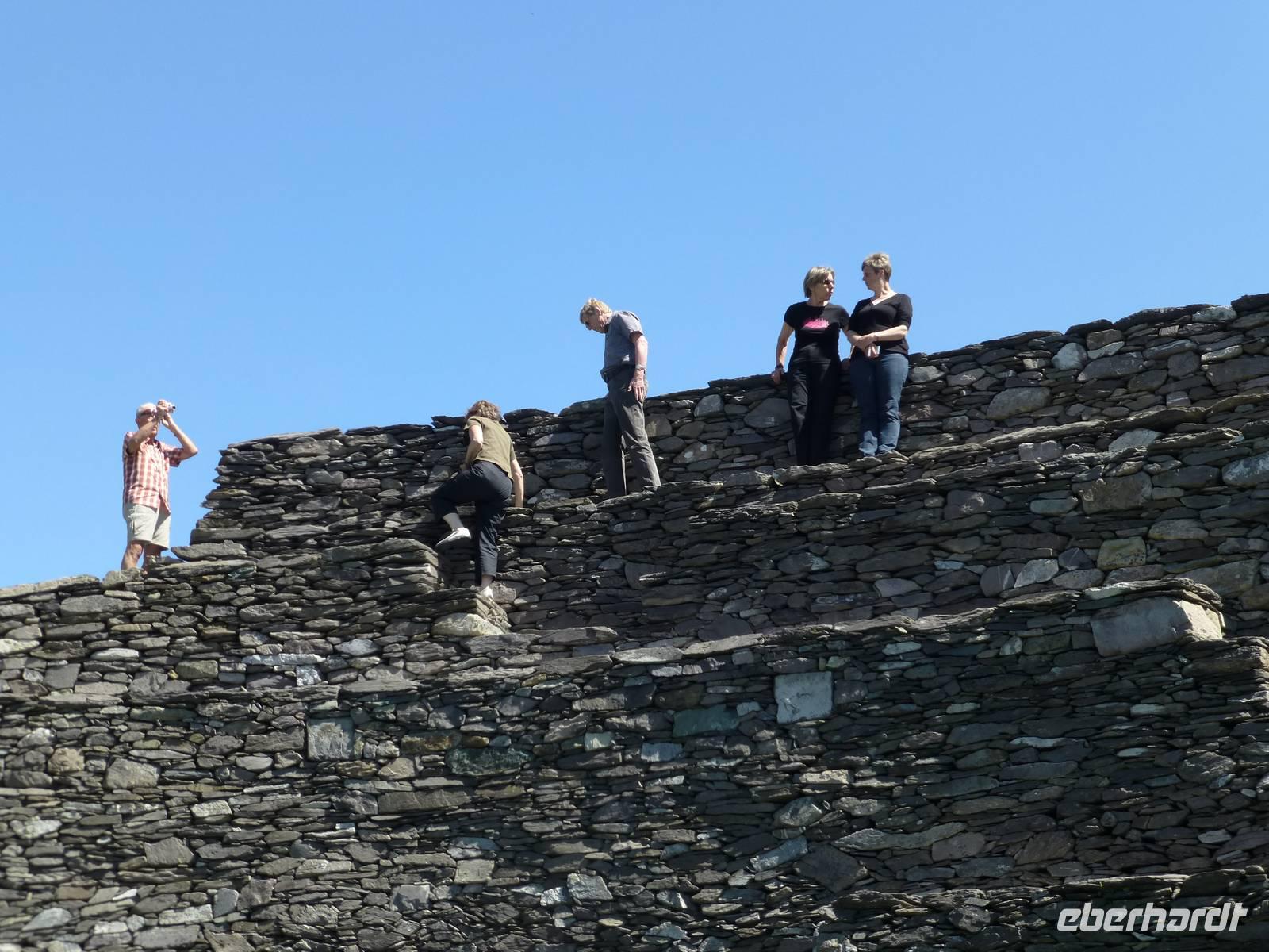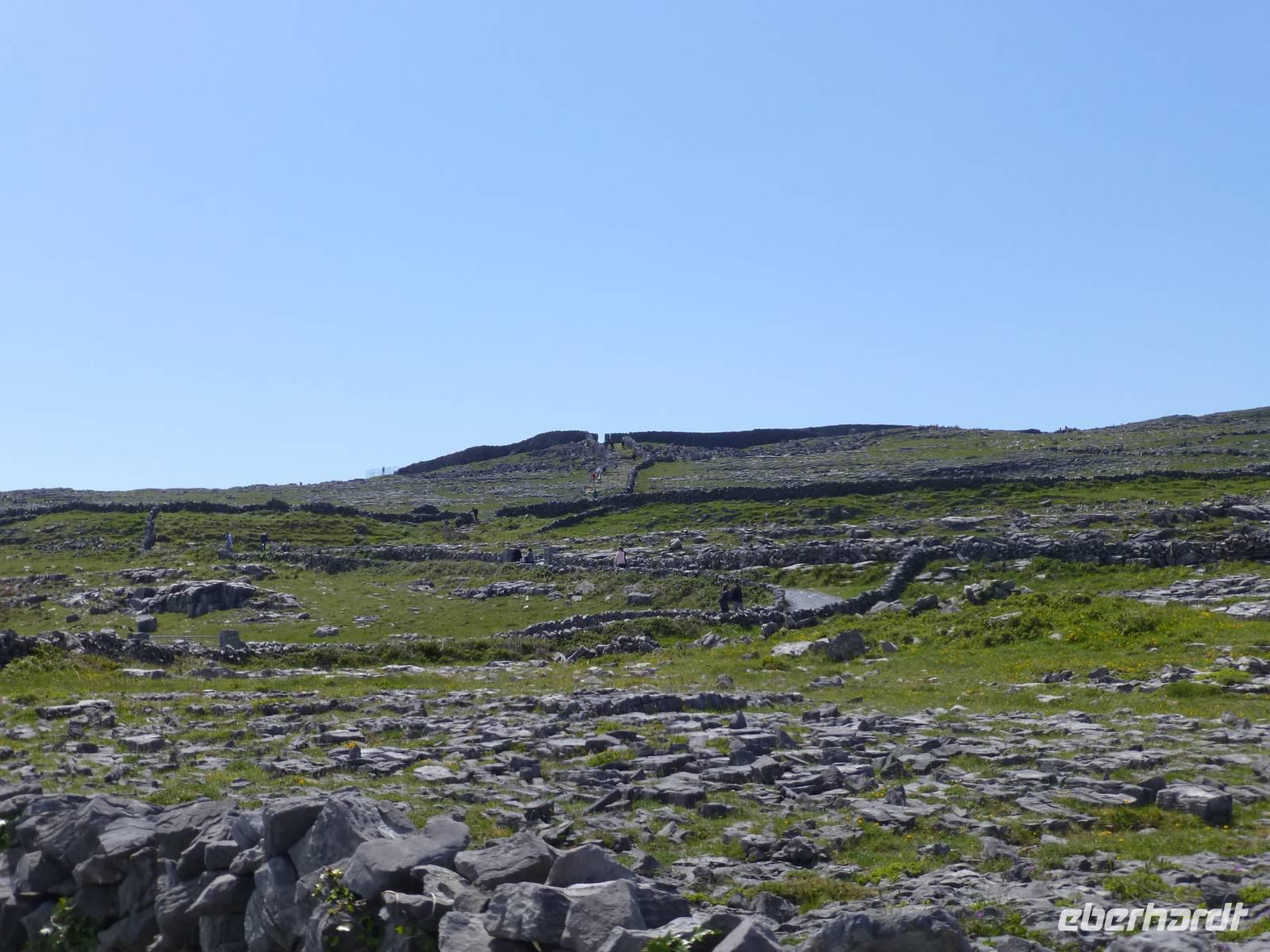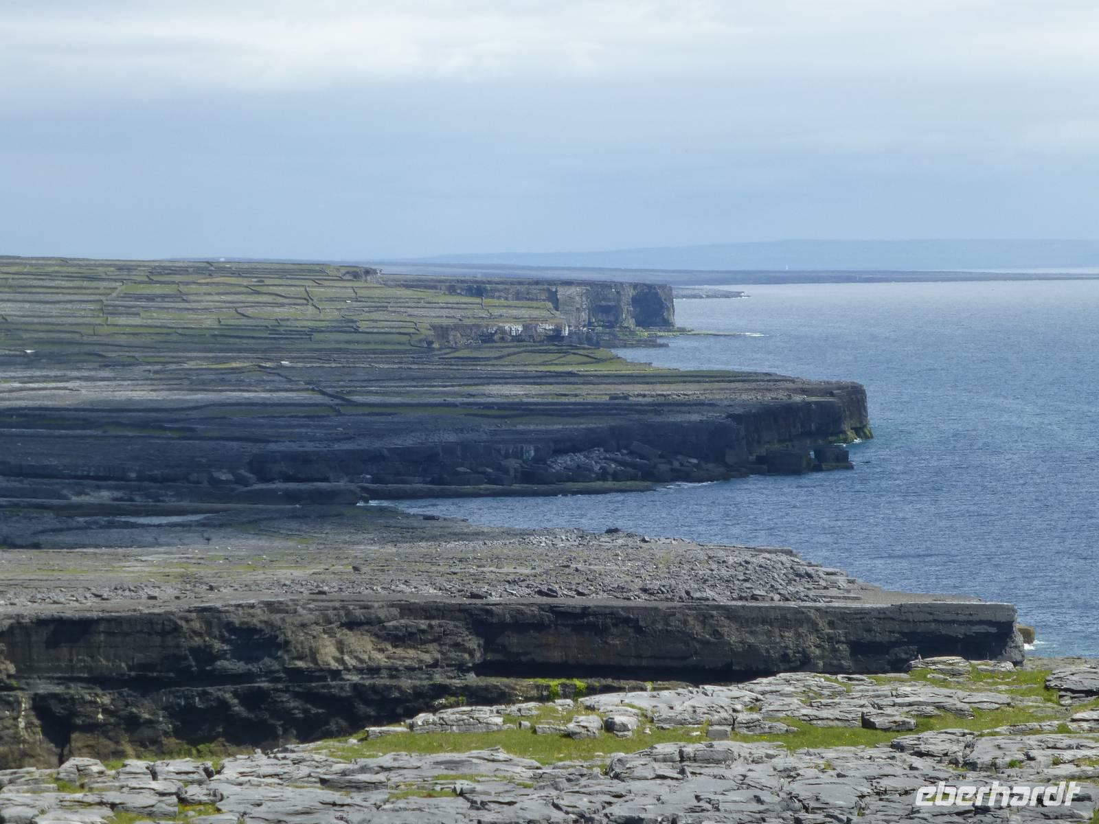 Heute verlassen wir Leenaun. Wir wollen die Aran Islands besuchen, genauer die Insel Inishmore. Dazu müssen wir zum Hafen nach Rosaveel fahren, von dort fährt das Schiff ab. Im Hafen angekommen können wir gleich das Schiff besteigen, auch wenn es noch einige Minuten bis zur Abfahrt dauert. Das Wetter zeigt sich den ganzen Tag von seiner besten Seiten, den ganzen Tag über Sonnenschein und fast kein Wind. Die Überfahrt in den kleinen Inselhauptort Kilronan dauert ca. 45 Minuten. Anschließend wandern wir immer entlang der Nordküste, der Wanderweg führt hier entlang der Straße. Durch die Winterstürme ist die Straße an einigen Stellen beschädigt, so dass kein Autoverkehr wie sonst ist. Unterwegs machen wir halt an Kirians Kapelle, einer kleinen Kirche, welche St. Kirian, der Gründer von Clonmacnoise, gestiftet haben soll. Zur Mittagspause am Seal View Point können wir Robben beobachten. Unser Ziel, die Ringfort Dun Aengus kommt jetzt schon ins Blickfeld. Das Ringfort ist vor allem wegen seiner Mauern aus 6500 t Steinen und der spektakulären Lage direkt an den Klippen interessant. Wer es erbaut hat ist nicht eindeutig klar, auch nicht wer Dun Aengus war. Der Name wurde erst im 20. Jh. vergeben. Nachdem man die innere Mauer hinter sich gelassen hat könnte man meinen man verlässt diese Welt, denn vor sich ist nur noch das Meer. Auf dem Bauch liegend darf man die Klippen hinab schauen, 100 Meter unter uns tost das Meer. Und natürlich lassen sich einige Gäste das auch nicht entgehen. Am Visitor Center wartet später ein kleiner Bus und bringt uns zurück zum Hafen nach Kilronan. Wir fahren mit dem Schiff zurück nach Rosaveel und dann mit dem Bus noch eine gute Stunde nach Gort, wo sich unser Hotel für die nächsten zwei Nächte befindet. Die Straße führt am Meer entlang, die Bucht von Galway immer zu unserer Rechten und wir können die Berge des Burren sehen, wo wir morgen wandern werden. Auf unserem Weg kommen wir an Galway vorbei, der viertgrößten Stadt Irlands. Hier ist immer viel Betrieb. „Stolz wie ein Kaufmann aus Galway" war hier früher ein geflügeltes Wort, war die Stadt doch vor allem im 14.-16. Jh. ein wichtiger Umschlagplatz für Wein. Das heute noch benutzte Wort „Lynchjustiz" soll ebenfalls von hier stammen. James Lynch Fitzstephen, Bürgermeister und oberster Richter der Stadt im 16. Jh. soll seinen Sohn Walter eigenhändig erhängt haben als der Scharfrichter sich weigerte es zu tun. Walter war des Mordes an einem spanischen Seemann angeklagt und der Vater war ein strenger Richter und ließ keine Gnade ergehen, auch nicht bei seinem eigenen Sohn.
