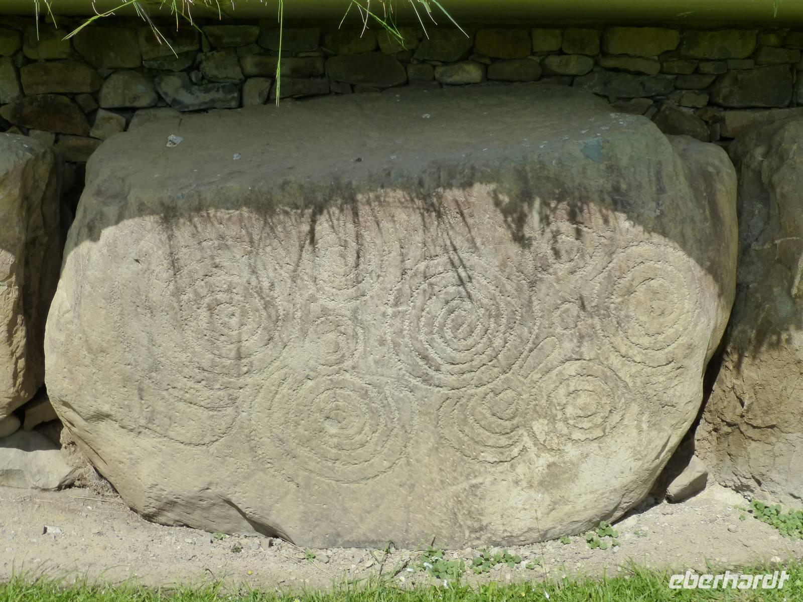 In Monasterboice sehen wir im ehemaligen Kloster mehrere Hochkreuze, das Westkreuz mit 6,50 m ist dabei das höchste in Irland. Das Hoch- oder auch Keltisches Kreuz vereint das Christentum mit dem keltischen Glauben, das Rad symbolisiert dabei die Sonne. Zwei der Hochkreuze sind wunderbar mit bildlichen Darstellungen verziert. Diese dienten früher den Mönchen zur Erklärung der biblischen Geschichten, die meisten Menschen konnten zur Zeit der Entstehung der Kreuze im 10. Jh. nicht lesen und schreiben. Eine bessere Bezeichnung für diese Kreuze wäre eigentlich Bilderkreuz. Anschließend fahren wir zum Bru na Boine Visitor Center. Von hier aus ist es möglich die großen Ganggräber zu besichtigen. Wir sehen einen Film und bekommen erklärt wie zur Wintersonnenwende die Grabkammer von Newgrange ganze 17 Minuten durch die Sonne erhellt. Anschließend besichtigen wir Knowth und auf uns wartet schon Jimmy, welcher uns einiges in deutscher Sprache erklären wird. Trotz des einsetzenden Regenschauers lauschen wir den interessanten Erläuterungen. So ist es u.a. sehr interessant, das der Hügel bis in 14. Jh. auch als Wohnort diente. Da der Gang im Inneren des Grabes nicht mehr zugänglich ist können wir nur ein Stückchen hinein gehen. Abschließend gehen wir noch auf den Dolmen und umrunden diesen. Dabei sehen wir die zahlreichen verzierten Randsteine mit vor allem spiralförmigen Mustern. Was diese bedeuten hat die Wissenschaft bis heute nicht vollständig klären können, jeder darf in dieser 5000 Jahre alten Kunst sehen was er möchte. Nach der Besichtigung fahren wir zu unserem Hotel „Jurys Inn Customs House" in Dublin, wo wir für eine Nacht wohnen.