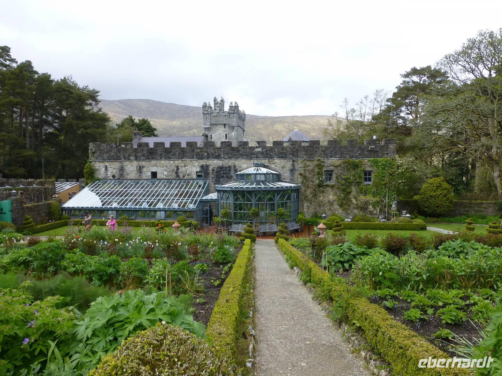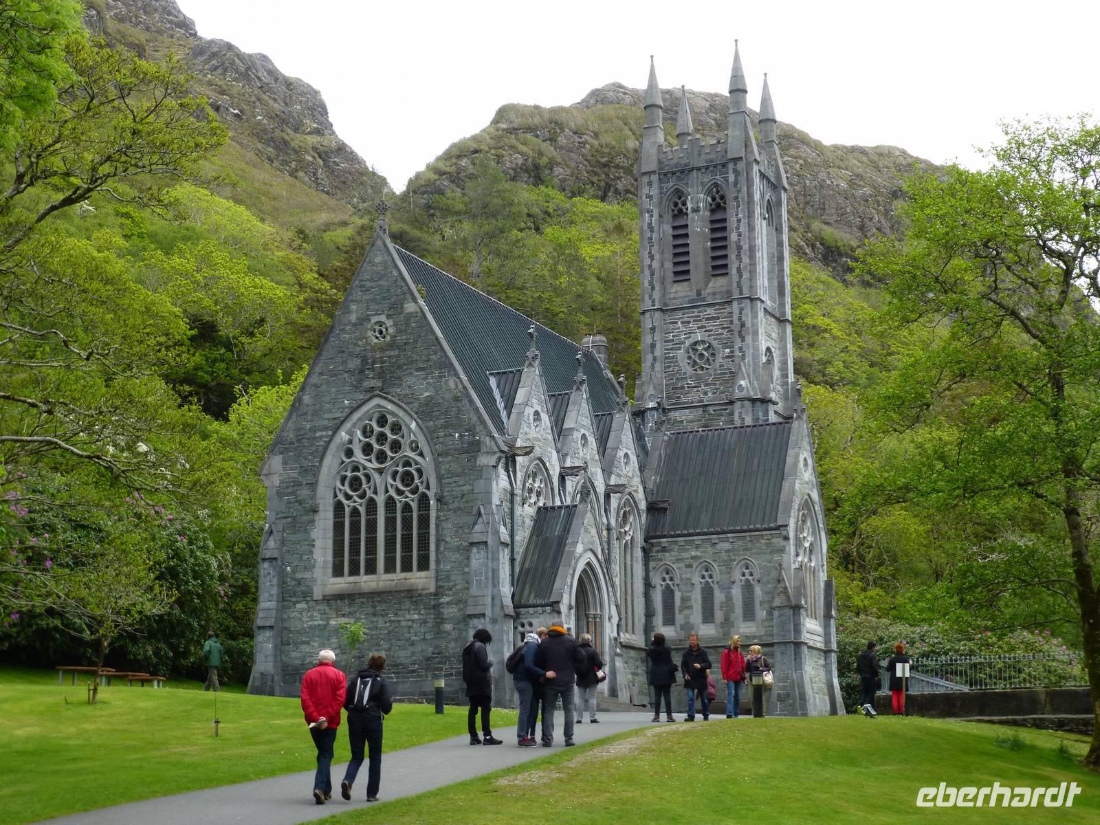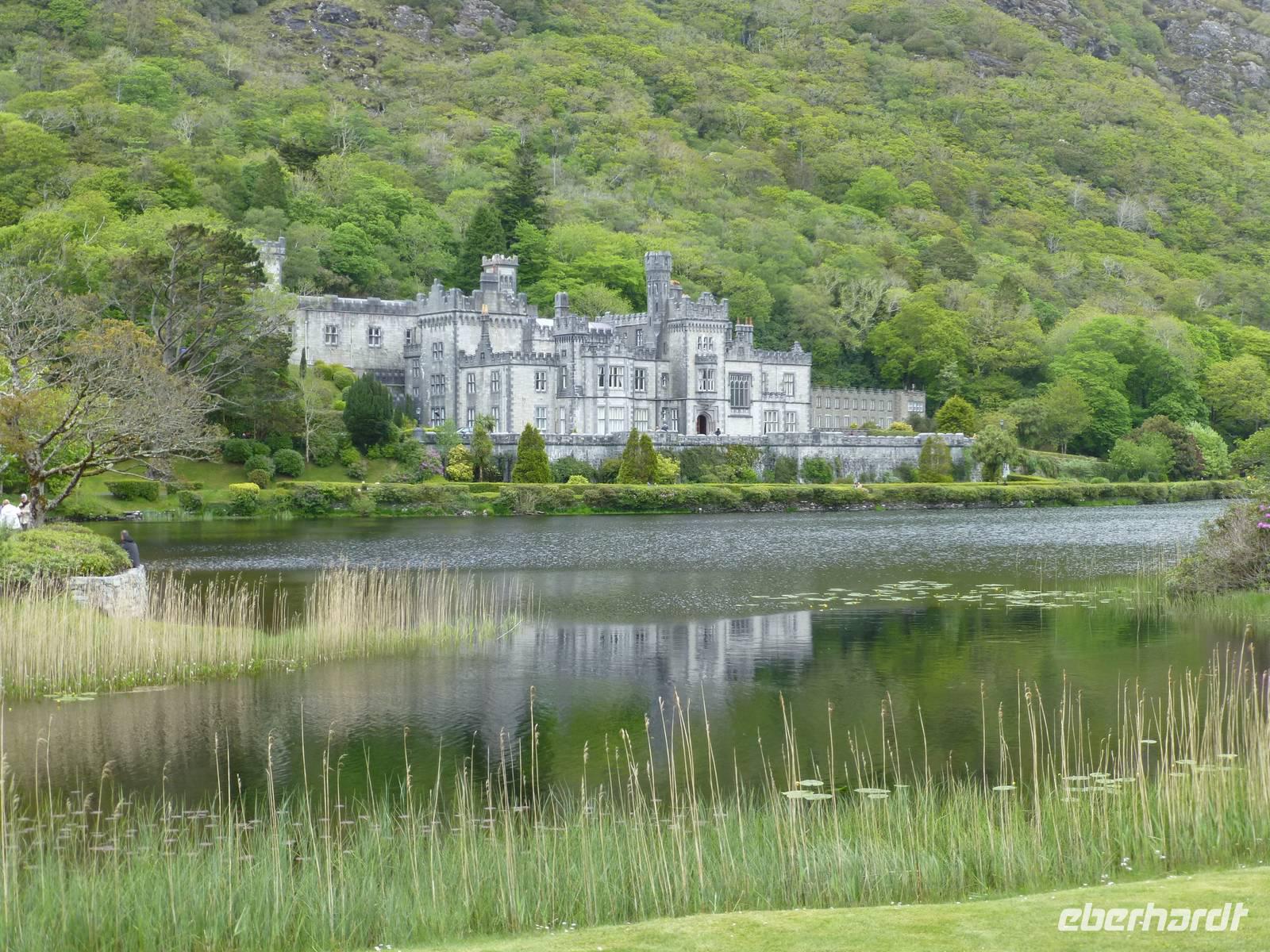 Anschließend fahren ein paar Kilometer weiter zum Conemara Nationalpark. Hierkönnen wir unsereMittagpause machen und im Nationalparkzentrum erhalten wir Informationen zu den Bogs, den Torffeldern. Unterwegs sind diese uns immer wieder begegnet. Jetzt können wir noch einmal gut sehen wie der Torf entstanden ist, wie er abgebaut wird und welches Leben im Torf herrscht. Das alles kostet übrigens keinen Eintritt, es wird vom irischen Staat finanziert. Kylemore Abbey ist unser nächster Besuchspunkt. Dabei handelt es sich nicht um eine Abtei im eigentlichen Sinne, sondern um ein von Benediktinern bis 2010 betriebenes internationales Mädchenpensionat. Die Lage des von Henry Mitchel erbauten Gebäudes ist einfach toll. Bei einer Besichtigung können wir das Abteigebäude, die neugotische Kirche und auch den Viktorianischen Garten sehen.