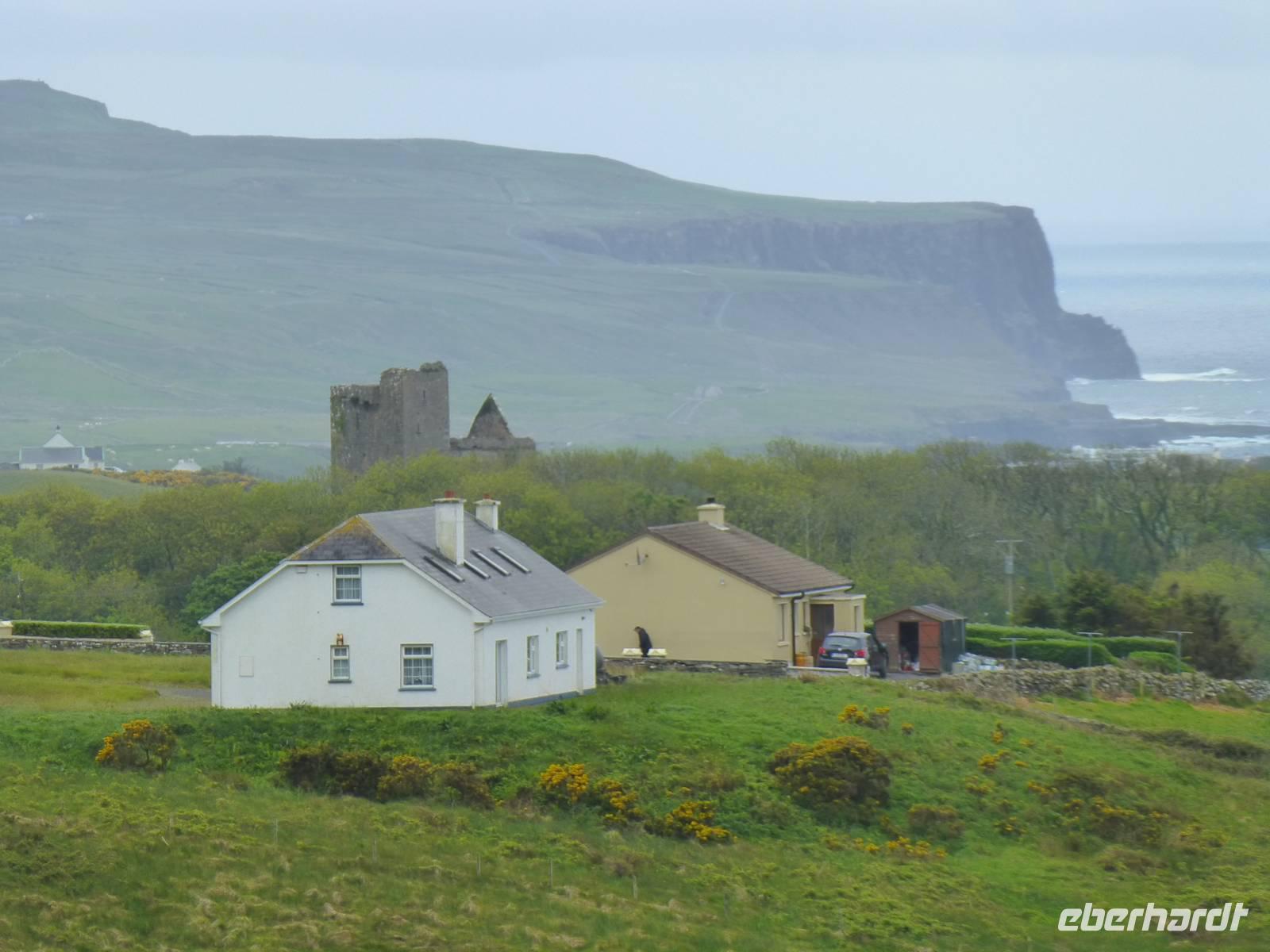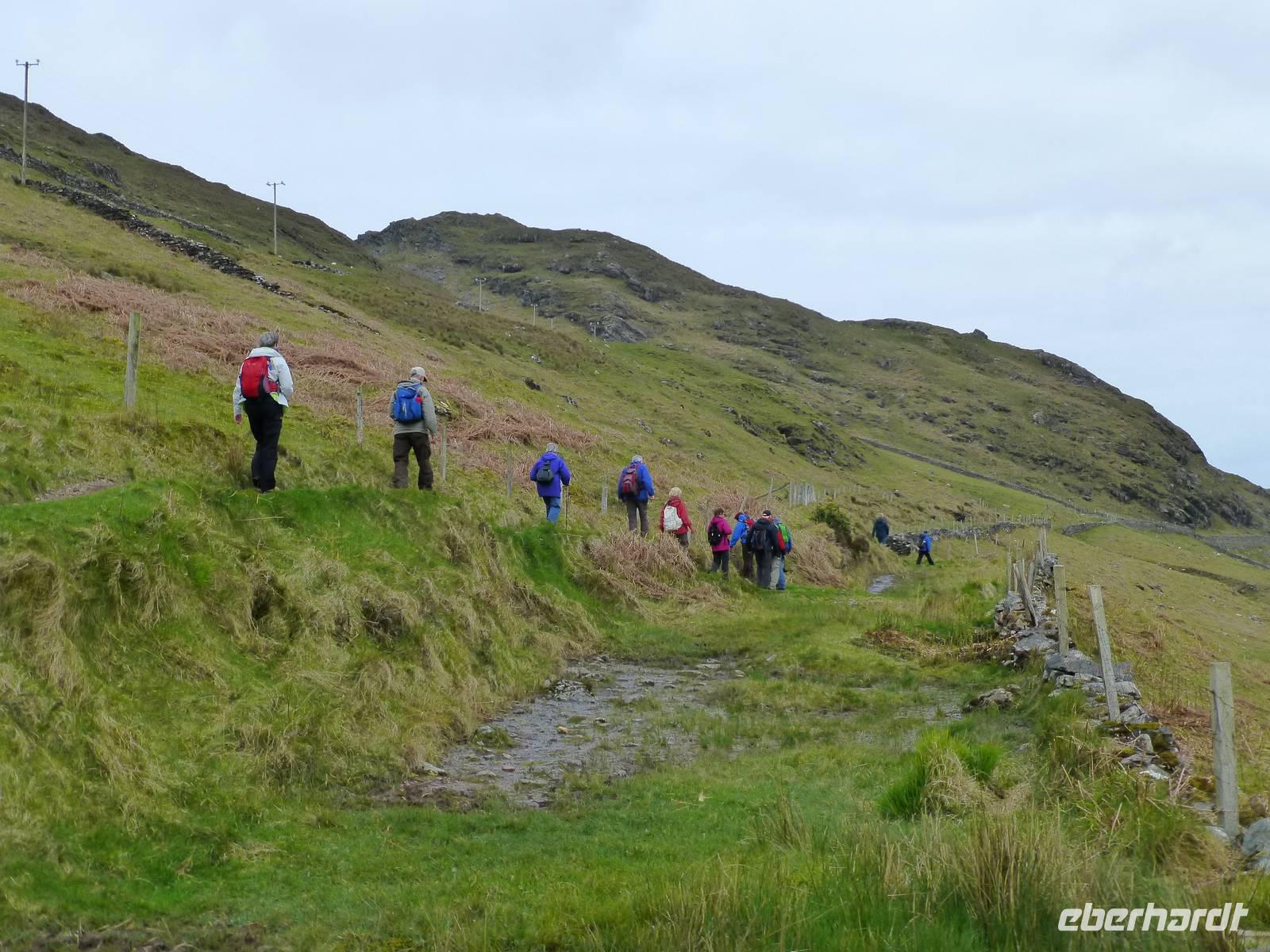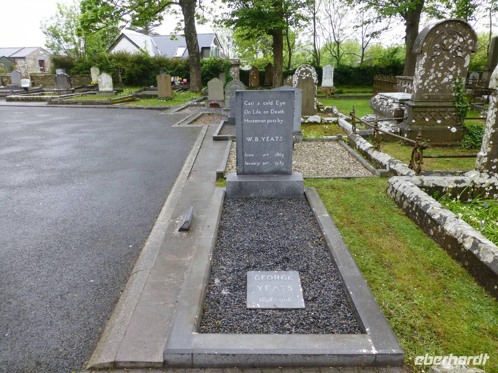 Als wir am Morgen von Letterkenny Richtung Süden aufbrechen scheint die Sonne. Doch bereits auf halben Weg nach Donagal ändert sich das Wetter, es nieselt und ist neblig. Einen ersten Halt machen wir in Drumcliff. Unterhalb des markanten Tafelberges Ben Bulben, der heute nicht zu sehen ist befindet sich der kleine Friedhof von Drumcliff. Vor zwei Tagen weilte Prinz Charles mit seiner Frau Camilla hier zu besucht um genau wie wir das Grab des irischen Schriftstellers und Literaturnobelpreisträgers von 1923, William Butler Yeats, zu besuchen. Es war sein Wunsch an dieser Stelle begraben zu sein. Auf seinem Grabstein befindet sich eine der berühmtesten selbst verfassten Grabinschriften der Welt: „Werfe einen kalten Blick, auf Leben, auf Tot, Reiter und dann ziehe weiter". Danach wollten wir eigentlich den Berg Knocknarea bei Sligo steigen. Er ist ein markanter Punkt und schon von weiten sieht man ihn, aber nicht heute. Da es leicht regnet und es am Berghang doch recht rutschig ist entscheide ich nicht aufzusteigen. Nach einer kurzen Beratung mit unserem Buschauffeur fahren wir nach Turlough in das „Museum of Country Life". Unterwegs wird das Wetter bereits besser. Im Museum bekommen wir einen Einblick über das sicher recht oft beschwerliche Landleben der irischen Bevölkerung in der Vergangenheit. Wir bekommen aber auch vermittelt, wie man mit bzw. von der Natur lebt. Später in Westport nutzen wir die Zeit etwas zum Bummeln und Wanderverpflegung für die nächsten zwei Tage zu kaufen. Das Wetter zeigt sich jetzt von seiner trockenen und teilweise sonnigen Seite und so ist doch noch eine kleine Wanderung möglich. Roy schlägt einen Weg entlang der Küste unterhalb des Croagh Patrick vor. Der Legende nach soll Irlands Nationalheiliger auf diesem Berg 40 Tage und Nächte verbracht haben auf der Findung mit sich selbst. Nachdem ihm klar war, dass er dem irischen Volk das Christentum bringen muss hat er mit einer Glocke geläutet und dabei ist die Schlange, sie galt als die Hüterin der Weisheit, erschrocken und von der Insel geflohen. Und so gibt es bis heute keine Schlangen in Irland. Die Wanderweg hat eine zwar etwas steinigen Untergrund, dafür ist der Blick über Clew Bay vom Feinsten und die eine oder andere Muschel lässt sich auch finden.