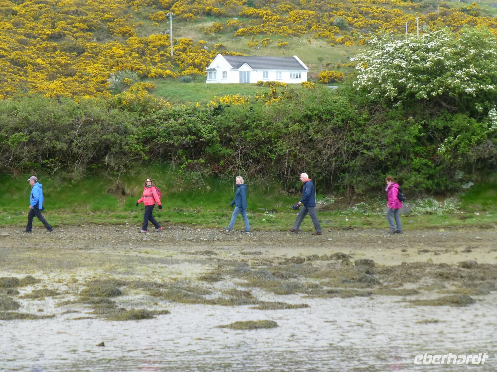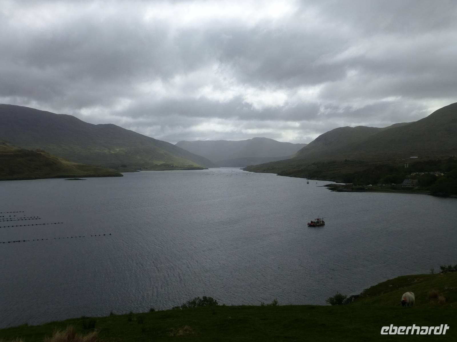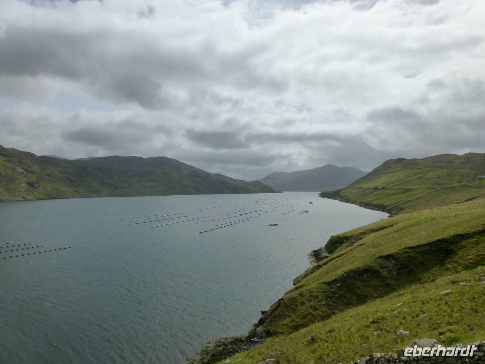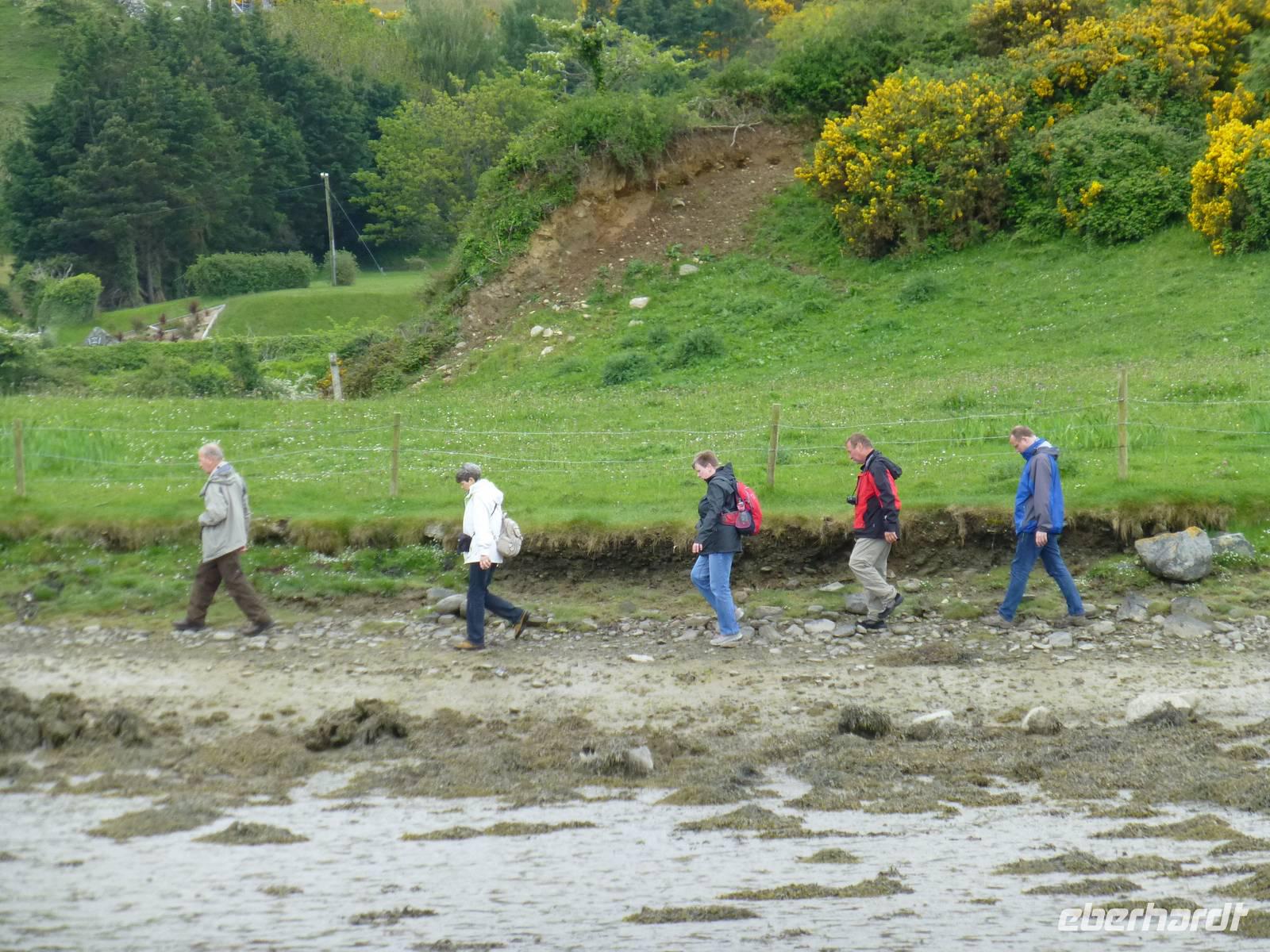 Das Wetter, immer ein Thema in Irland. Entlang des Kilarry Harbour, dem einzigen Fjord Irlands wandern wir gut 9 Kilometer bis nach Rosroe. Faszinierende Blicke auf die Umgebung bieten sich auf Schritt und Tritt. Unterwegs sehen wir einen Muschelzuchtbetrieb. Roy bringt seinen Bus zum Ende der Wanderung und stößt in der Hälfte des Weges zu uns, unser Busfahrer ist uns entgegen gelaufen. Wie schön, alle freuen sich darüber, auch wenn auf Grund der Sprachbarriere die Kommunikation gering ist.