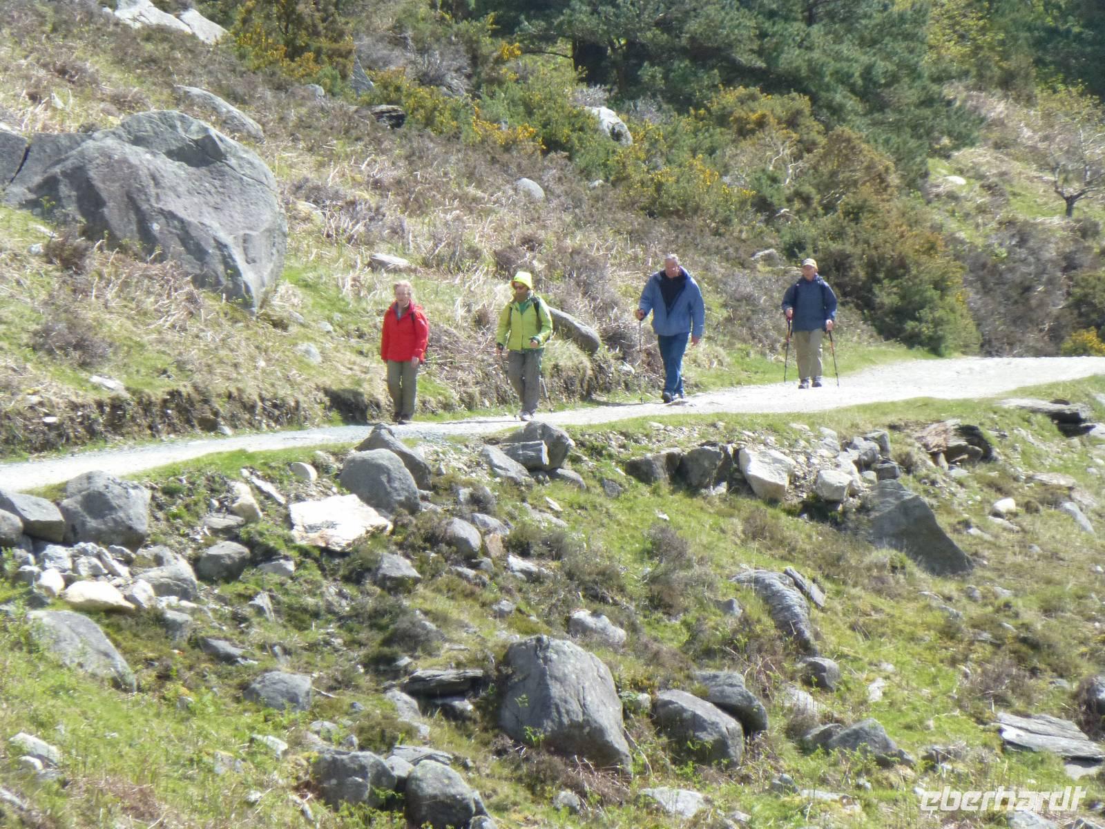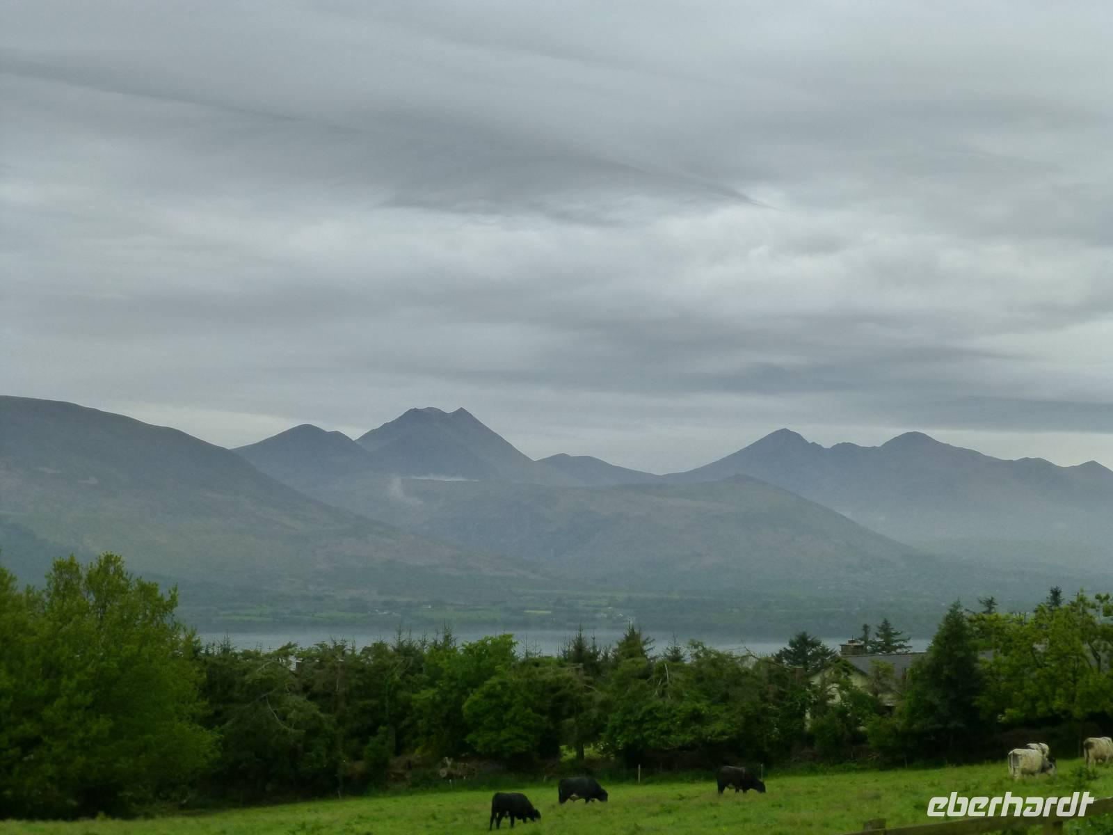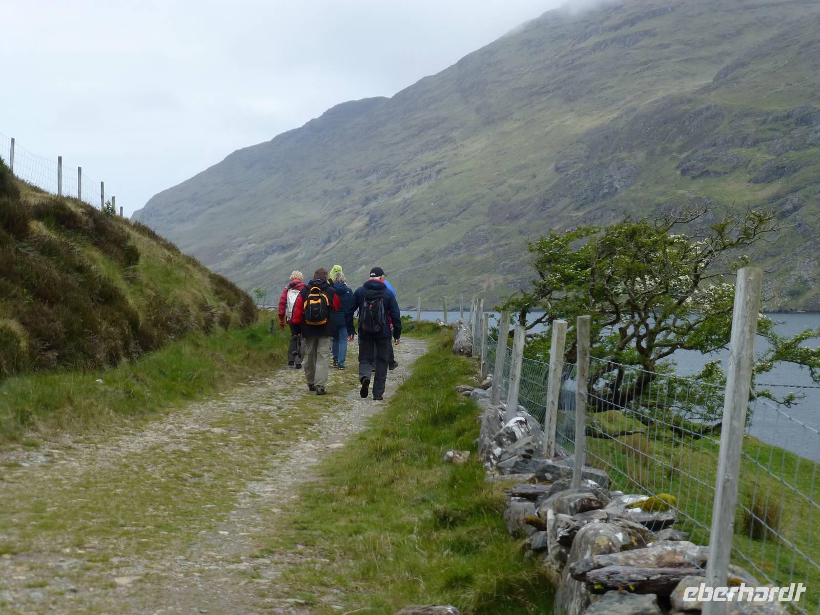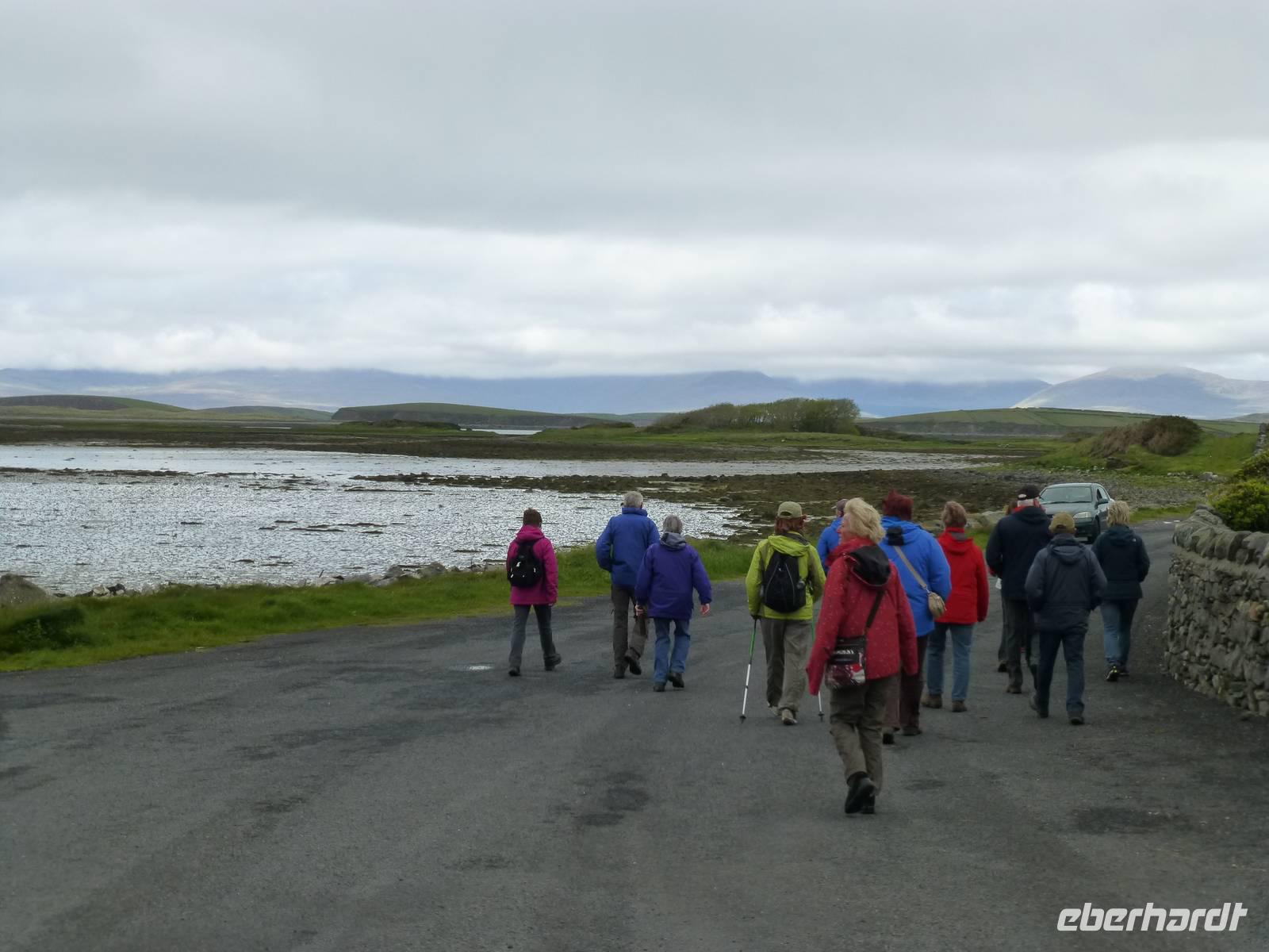 Das Wetter, immer ein Thema in Irland. Entlang des Kilarry Harbour, dem einzigen Fjord Irlands wandern wir gut 9 Kilometer bis nach Rosroe. Faszinierende Blicke auf die Umgebung bieten sich auf Schritt und Tritt. Unterwegs sehen wir einen Muschelzuchtbetrieb. Roy bringt seinen Bus zum Ende der Wanderung und stößt in der Hälfte des Weges zu uns, unser Busfahrer ist uns entgegen gelaufen. Wie schön, alle freuen sich darüber, auch wenn auf Grund der Sprachbarriere die Kommunikation gering ist.