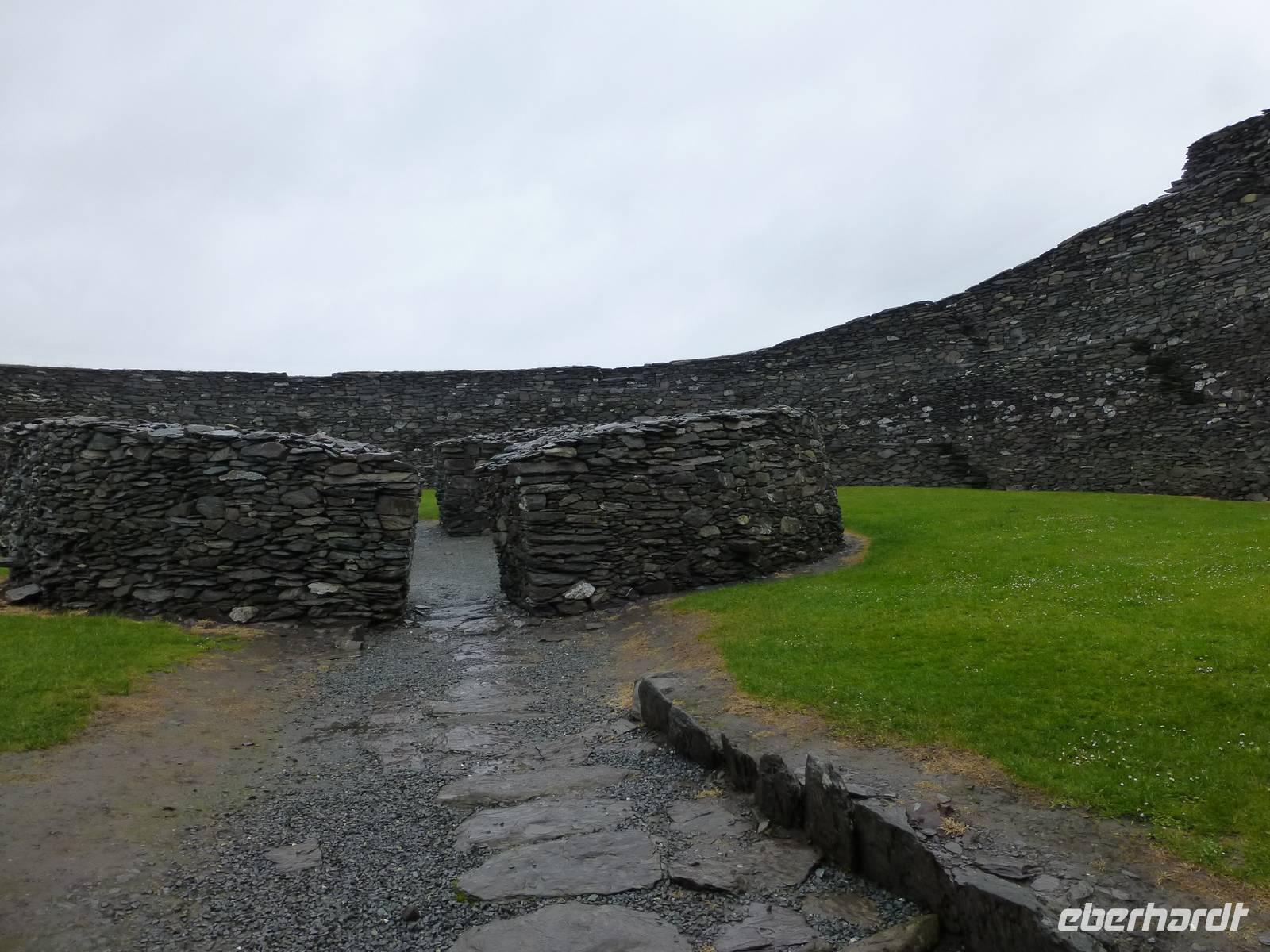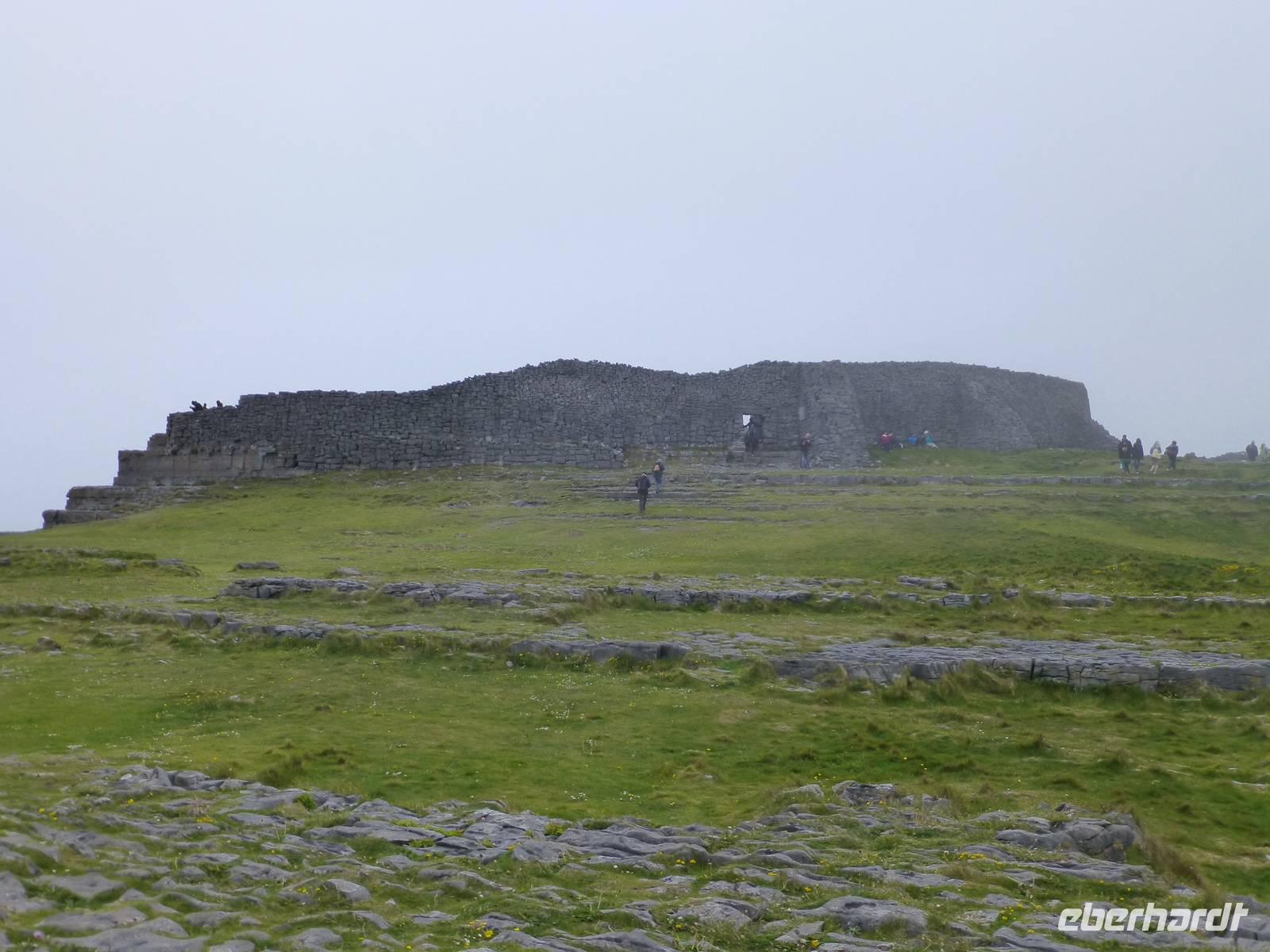 Wir besuchen heute die Insel Inishmore besuchen, die größte der drei Aran Inseln in der Bucht von Galway. Eigentlich ist das erst für morgen geplant, jedoch ist die Wettervorhersage nicht so toll. Am Morgen sieht es allerding gar nicht so gut aus, auf der Insel allerdings ist das Wetter recht gut, sogar die Sonne zeigt sich. Vom Hafen in Rosaveel fährt das Schiff ab. Die Überfahrt in den kleinen Inselhauptort Kilronan dauert ca. 45 Minuten. Anschließend führt der Weg entlang der Nordküste, als Wanderweg dient hier die Straße. Unterwegs machen wir halt an Kirians Kapelle, einer kleinen Kirche, welche St. Kirian, der Gründer von Clonmacnoise, gestiftet haben soll. Zur Mittagspause am Seal View Point können wir Robben beobachten die gemütlich in der Sonne liegen. Unser Ziel, die Ringfort Dun Aengus kommt jetzt auch schon ins Blickfeld. Das Ringfort ist vor allem wegen seiner Mauern aus 6500 t Steinen und der spektakulären Lage direkt an den Klippen interessant. Wer es erbaut hat ist nicht eindeutig klar, auch nicht wer Dun Aengus war. Der Name wurde erst im 20. Jh. vergeben. Nachdem man die innere Mauer hinter sich gelassen hat, könnte man meinen man verlässt diese Welt, denn vor sich hat man nur noch das Meer. Auf dem Bauch liegend darf man die Klippen hinab schauen, 100 Meter unter uns tost das Meer. Und natürlich lassen sich einige Gäste das auch nicht entgehen. Am Visitor Center wartet später ein kleiner Bus und bringt uns zurück zum Hafen von Kilronan. Wir fahren mit dem Schiff zurück nach Rosaveel und dann mit dem Bus zurück nach Leenaun. Zum Abendessen lassen wir uns wieder durch die hervorragende Küche des Hotels verwöhnen.