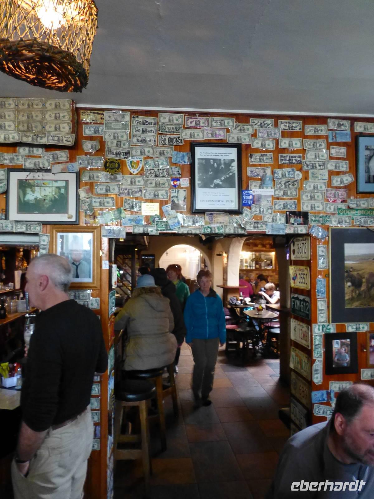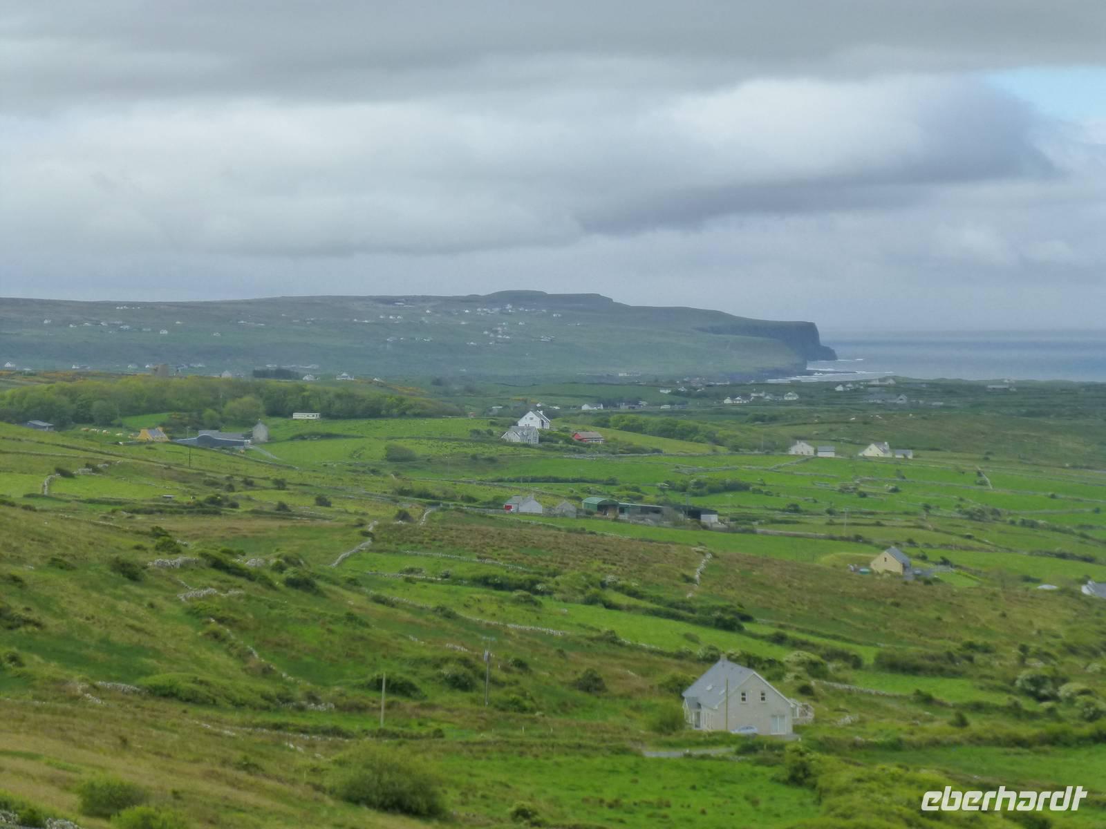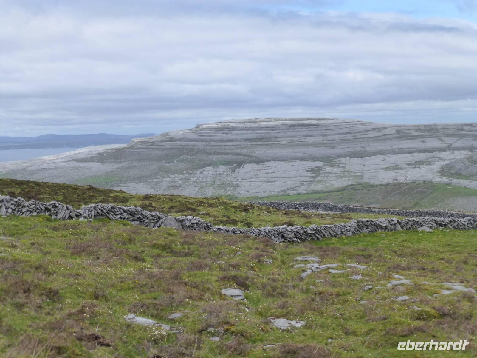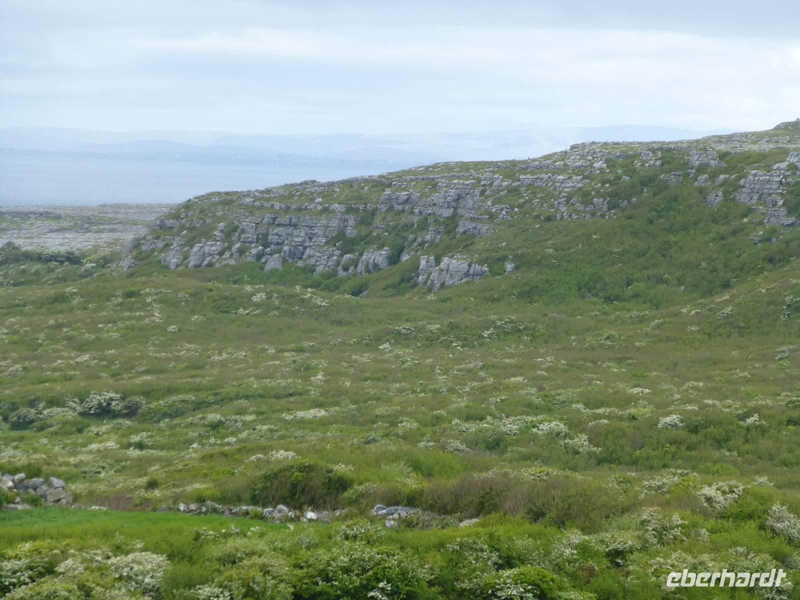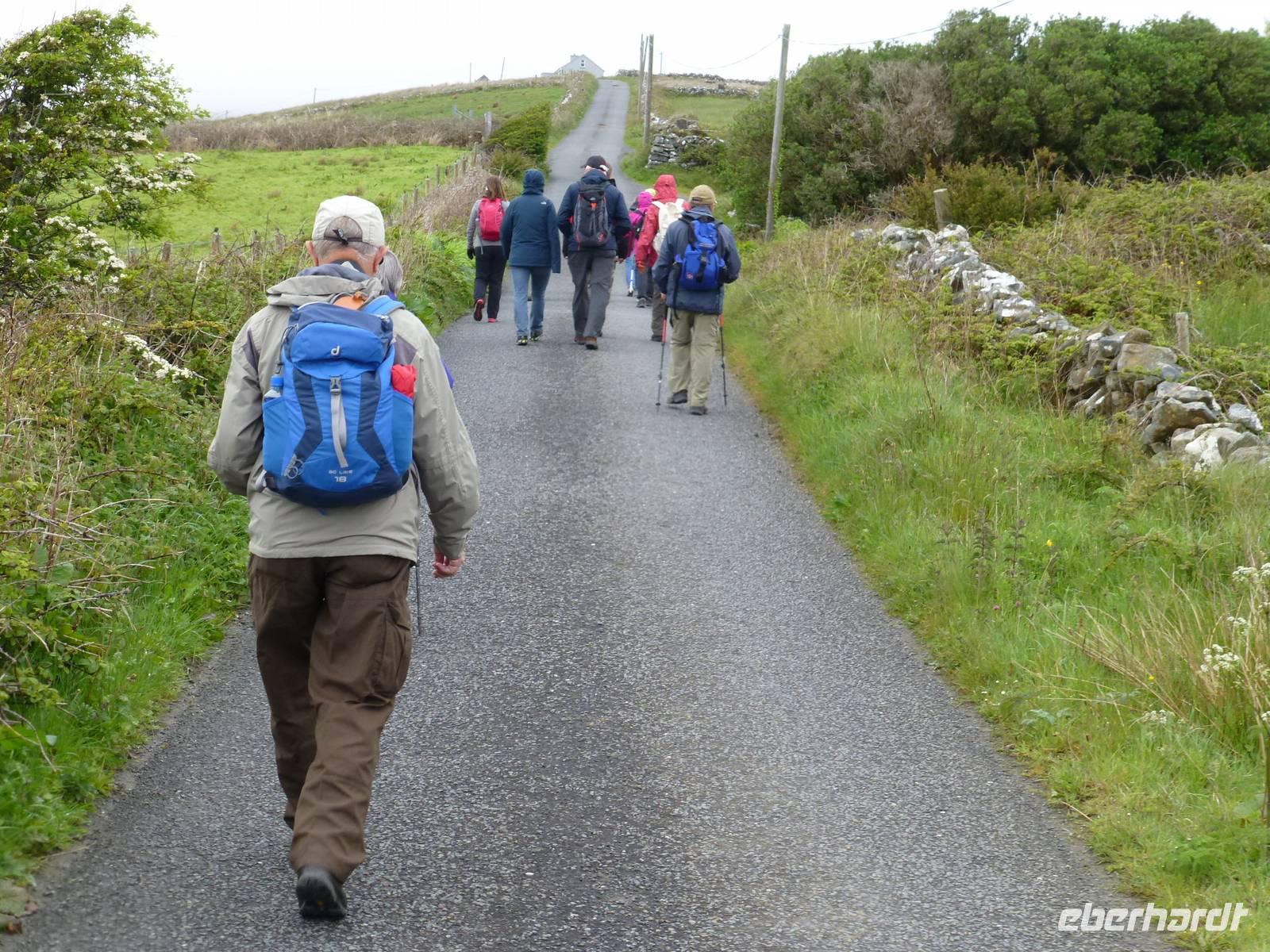 Am Morgen begrüßt uns wieder leichter „Drizzle", aber wir lassen uns nicht schrecken. Wir verbringen den heutigen Tag im Burren, einer einzigartigen Kartslandschaft wie sie sonst nirgendwo in Irland anzutreffen ist, mit Ausnahme der Aran Islands. Zuerst machen wir einen Fotostopp an der Kilmagdough Abbey, einem ehemaligen Kloster. Hier sehen wir einen sehr schönen Rundturm, das besondere an ihm ist, das er 60 cm außer Lot steht. Unser weiterer Weg bringt uns nach Kilfenora, wo wir die dortige kleine Kathedrale besuchen. Hier findet man interessante Hochkreuze mit christlichen Symbolen aber auch mit keltischen/skandinavischen Motiven. Unsere Wanderung beginnt in der Nähe des Ballynalacken Castle, einem alten irischen Wohnturm welcher auf privaten Gelände steht. Der Burren Way benutzt hier erst einmal die kleine Straße und es geht immer leicht auf und ab. Die Aussicht ist von Beginn an traumhaft, wir können hinüber zu den drei Aran Inseln sehen, sehen die Cliffs of Moher und ebenso das Gebiet von Connemara auf der anderen Seite der Galway Bay. Über eine Greenroad wandern durch mit Steinmauern begrenzte Weiden, später öffnet sich der Blick wieder und die einzigartige Karstlandschaft liegt vor uns. Nach einer Mittagspause und dem Abstieg ins Caher Valley treffen wir unseren Bus wieder. Inzwischen kommt die Sonne raus und wir fahren noch nach Doolin, einem kleinen Ort an der Küste. Im O'Connels Pub können wir unsern Durst löschen oder auch einen „Irish Coffee" genießen. Unsere Rückweg führt über Ennistimon und Ennis nach Gort.