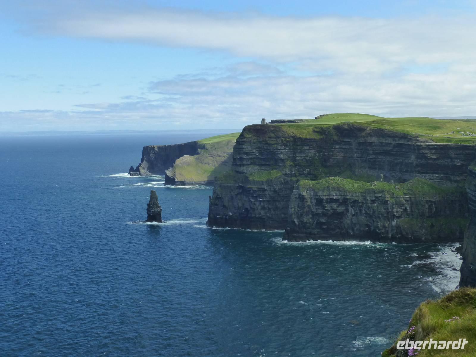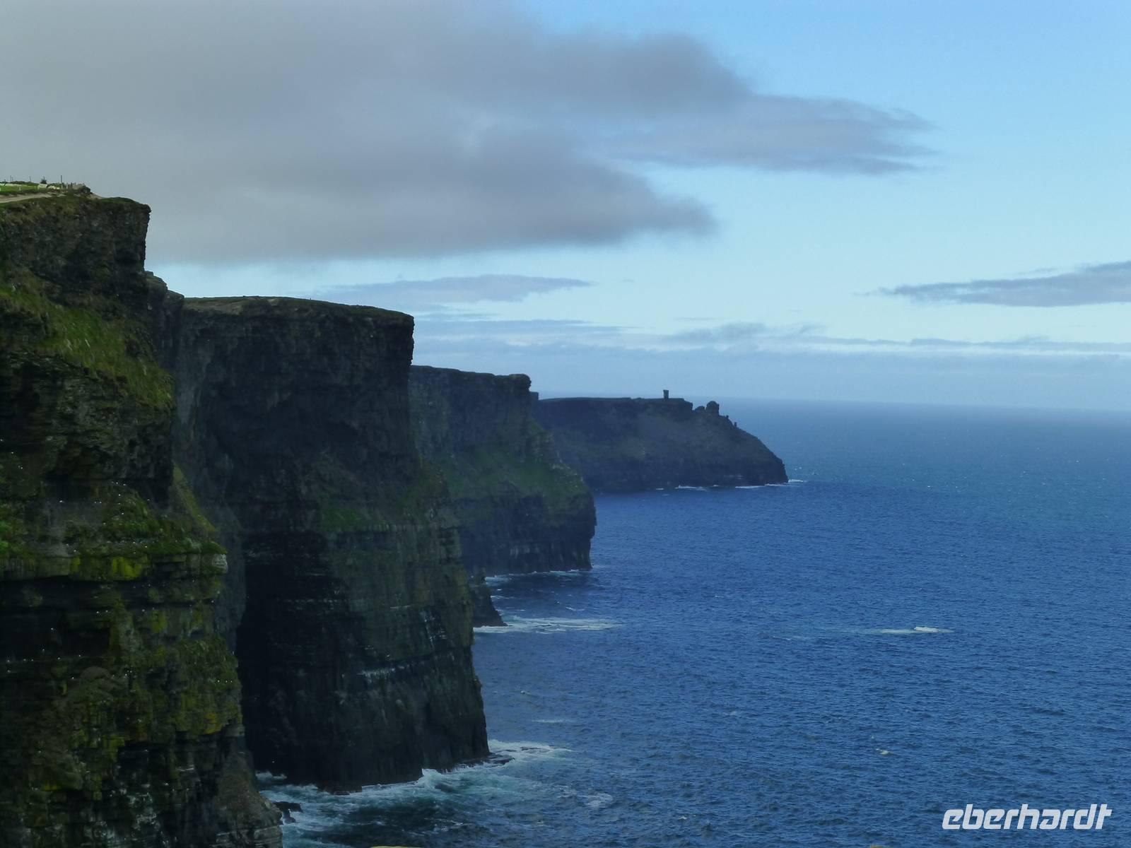 Wir fahren nach dem Frühstück zu den Cliffs of Moher. Die bis zu 200 Meter hohen Klippen können wir bei Sonnenstrahlen genießen. Ein Spaziergang entlang der Klippen gibt einen wunderschönen Blick frei, man sieht mehr als wenn nur der Aussichtspunkt besucht wird. Nach Kilimer zur Shannon Ferry nutzen wir die Küstenstraße über Spanish Point. Die Überquerung des mit 370 km längsten Fluss Irlands spart uns 90 Kilometer Straße. Vor der Vom Fähranleger in Tarbet sind es nur wenige Minuten bis nach Listowel zu fahren. In Listowel gibt es ein technisches Kleinod zu besichtigen, die Lartigue Mono Railway. Es handelt sich dabei um eine kleine Museumseisenbahn, eine Einschienenbahn. Diese ist einmalig in Europa. Gebaut wurde Sie 1888 und war bis 1924 in Betrieb, die Strecke war 10 Meilen lang und führte nach Ballybunion. Wir bekommen eine Führung, sehen einen Film über die Originalstrecke und fahren natürlich auf der nachgebauten Bahnstrecke. Die Dampflok fährt heute zwar mit einem Dieselmotor, das ist aber nicht minder interessant. Mit viel Freude sind die Mitarbeiter dabei uns alles zu zeigen, wir können Fotos machen so viel wir wollen. Wenig später erreichen wir Tralee und der restliche Nachmittag steht zur freien Verfügung. Nach dem Abendessen im Brandon Hotel besuchen die meisten Gäste noch die Vorstellung „Fadó Fadó" im Siamsa Tire Folk Theater.