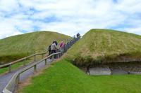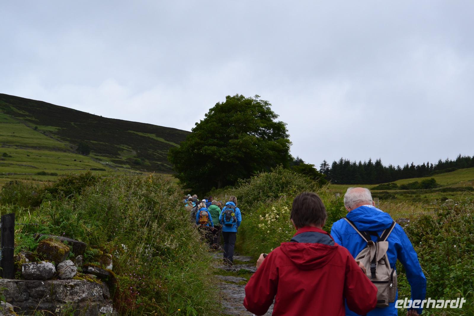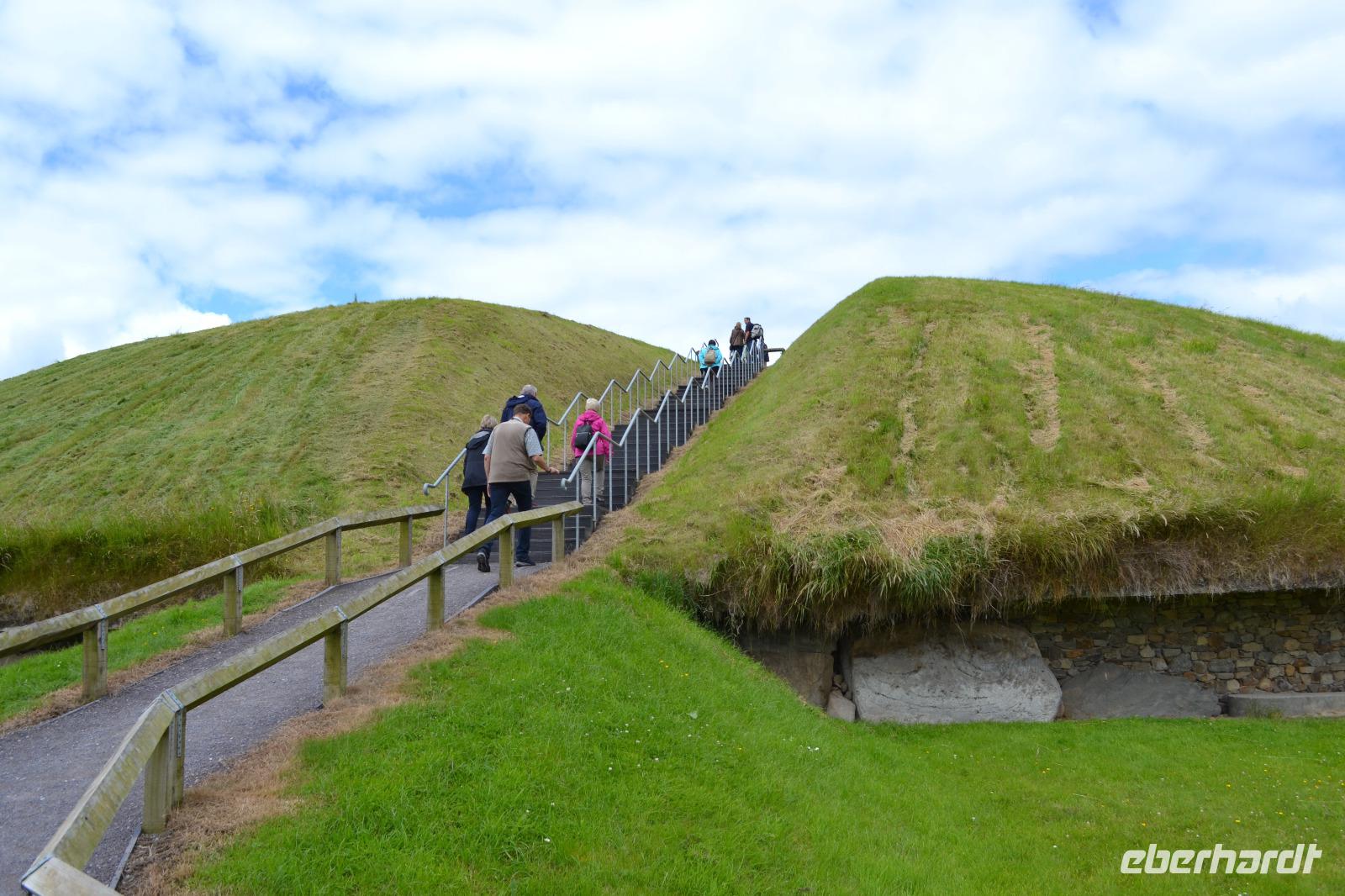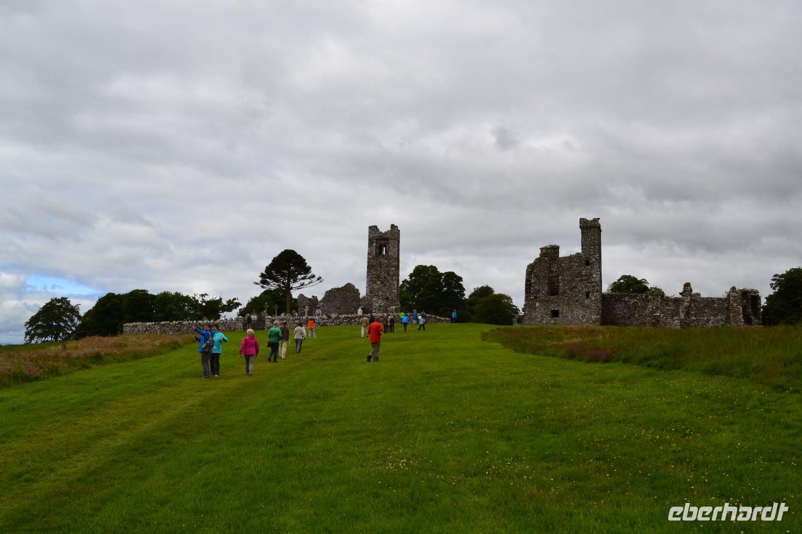 Schon am nächsten Morgen verlassen wir Dublin wieder, denn auf dieser Reise zieht es uns vor allem hinaus in die Natur! Zunächst aber begrüßen wir Diane, die uns bis zum Ende als Fahrerin immer sicher ans Ziel bringen und auch unsere Wanderungen begleiten wird. Unser erstes Ziel sind die Ruinen von Monasterboice, vor allem bekannt für die drei Hochkreuze. Mit 7,10 m ist das sog. Westkreuz sogar das höchste Kreuz in Irland. Diese Kreuze dienten nicht zur Verzierung von Grabstätten, sondern den Klosterbewohnern vor allem als Sammelpunkt. Mit Hilfe der eingemeißelten bildhaften Darstellungen erklärten die Mönche der des Lesens und Schreibens nicht mächtigen Bevölkerung die biblischen Geschichten. Die Friedhöfe der längst verfallenen alten Klöster werden übrigens immer noch genutzt, solange die Familien noch existieren. Anschließend fahren wir zum Hill of Slane, auf dem der irische Nationalheilige St. Patrick das erste Osterfeuer Irlands entzündete und so den in der Nähe wohnenden Hochkönig von Tara sehr erzürnte. Für St. Patrick ging die Geschichte glimpflich aus, da der oberste Druide des Hochkönigs zum Christentum konvertierte. Wir fahren weiter ins Boyne Valley. Hier fand im Jahre 1690 die Schlacht am River Boyne statt, deren Ausgang nicht nur das Schicksal Irlands, sondern der gesamten britischen Inseln, nachhaltig bestimmte. Die Truppen des protestantischen englischen Königs Wilhelm III. von Oranien schlugen hier in diesem Tal die Armee des abgesetzten katholischen Königs Jakob II. und vernichteten damit auch die Hoffnungen der mehrheitlich katholischen irischen Bevölkerung auf ein Ende der protestantischen Unterdrückung. Zu allem Überfluss war Jakob II. auch noch der Schwiegervater von Wilhelm.