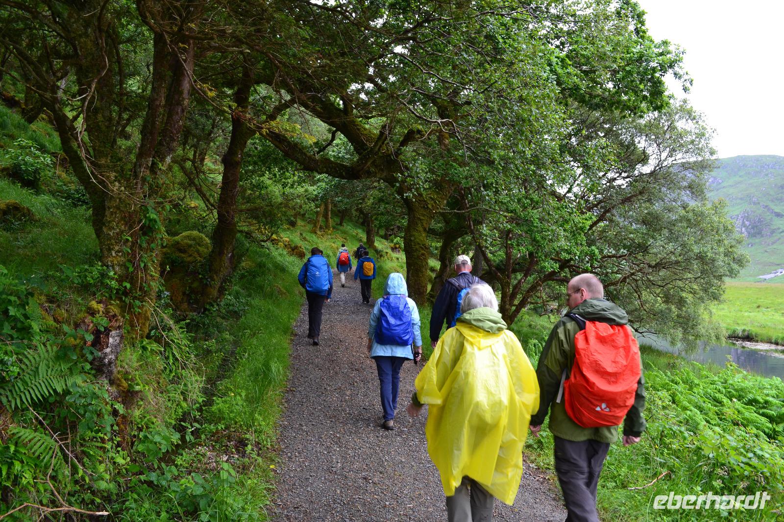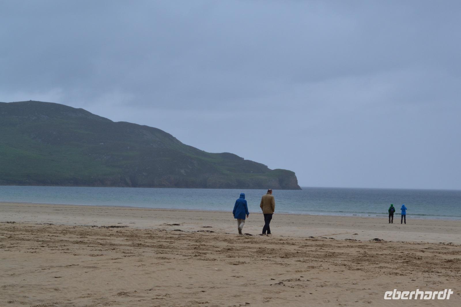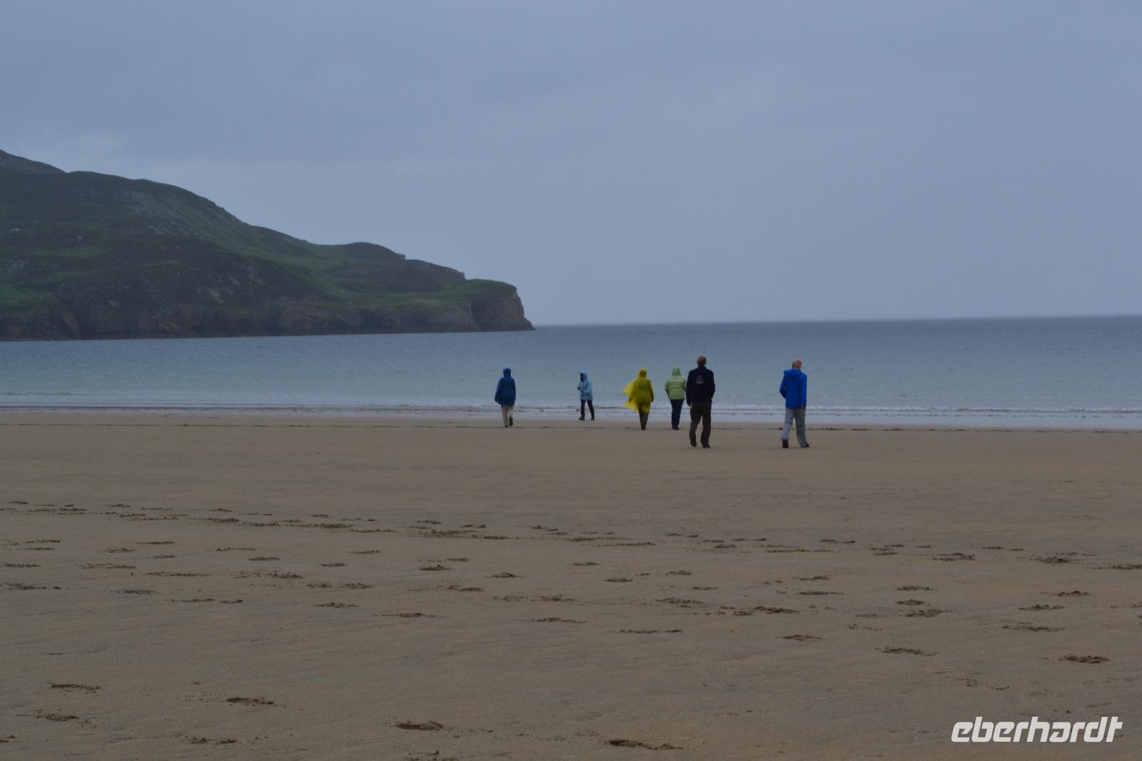 Unsere erste Wanderung steht an! Nach 30 min Fahrt erreichen wir um 9 Uhr den Glenveagh National Park. Das Wetter? Noch ist es trocken. Wir besichtigen zunächst das Glenveagh Castle, erbaut in der Mitte des 18. Jahrhunderts von einem reichen irischen Geschäftsmann und Landspekulanten, John George Adair. Er wollte damit den schottischen Landsitz der Königin, Schloss Balmoral, übertreffen oder zumindest damit konkurrieren. Zumindest die Lage ist traumhaft und man hat einen herrlich Blick über den See. Nicht verwunderlich, dass sich im Laufe der Zeit hier viele bekannte Stars die Klinke in die Hand gaben, z. B. Greta Garbo und Yehudi Menuhin. Wir wandern entlang des Sees durch einen kleinen urtümlichen Wald bis zu einer Hütte, die uns nicht nur vor dem einsetzenden Regen Unterschlupf bietet, sondern auch Gelegenheit für eine Mittagspause. Zurück am Schloss gibt es noch die Gelegenheit für einen Abstecher zum höher gelegenen Aussichtspunkt und eine Besichtigung der wunderschönen Gartenanlagen. Auch das kleine Café sieht sehr einladend aus und hat sogar Schokoladenkuchen im Angebot. Zurück zum Visitor Centre geht es entweder mit dem Shuttlebus oder zu Fuss. Auf dem Rückweg nach Letterkenny machen wir noch einen kurzen Umweg und halten an einem malerischen Sandstrand kurz hinter Dunfanaghy.