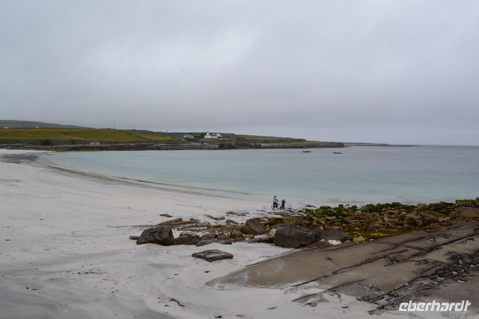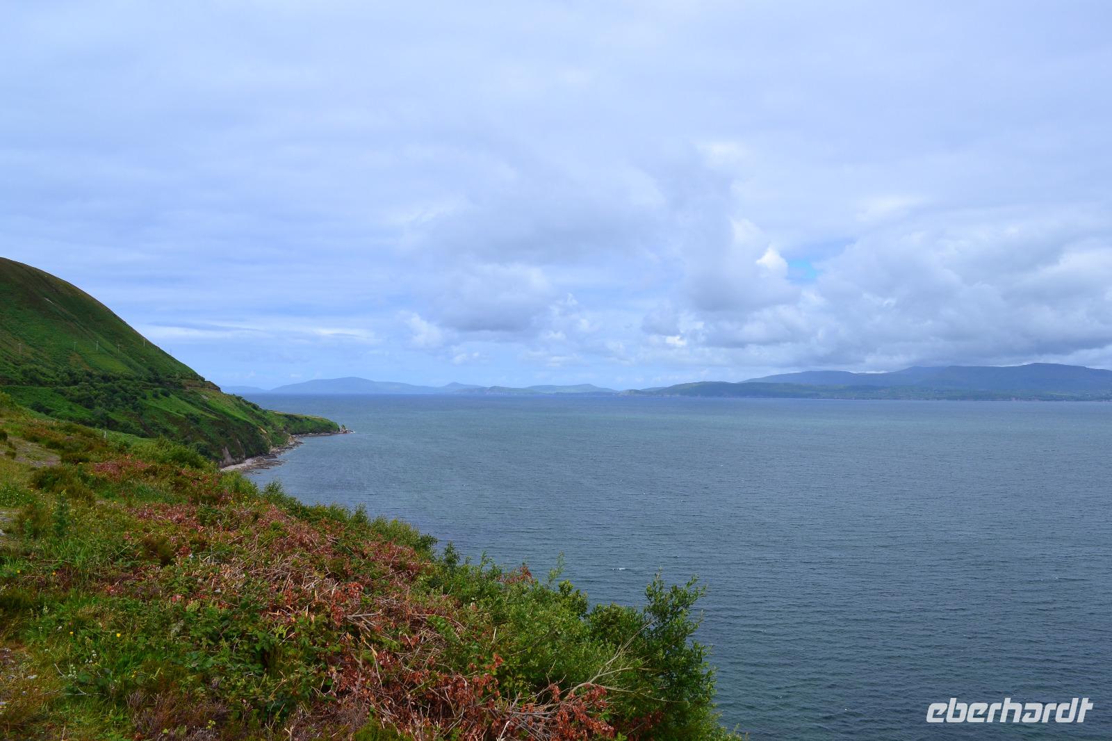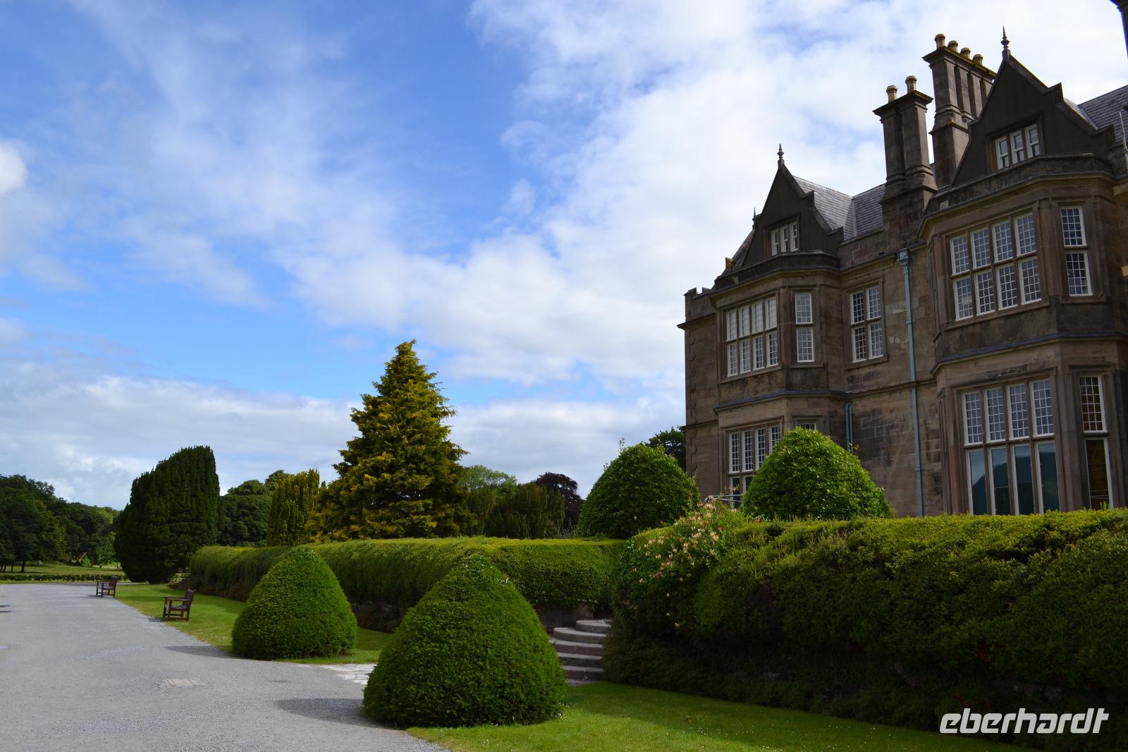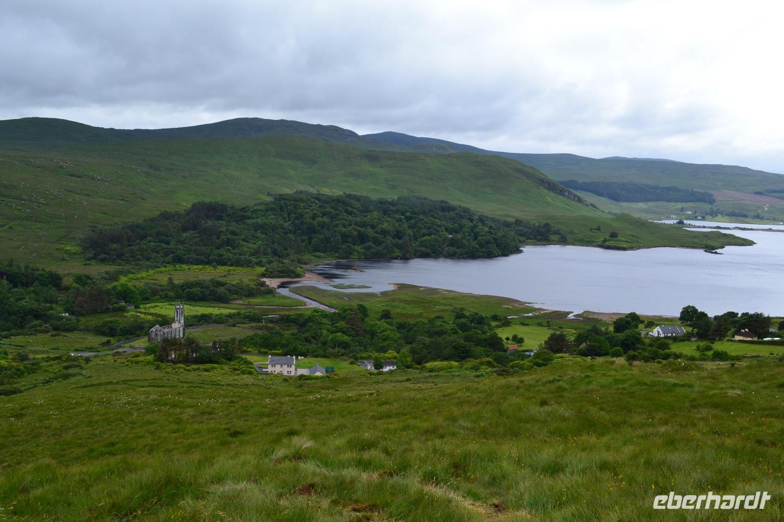 Unsere erste Wanderung steht an! Nach 30 min Fahrt erreichen wir um 9 Uhr den Glenveagh National Park. Das Wetter? Noch ist es trocken. Wir besichtigen zunächst das Glenveagh Castle, erbaut in der Mitte des 18. Jahrhunderts von einem reichen irischen Geschäftsmann und Landspekulanten, John George Adair. Er wollte damit den schottischen Landsitz der Königin, Schloss Balmoral, übertreffen oder zumindest damit konkurrieren. Zumindest die Lage ist traumhaft und man hat einen herrlich Blick über den See. Nicht verwunderlich, dass sich im Laufe der Zeit hier viele bekannte Stars die Klinke in die Hand gaben, z. B. Greta Garbo und Yehudi Menuhin. Wir wandern entlang des Sees durch einen kleinen urtümlichen Wald bis zu einer Hütte, die uns nicht nur vor dem einsetzenden Regen Unterschlupf bietet, sondern auch Gelegenheit für eine Mittagspause. Zurück am Schloss gibt es noch die Gelegenheit für einen Abstecher zum höher gelegenen Aussichtspunkt und eine Besichtigung der wunderschönen Gartenanlagen. Auch das kleine Café sieht sehr einladend aus und hat sogar Schokoladenkuchen im Angebot. Zurück zum Visitor Centre geht es entweder mit dem Shuttlebus oder zu Fuss. Auf dem Rückweg nach Letterkenny machen wir noch einen kurzen Umweg und halten an einem malerischen Sandstrand kurz hinter Dunfanaghy.