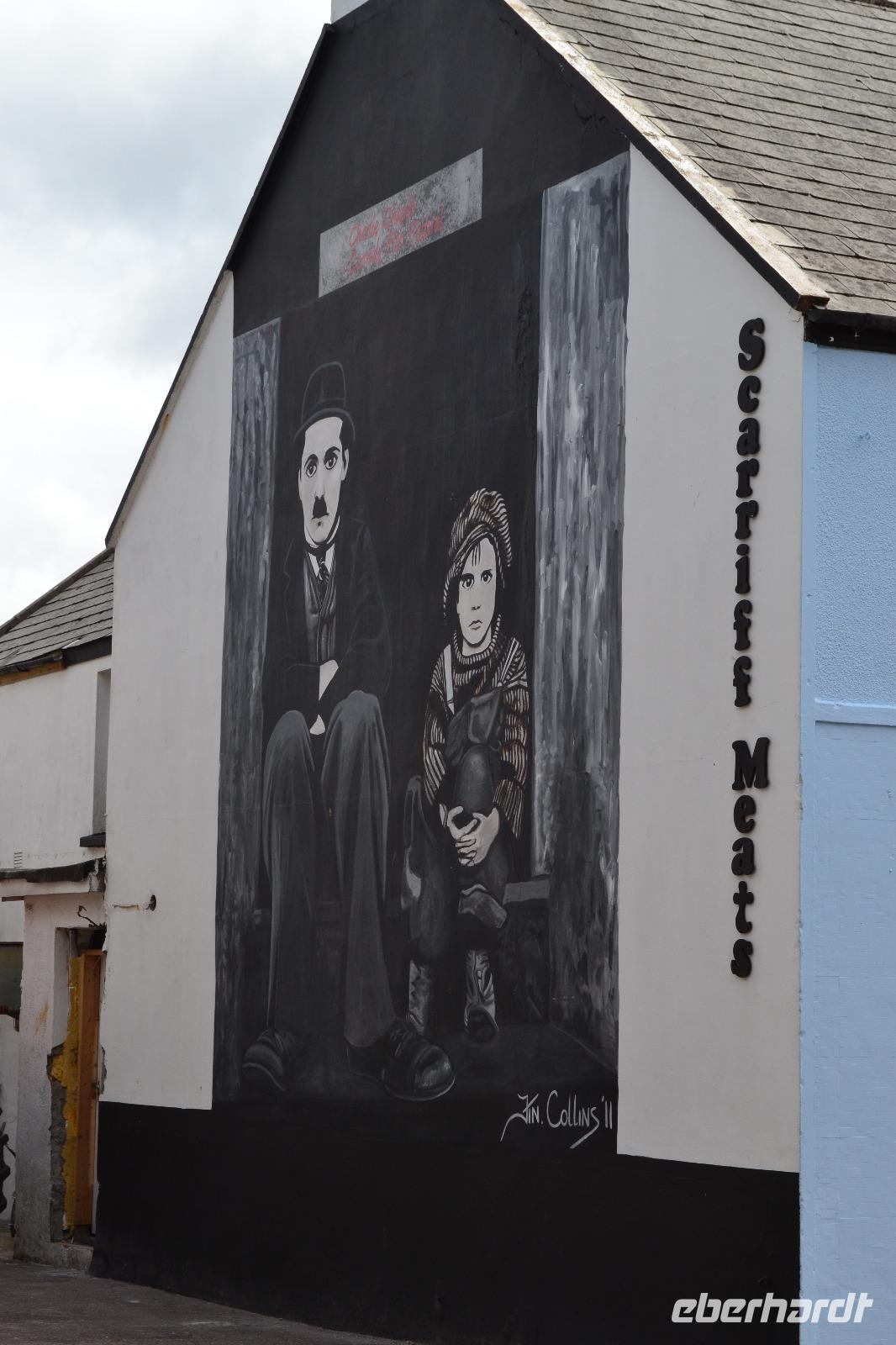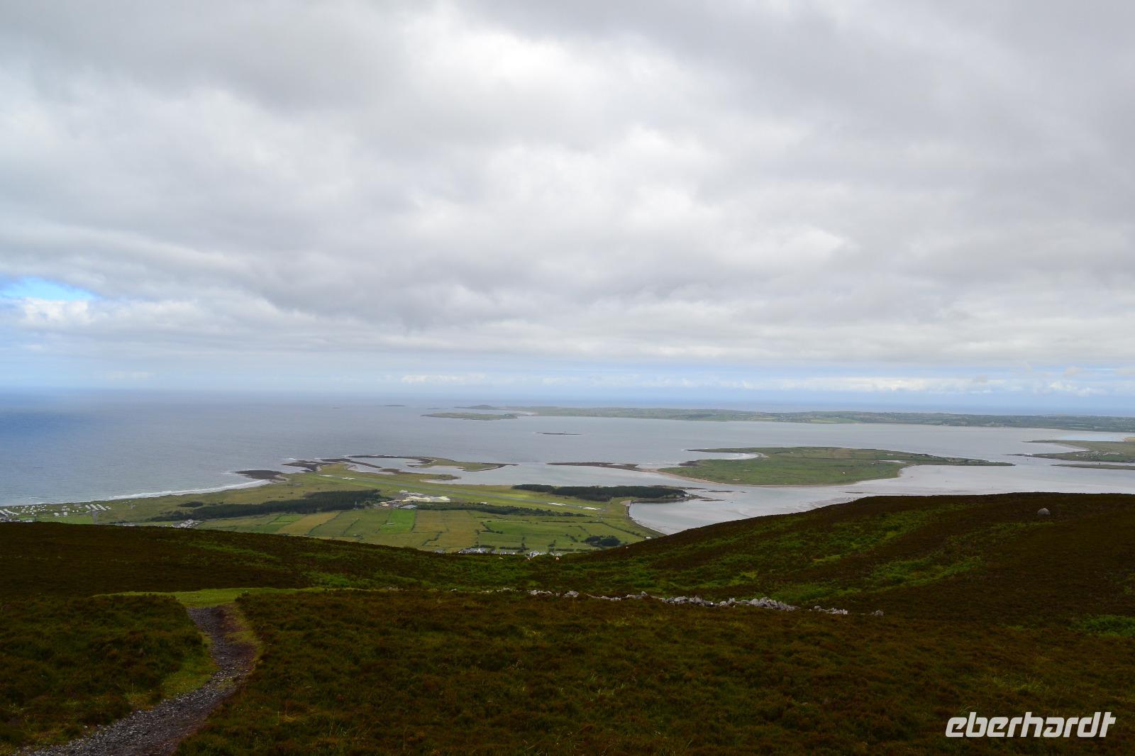 Wir verlassen das County Donegal und beginnen unsere Reise entlang der Westküste gen Süden. Unser erster Stopp ist der Friedhof von Drumcliff, unterhalb des Tafelberges Ben Bulben gelegen, der sich am Morgen noch etwas ziert und in Wolken einhüllt. Auf dem Friedhof befindet sich das Grab des irischen Schriftstellers William Butler Yeats, der im Jahr 1923 den Nobelpreis für Literatur erhielt. Der Grabstein selbst ist recht unscheinbar und vor allem für seine von Yeats selbst gewählte Inschrift bekannt: „Cast a cold Eye / On Life, on Death / Horseman pass by" (Werfe einen kalten Blick / Auf Leben, auf Tod / Reiter und dann zieh weiter). Die kleine Steinkirche des Friedhofs ist da mit ihren Buntglasfenstern und einem riesigen Fliesengemälde zumindest optisch attraktiver und einen Blick ins Innere wert. Das Wetter verschont uns heute mit Regen und so wagen wir den Aufstieg auf den Knocknarea unweit von Sligo. Auf dessen Gipfel befindet sich ein riesiger Steinhaufen, von dem man sagt, dass er das Grab der Kriegerkönigen Maeve sein soll. Der Ben Bulben hat inzwischen seine Scheu verloren und lüften seinen Wolkenmantel. Wir umrunden das Grab einmal und blicken hinunter in das grüne Tal und auf den Atlantik, der sich majestätisch vor uns erstreckt. Ein Besuch in Westport rundet unser Tagesprogramm ab. Wir haben Gelegenheit gemütlich einen Kaffee zu trinken und Proviant für das Wochenende zu kaufen. Am Abend erreichen wir unser Hotel in Leenane, dass sich direkt am Killary Harbour befindet, dem einzigen Fjord Irlands. Schokoladenkuchen gibt es zwar nicht, doch wir können nun nachvollziehen warum unser Reiseleiter Ralf schon die ganze Reise über von der Crème Brûlée geschwärmt hat.