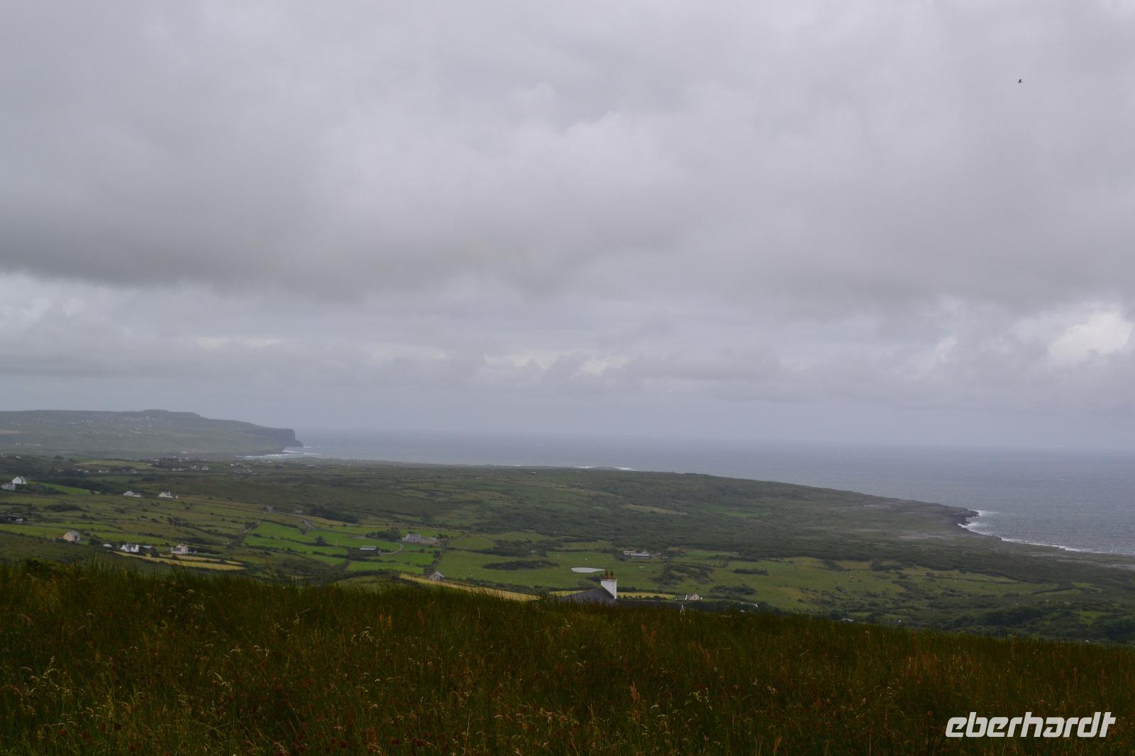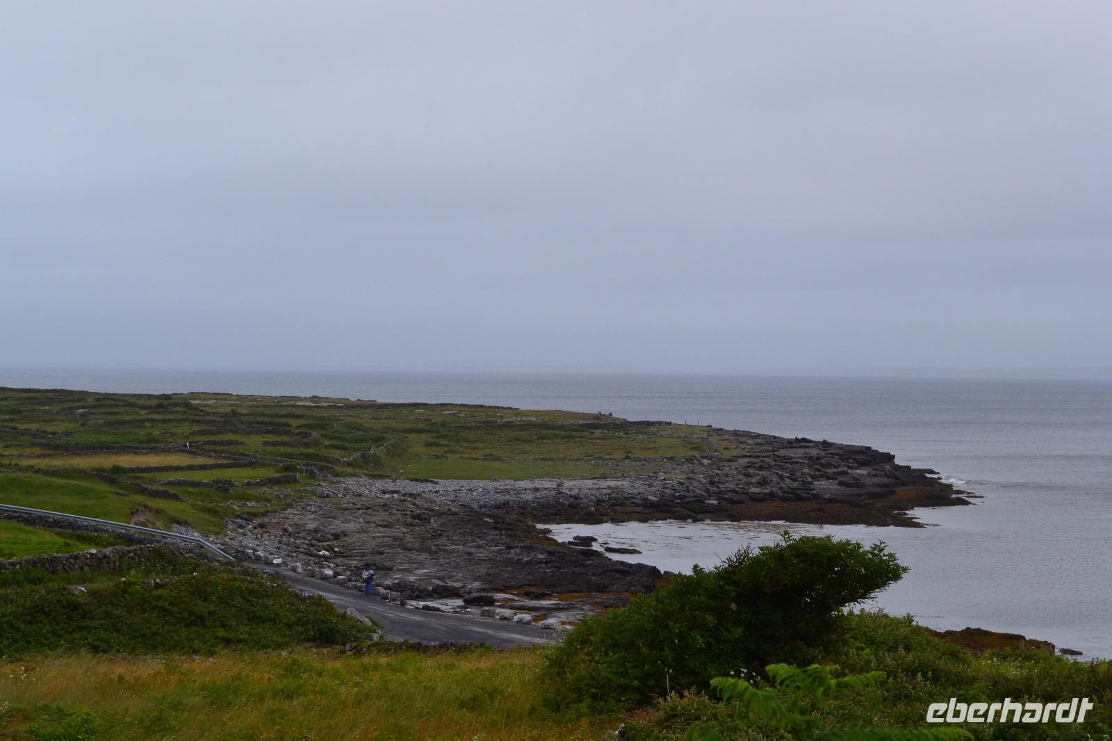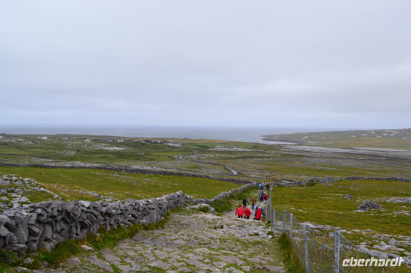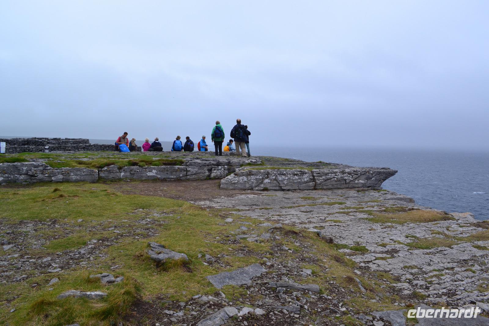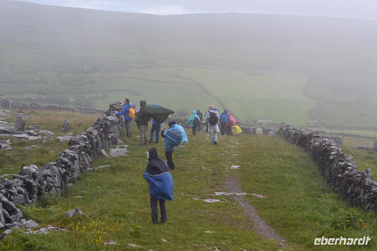 An der Kilmacduagh Abbey machen wir heute den ersten Halt. Der Rundturm dieser Klosterruine gilt auch als der schiefe Turm von Irland, da er etwas außer Lot steht. Er ist mehr als 30 m hoch und sein einziger Eingang befindet sich in einer Höhe von ungefähr 7 m. Über typisch irische enge, von Steinmauern und Hecken gesäumte Straßen geht es weiter nach Kilfenora. In den Überresten der kleinen Kathedrale des Ortes finden sich noch einmal ein paar schöne Hochkreuze mit christlichen und alten keltischen Motiven. In der Nähe des Ballinalacken Castle befindet sich der Ausgangspunkt unser heutigen Wanderung, die uns durch den Burren führen wird, eine einzigartige Karstlandschaft, in der sich sowohl mediterrane als auch arktische Pflanzen wohlfühlen. Von hier aus hat man auch eine gute Aussicht auf die Aran Islands - zumindest theoretisch. Denn wir wandern heute die meiste Zeit über mitten durch eine Regenwolke, die sich langsam von der Küste her über die karge Landschaft schiebt. Und tatsächlich sieht man in die Pfützen keine Regentropfen fallen (der Wetterbericht stimmte also). Wir allerdings werden trotzdem nass, bevorzugt an der dem Wind zugewandten Seite. Doch wir nehmen es mit Humor, laufen etwas schneller und sehen in unseren Regencapes ein bisschen aus wie die sieben Zwerge. Und ein bisschen fühlt man sich durch die Landschaft und die Atmosphäre tatsächlich auch wie in eine alte irische Sage oder ein Märchen hineinversetzt. Am Ende werden wir für unseren Einsatz belohnt, denn beim Abstieg ins Tal eröffnet sich uns eine herrliche Sicht. Um uns innerlich ein bisschen aufzuwärmen halten wir in Doolin und genießen im Pub einen echten Irish Coffee. Unser zügiges Tempo während der Wanderung erlaubt uns außerdem noch einen Abstecher zum Poulnabrone Dolmen, den Überresten eines Keilgrabes aus der Jungsteinzeit, erbaut zwischen 3800 und 3200 v. Chr. Zum Abschluss des Tages lässt sich auch die Sonne wieder blicken und lacht uns noch einmal herzlich zu.